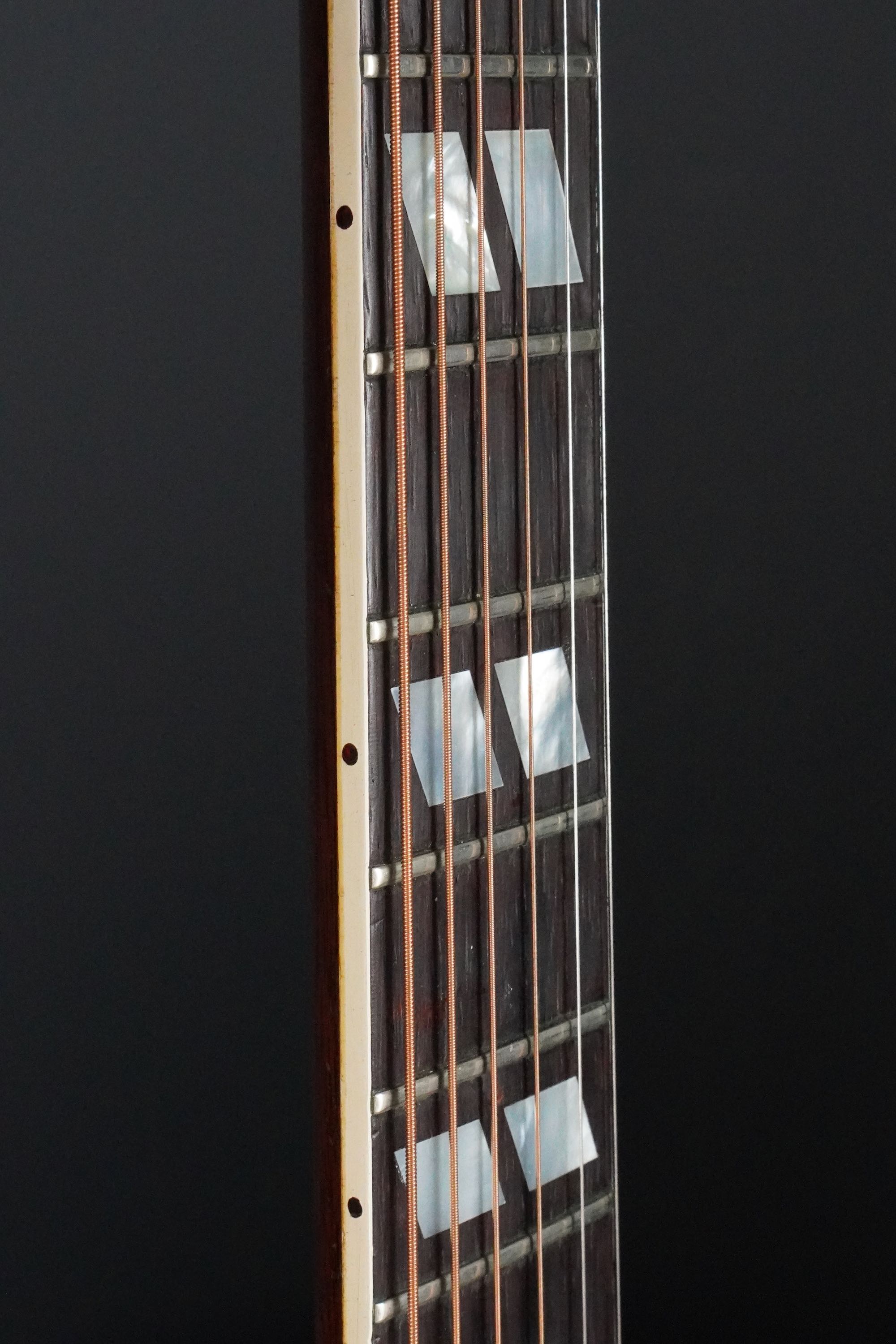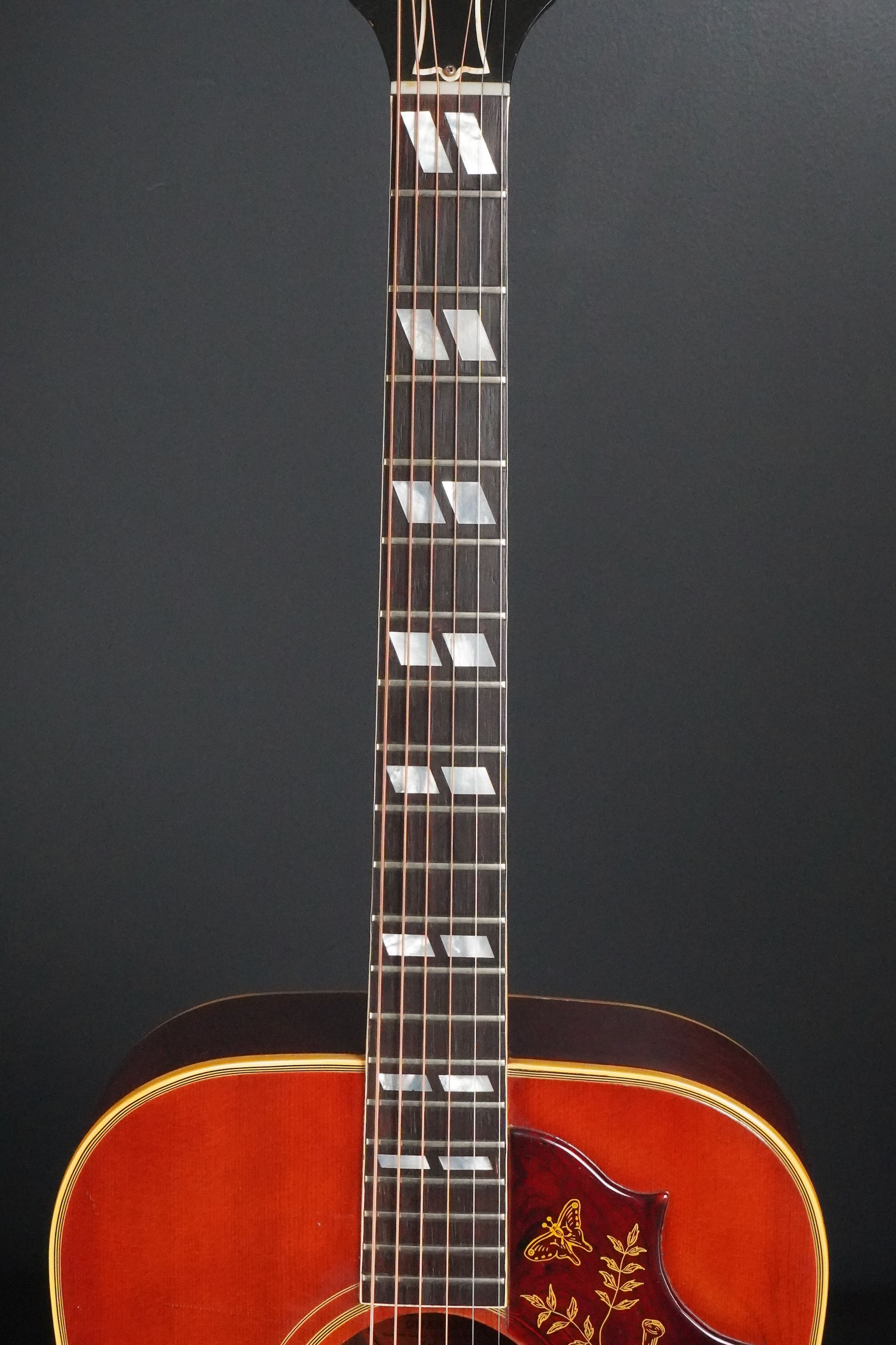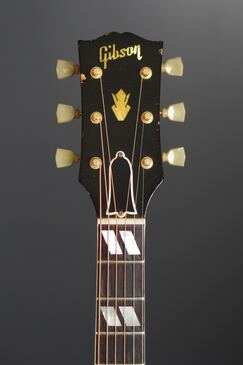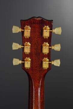ギブソンらしい黒いヘッドトップにはマザーオブパールのブランドロゴとクラウンインレイ、まだシングルラインでゴールドのクルーソンチューナーが搭載され、シンプルながらも高級感有るヘッドのデザイン、赤黒い上質なハカランダ指板にはホワイトパールのダブルパラレログラムインレイもよく映え、上品で質感の高い仕様になっております。