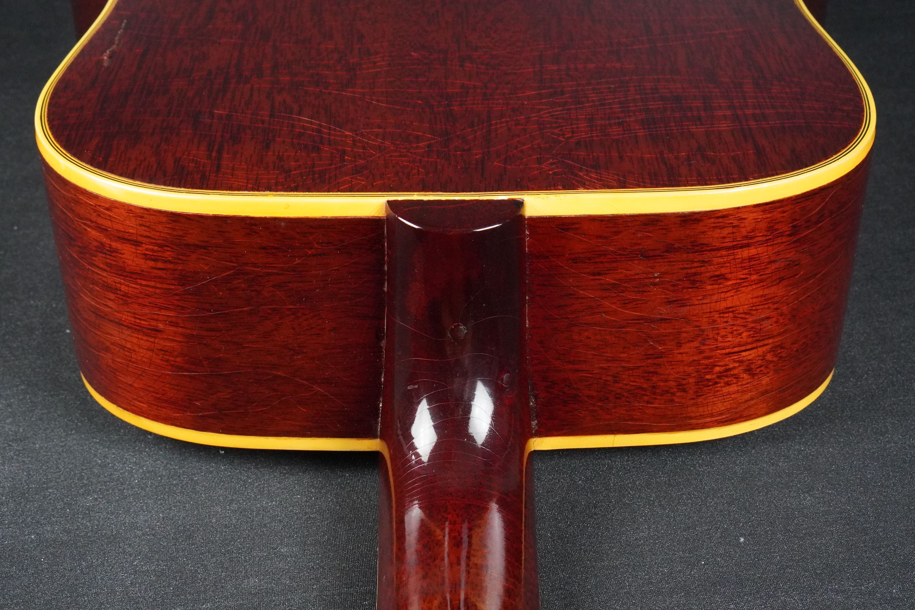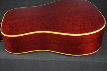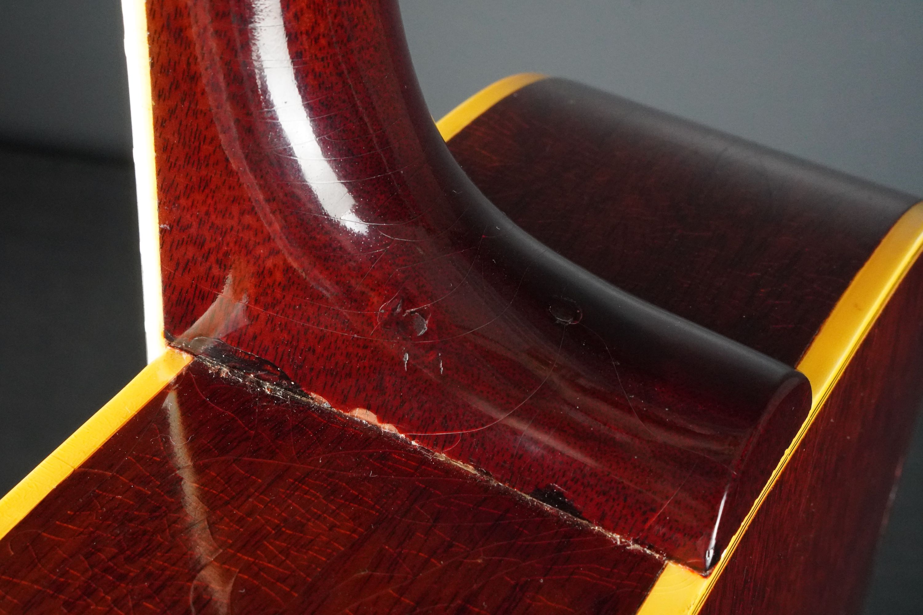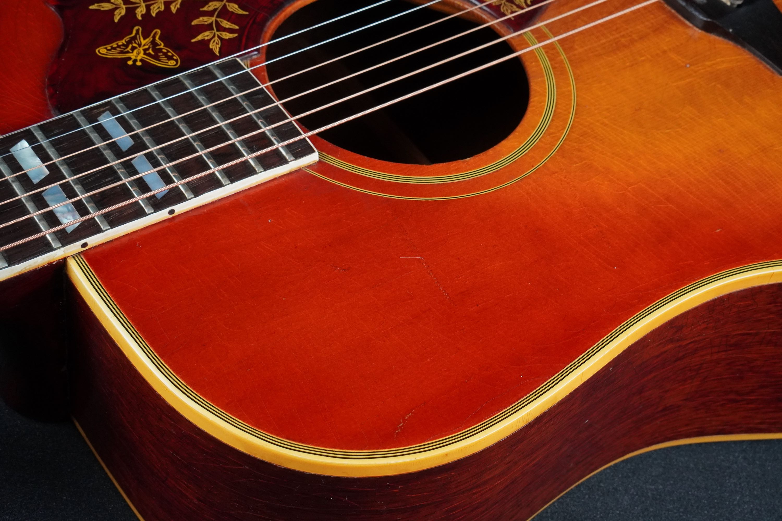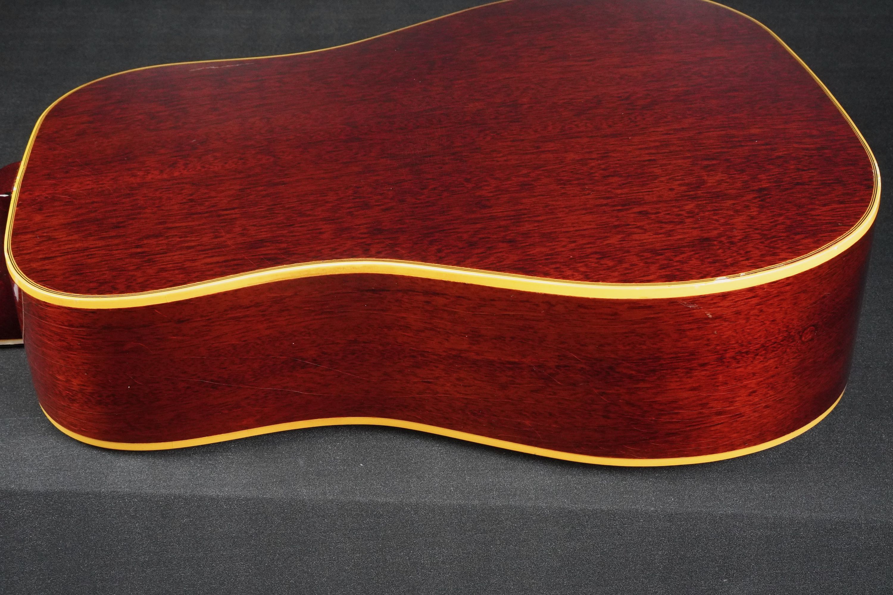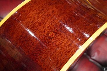 サイドやバック、ネックのマホガニーは、チェリーカラーが所々がフェードして微かに赤味が茶色っぽく見えるヴィンテージらしい風味を持ち、塗装の痩せや焼け具合、そこにウェザーチェックが走って、こちらも渋い雰囲気です。