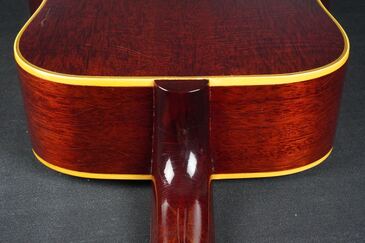 また、かなり以前にリセットされた跡がネックジョイント 部のタッチアップ跡で確認できたり、サイドのエンド横にアウトジャック穴埋め跡、ブリッジのローズウッド部にクラック修理跡、ネックヒールにストラップピンを取り付けた跡が二箇所など、色々と修理、調整しながら使われてきた個体かと思われます。