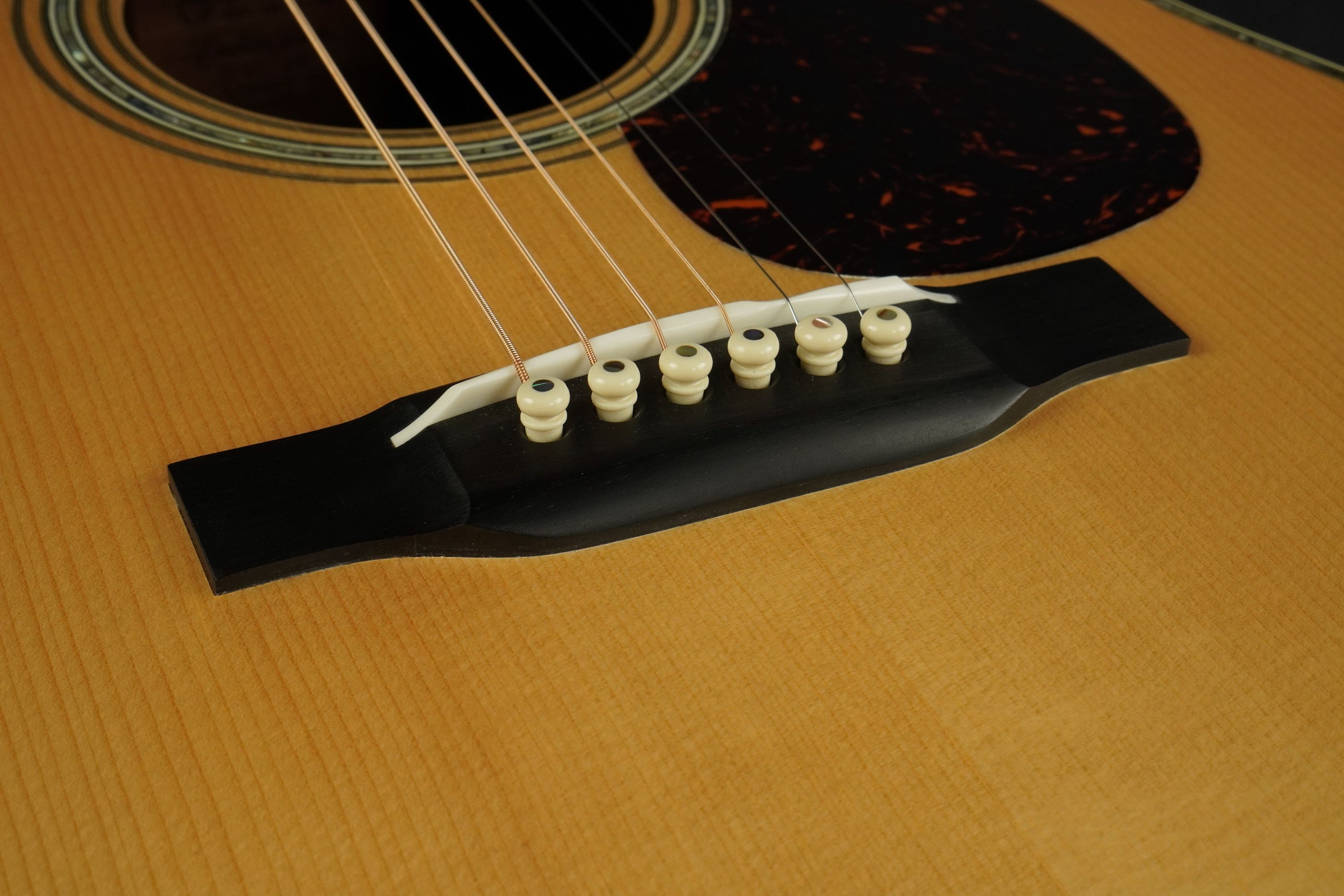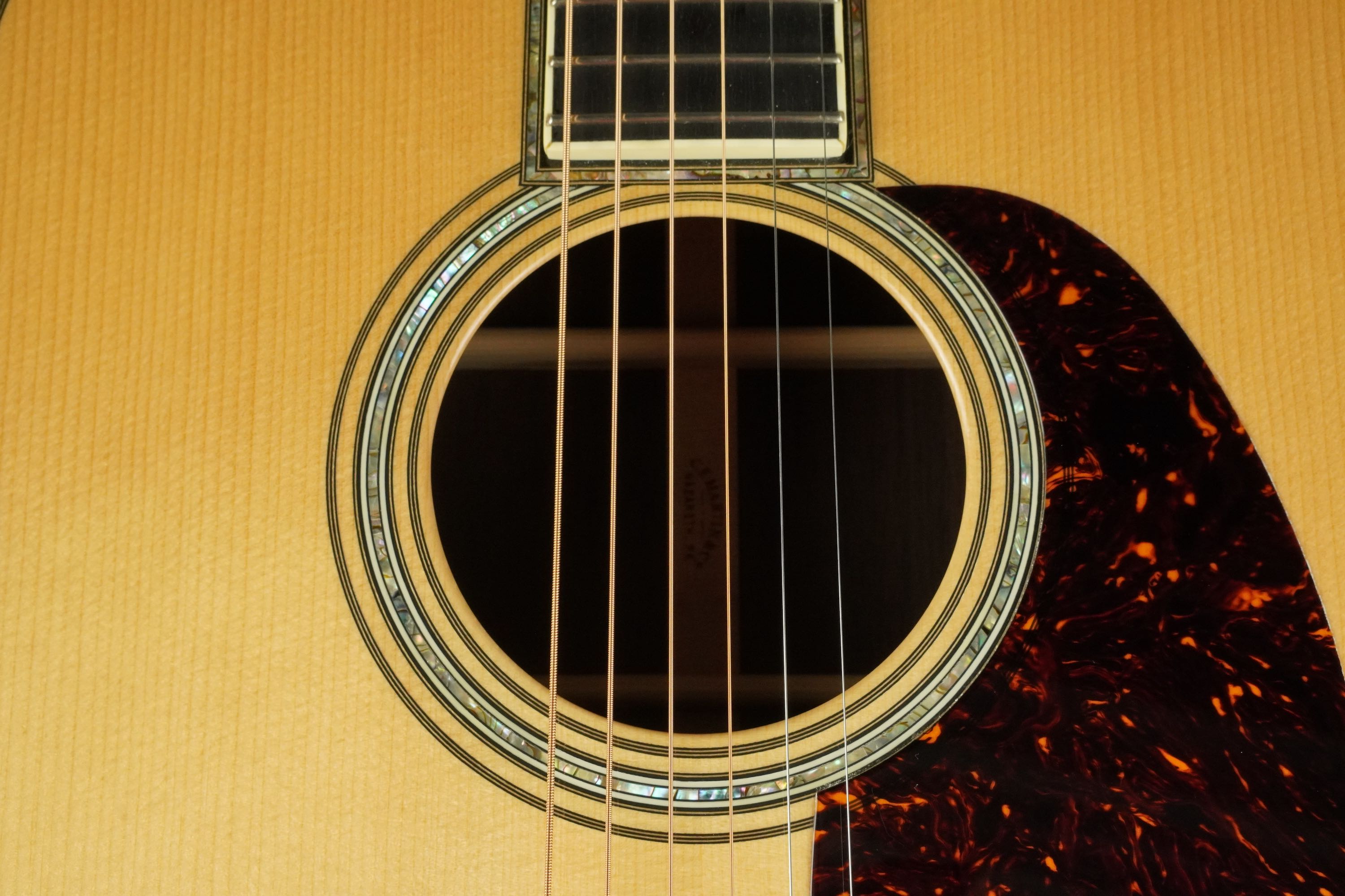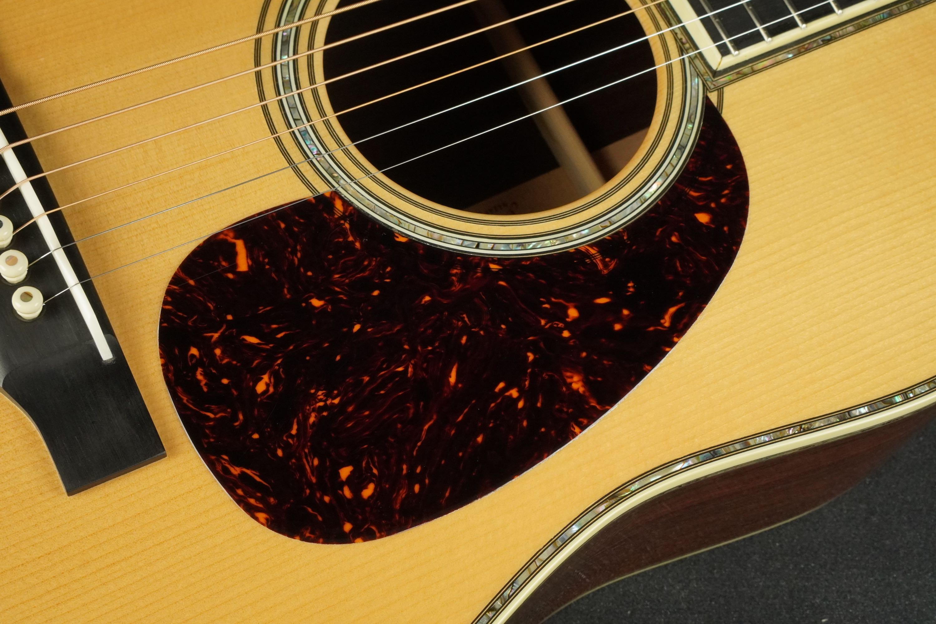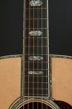 べっ甲柄のピックガードに、ロングサドル仕様のエボニーブリッジ、アヴァロンのボディトリムにアイヴォロイドのバインディングと、細かくこだわった渋い外観になっており、戦前のエレガントなデザインを再現しています。