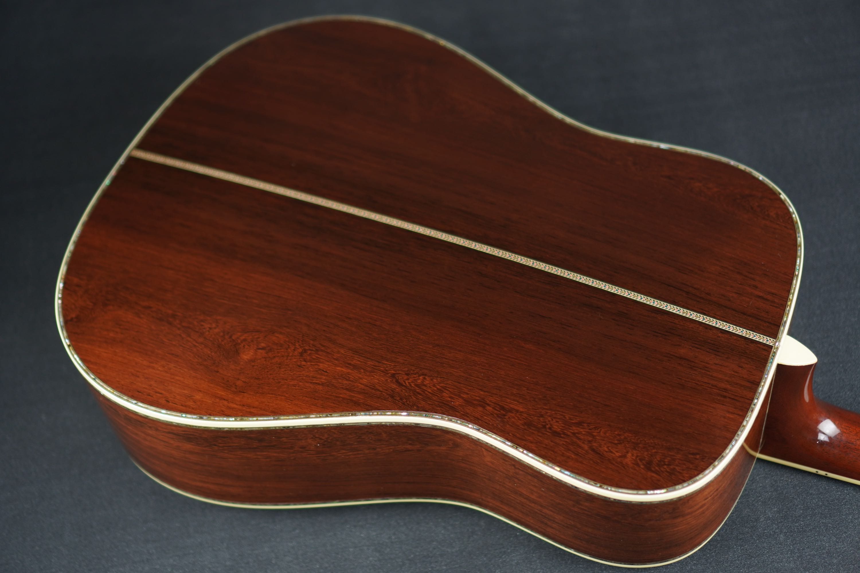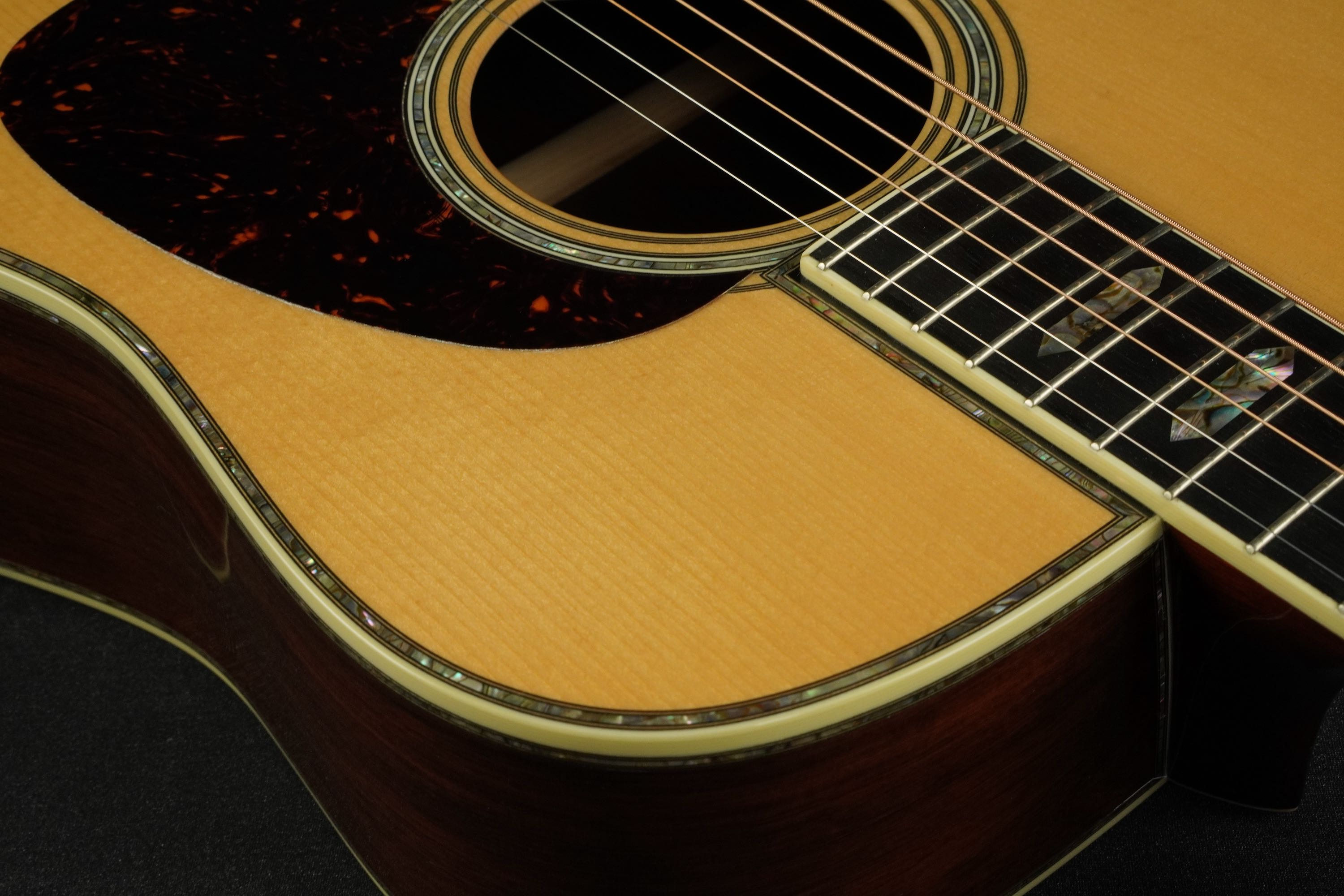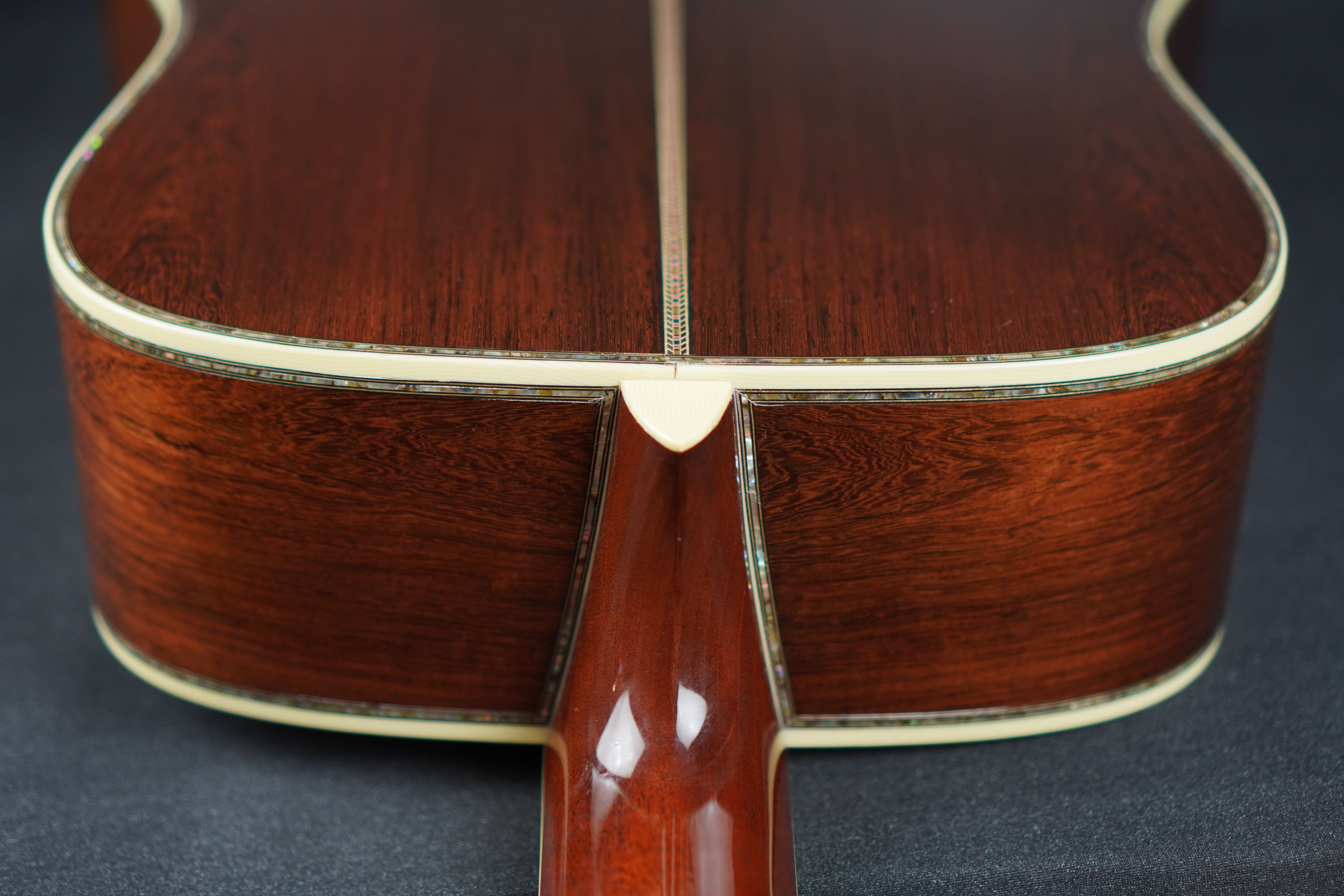 センター近くの整った木目から、特徴的な黒い縞模様の走ったサイドに向けてだんだんと暴れた、魅力的なルックスで、こちらも深い色合いのアヴァロンのトリムにアイヴォロイドのバインディング、45スタイルのカラフルなセンターストリップと、眺めていても飽きの来ないルックスです。
