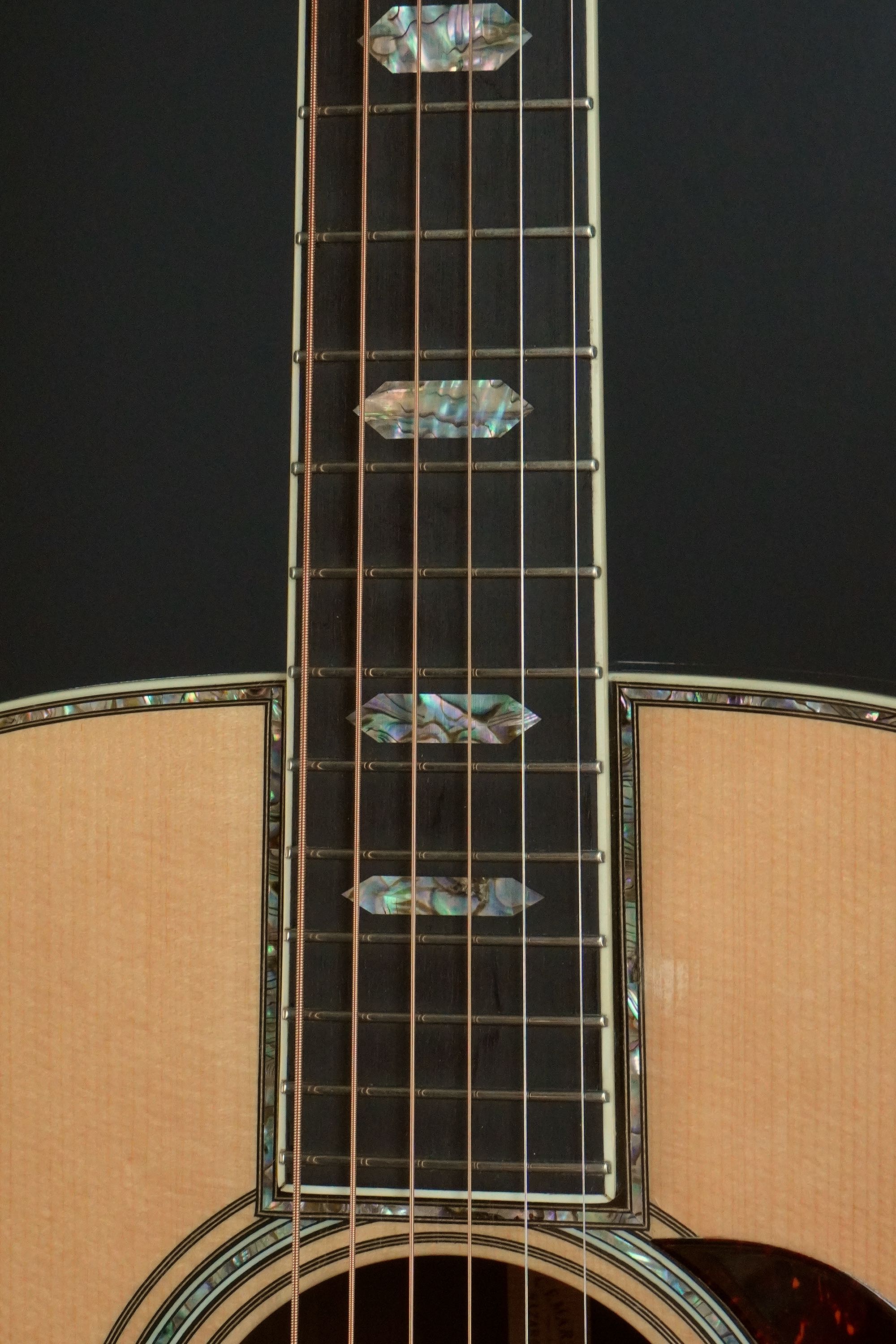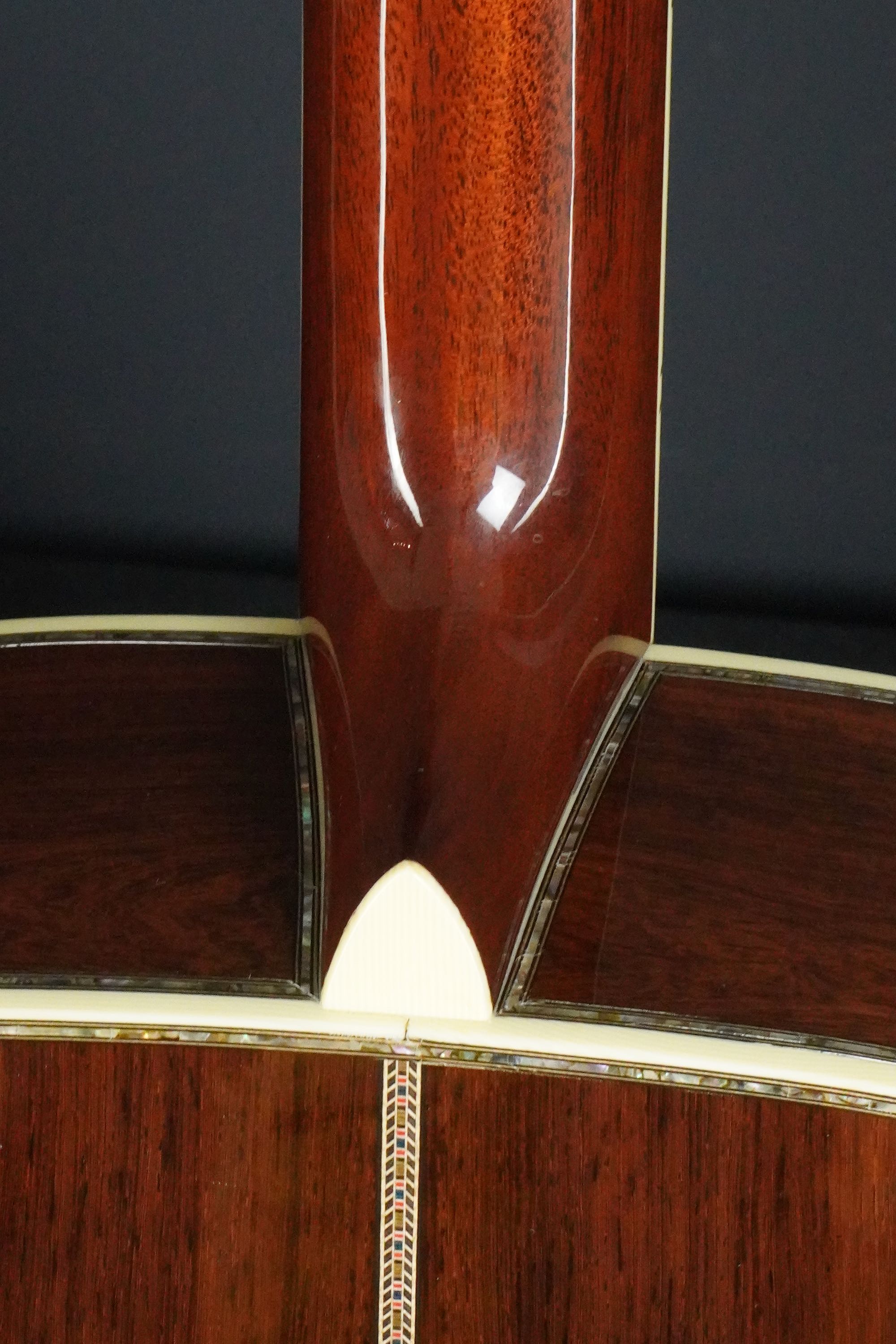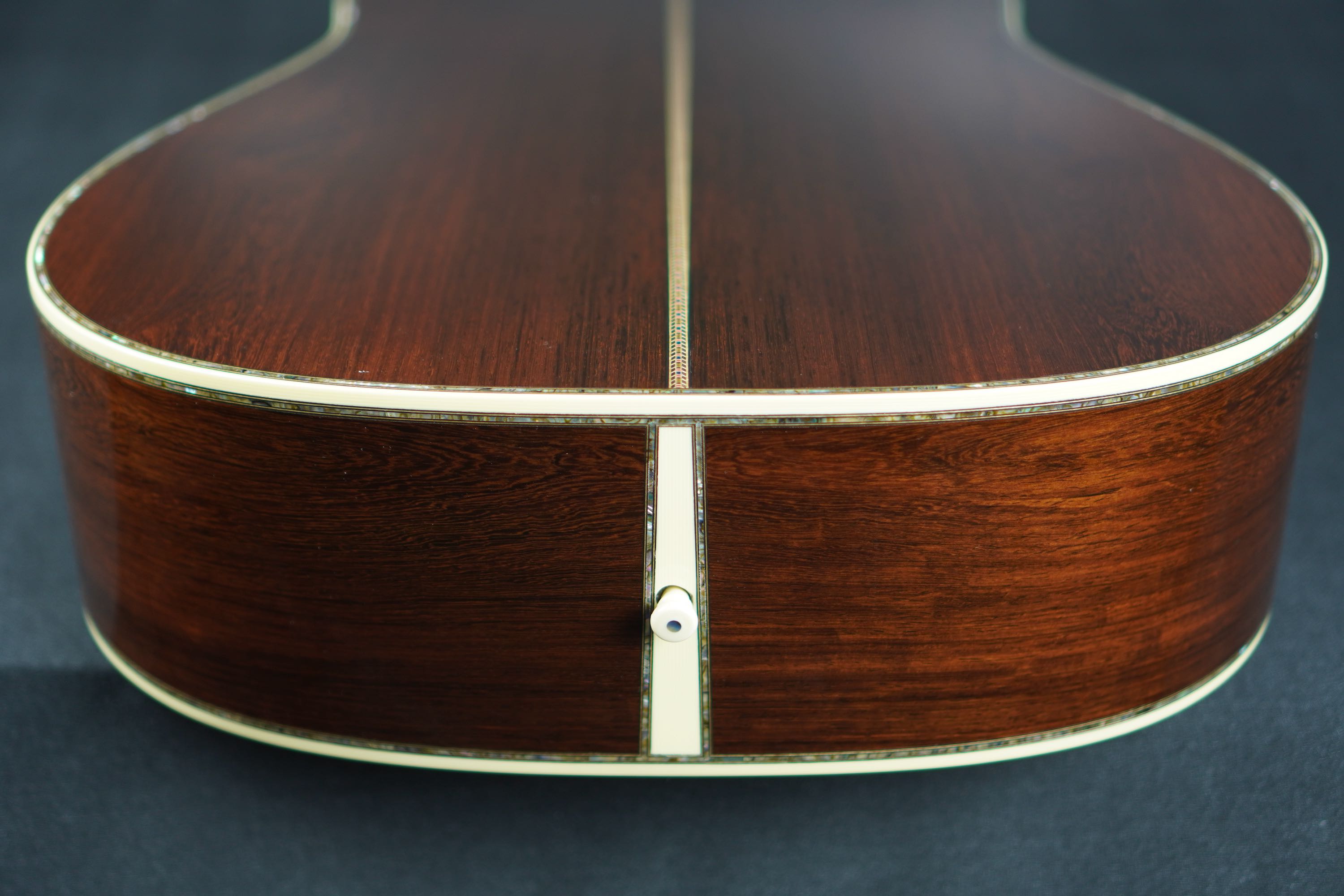 センター近くの整った木目から、特徴的な黒い縞模様の走ったサイドに向けてだんだんと暴れた、魅力的なルックスで、こちらも深い色合いのアヴァロンのトリムにアイヴォロイドのバインディング、45スタイルのカラフルなセンターストリップと、眺めていても飽きの来ないルックスです。