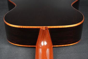 このサウンドは、サイド&バックのアフリカンブラックウッドがポイントになっていると思われ、黒々とした木肌とエキゾティックにうねる濃密な木目を持つ、かなり材密度の濃い木材が用いられ、この希少で上質なトーンウッドから濃密でウッディ、そして重厚な響きが奏でられますので、ボディの胴厚を薄くしてバランスを取っているのかと思います。