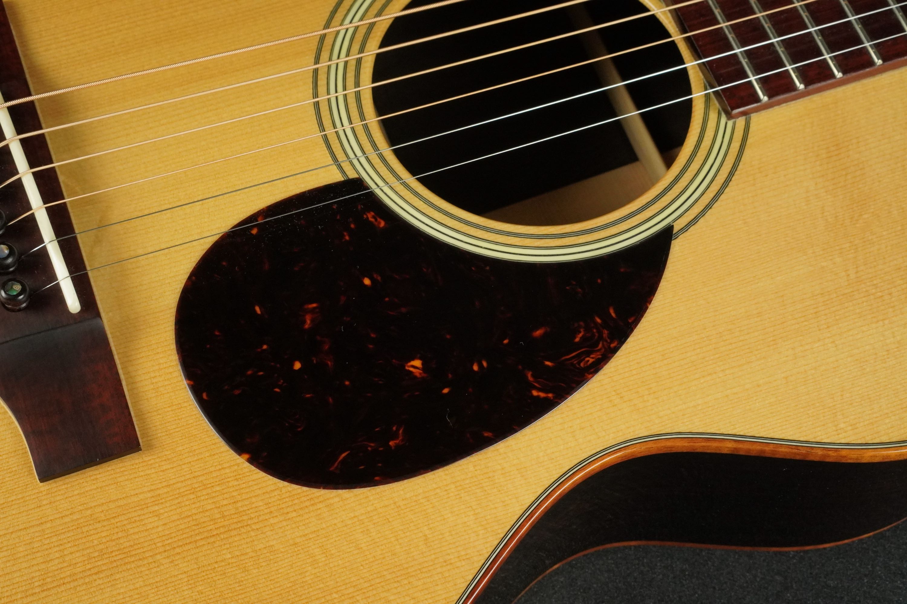 このように、抱え易いシンボディながらもパワー感は全くそこなっておらず、かつ通常のOMよりもレスポンスに優れたサウンド傾向を持つという、プレイヤーライクなギターという辺りが面白いモデルで、更に指板やブリッジに珍しいスネークウッドを用いたり、バインディングには美しい杢の出たハワイアンコアを惜しげもなく採用し、贅沢なスペックながらもウッディで艶やかな渋い風合いを纏ったルックスも秀逸です。