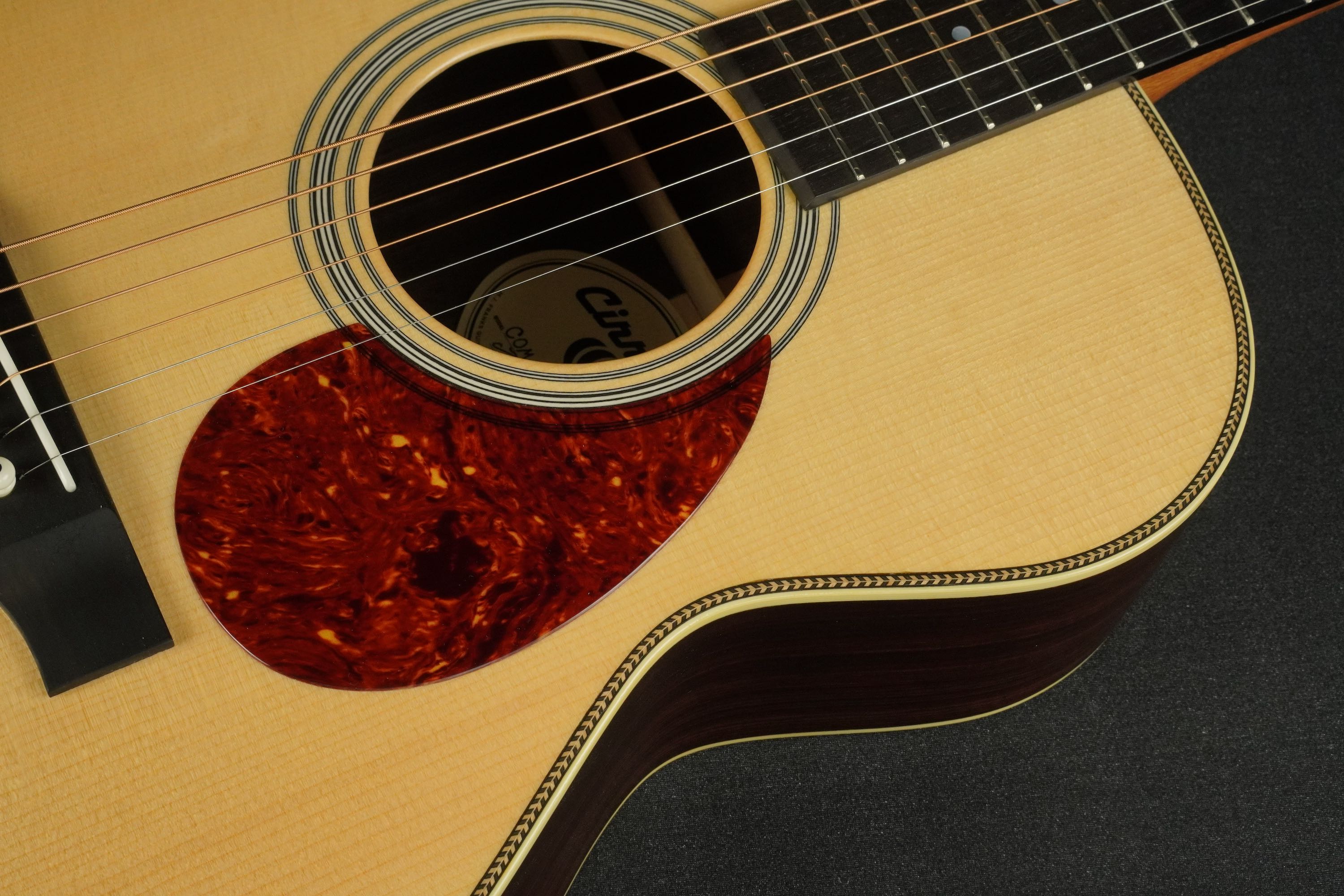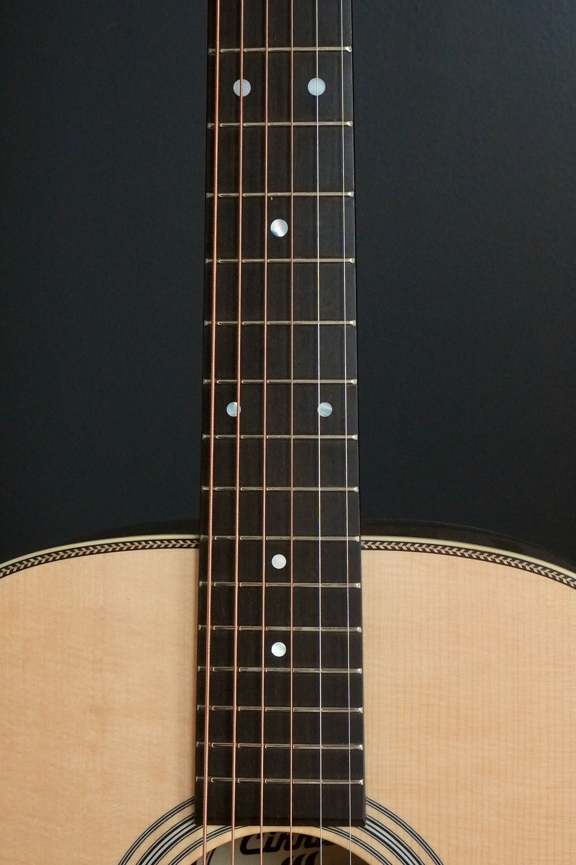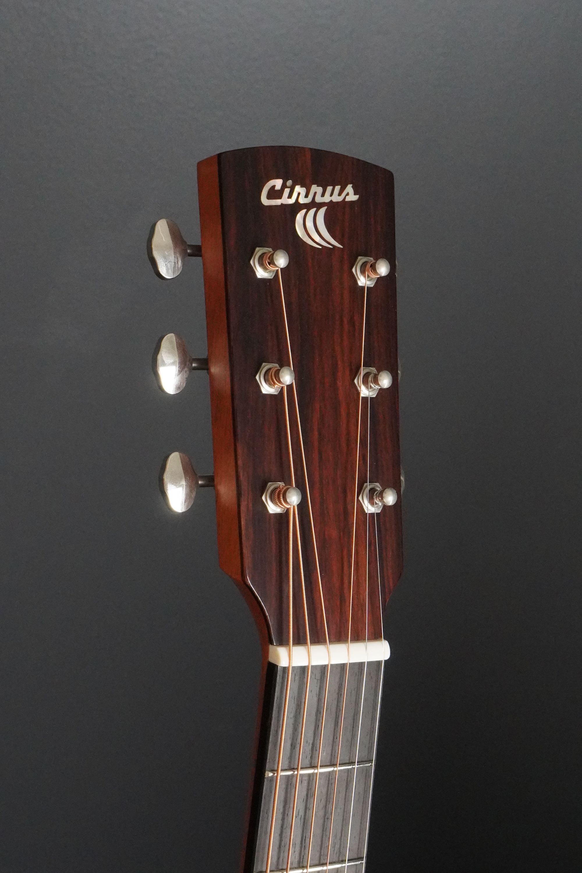 ナチュラルな自然の木目が活かされたヘッドに、Cirrusのスクリプトロゴ。マザーオブパールのインレイが輝きます。