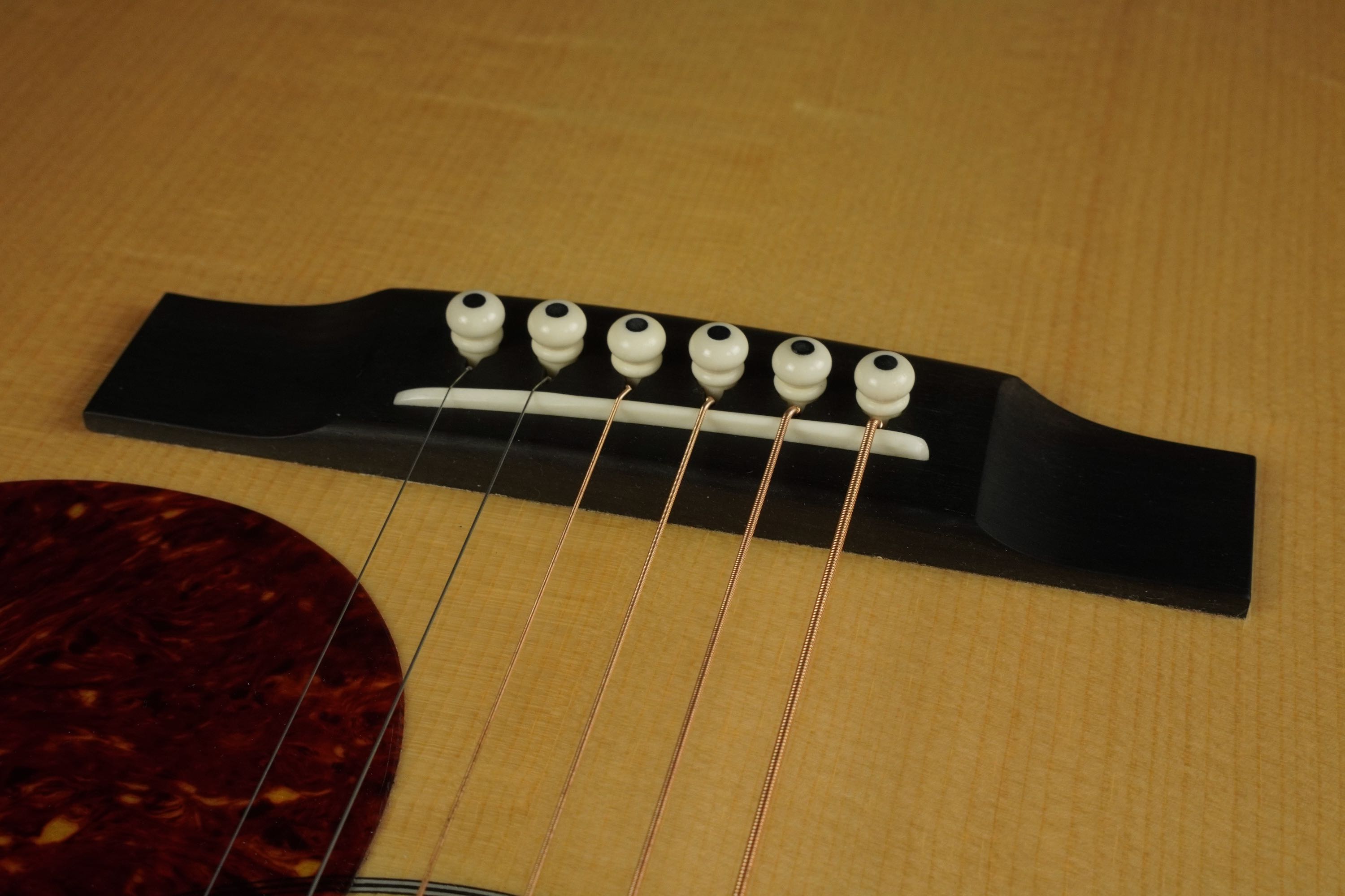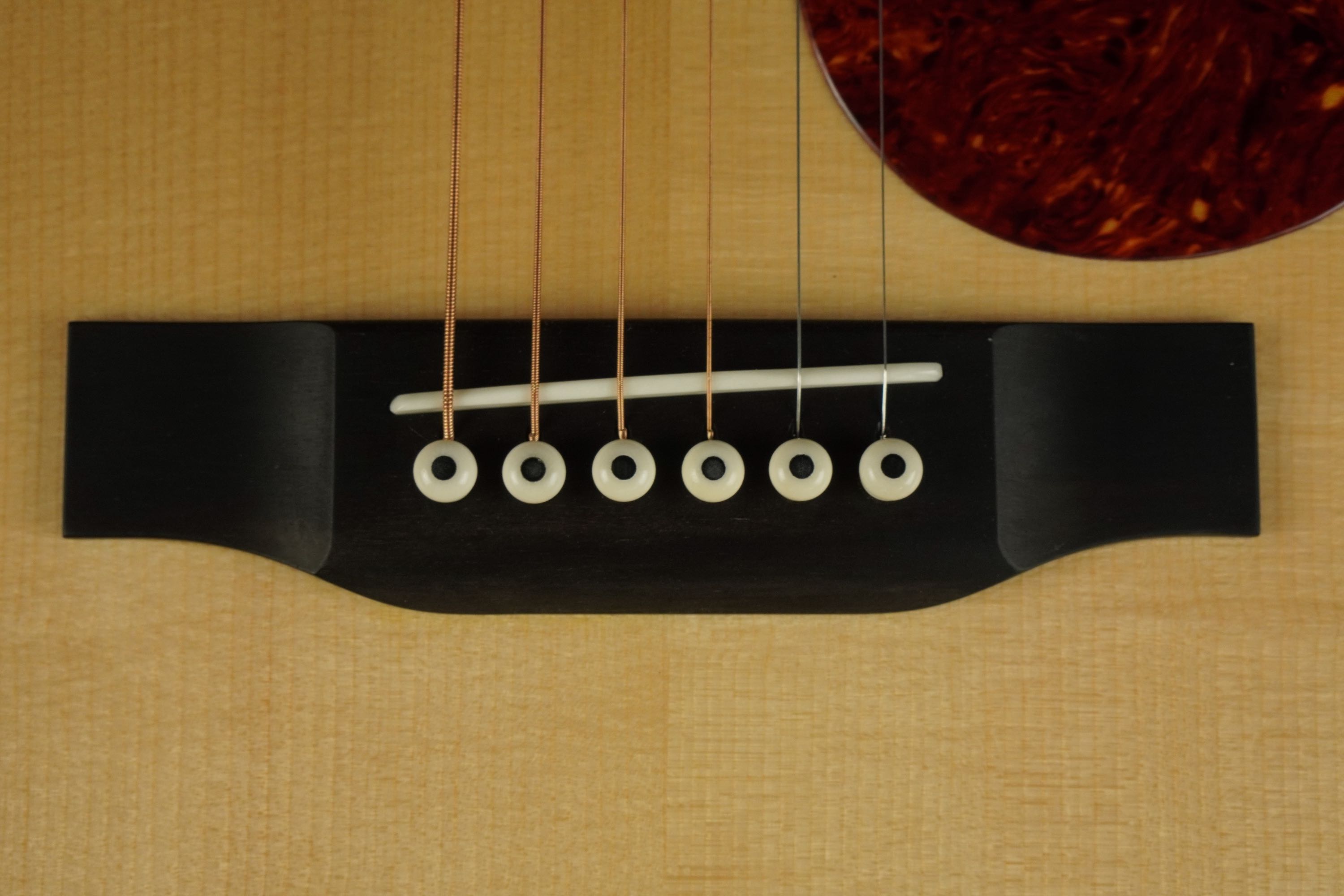 ブリッジは、ショートサドルで、ボーンのブリッジピン。ナットサドルも、Aged Boneが使われています。