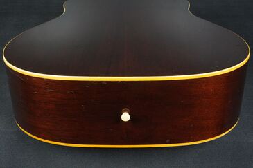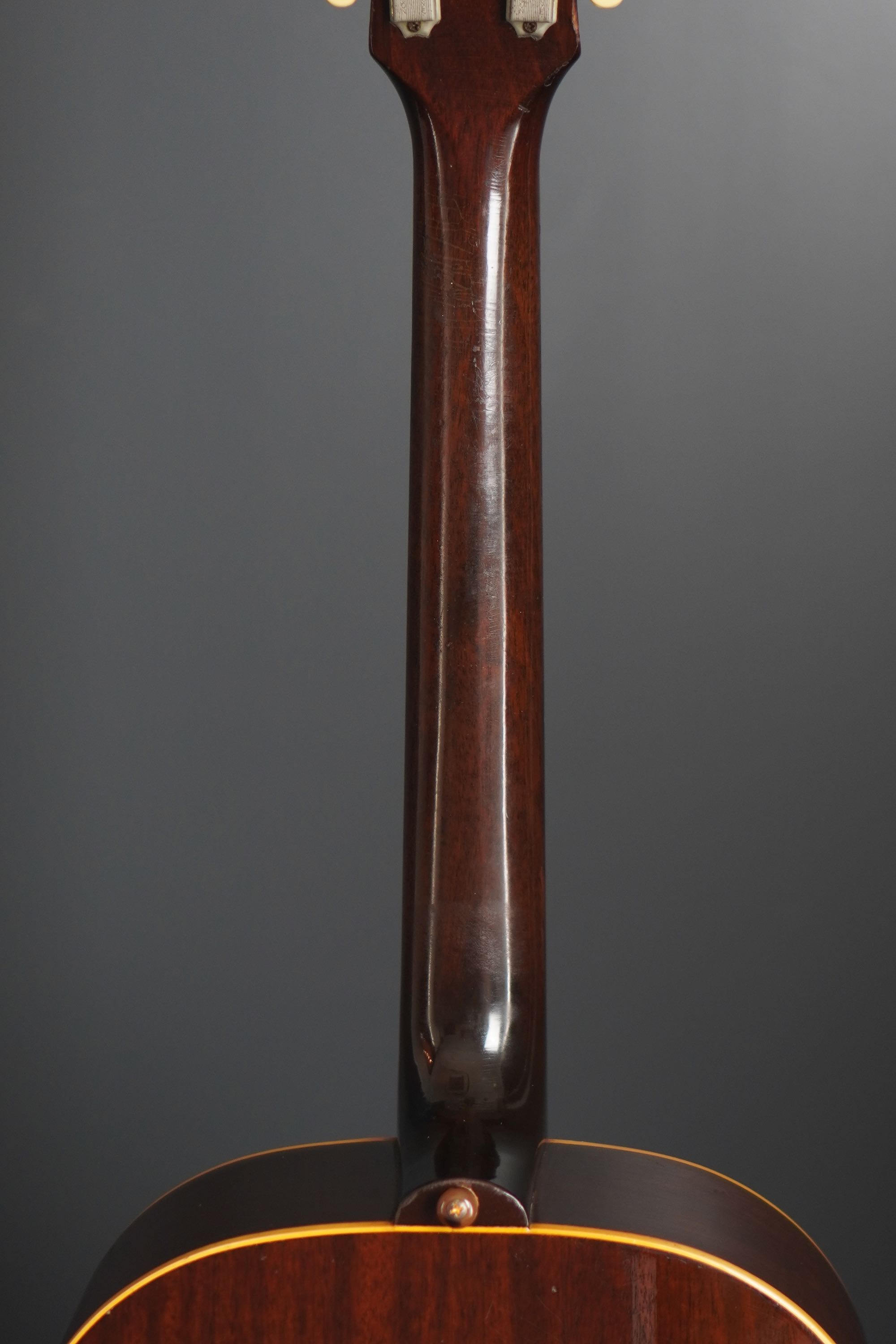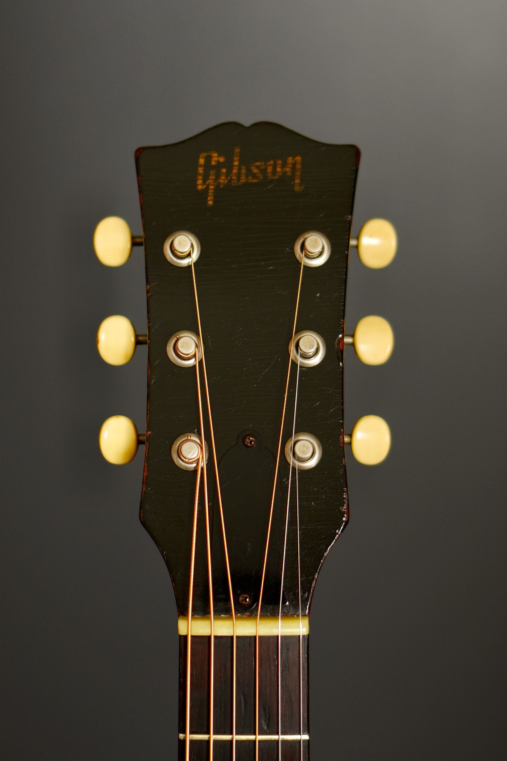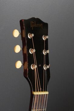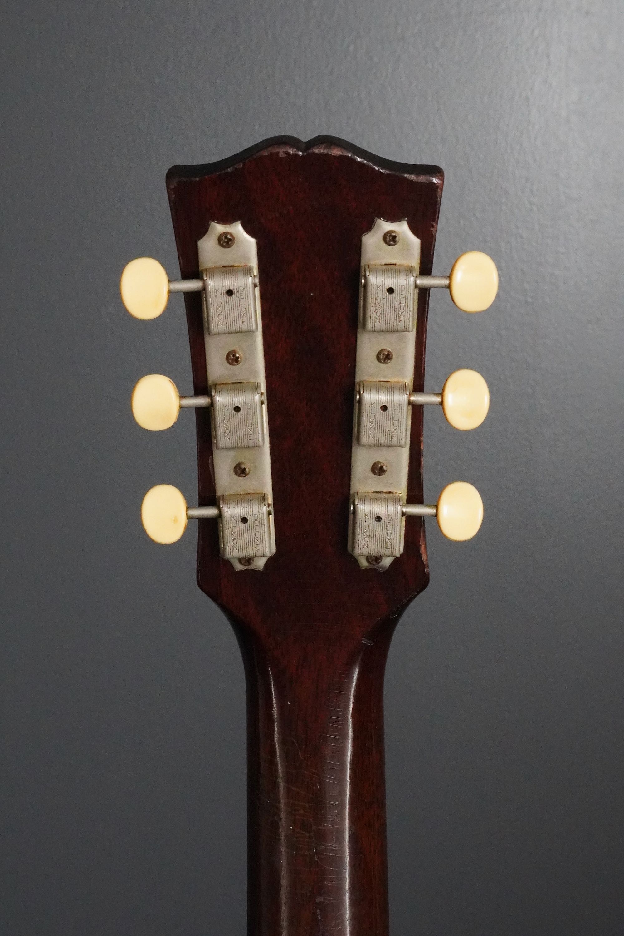 シンプルな黒いヘッドトップにギブソンのゴールドロゴ、クルーソンのペグは少し後の年代のダブルラインのタイプに交、換され素朴な形状のネックヒールにはストラップピンの取付があります。