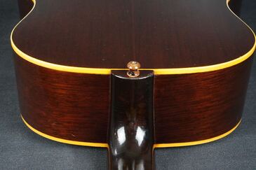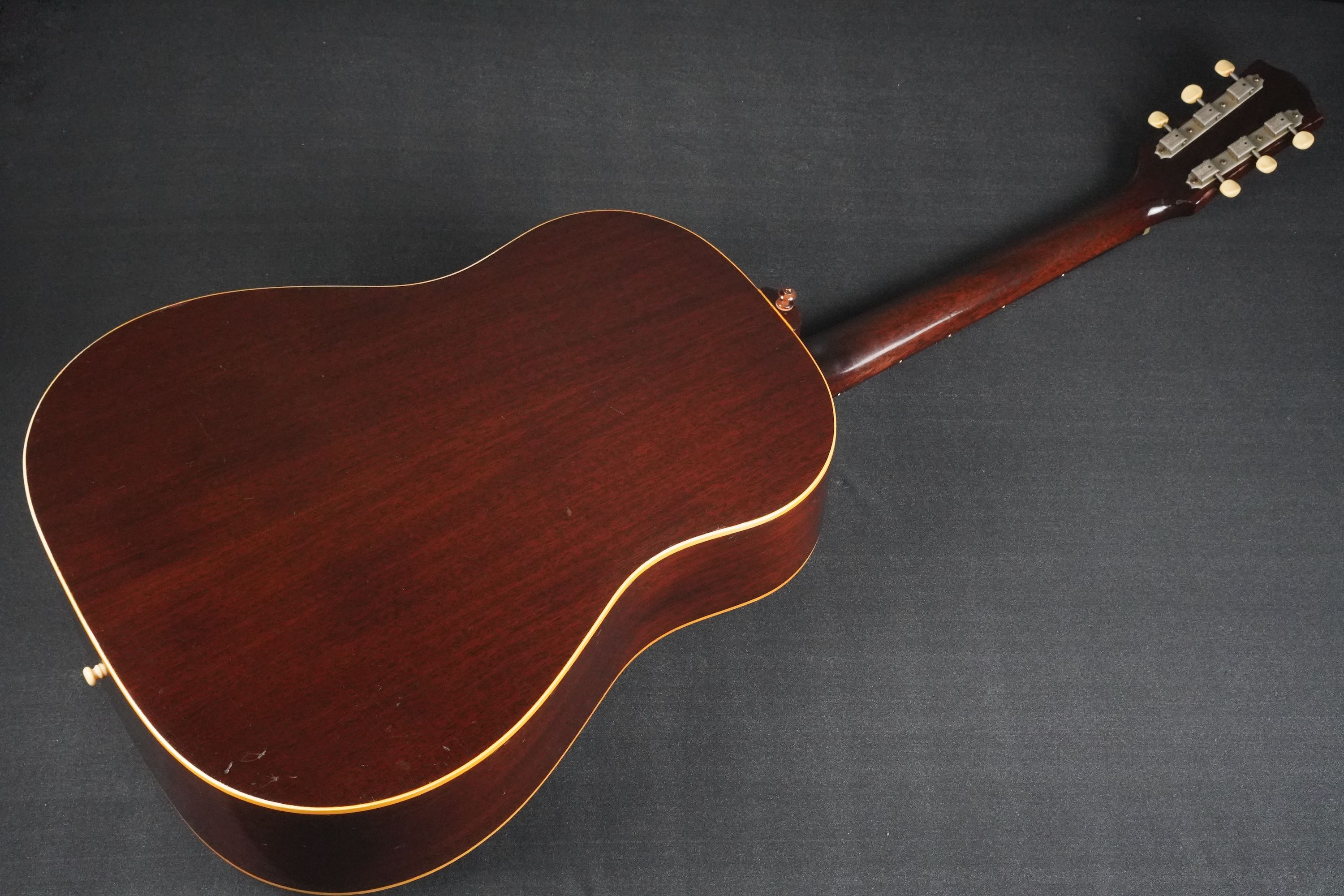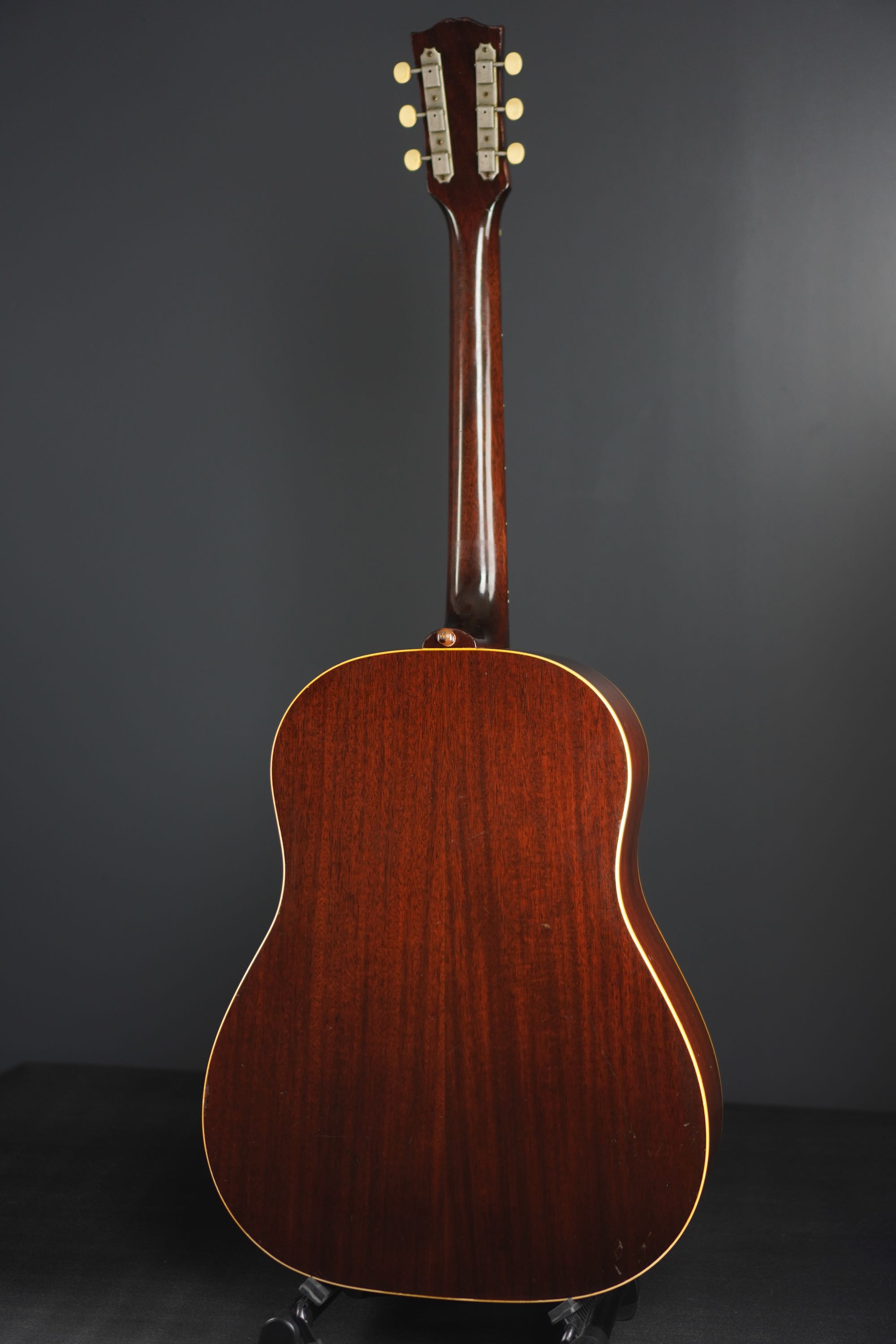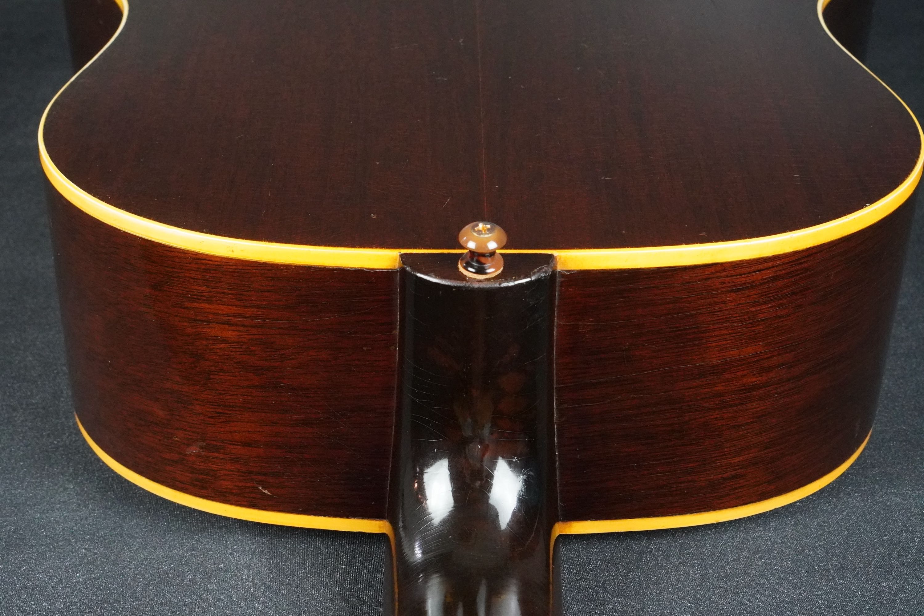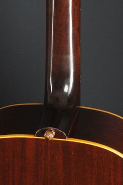 シンプルな黒いヘッドトップにギブソンのゴールドロゴ、クルーソンのペグは少し後の年代のダブルラインのタイプに交、換され素朴な形状のネックヒールにはストラップピンの取付があります。