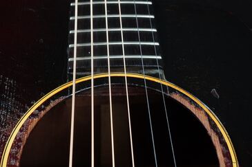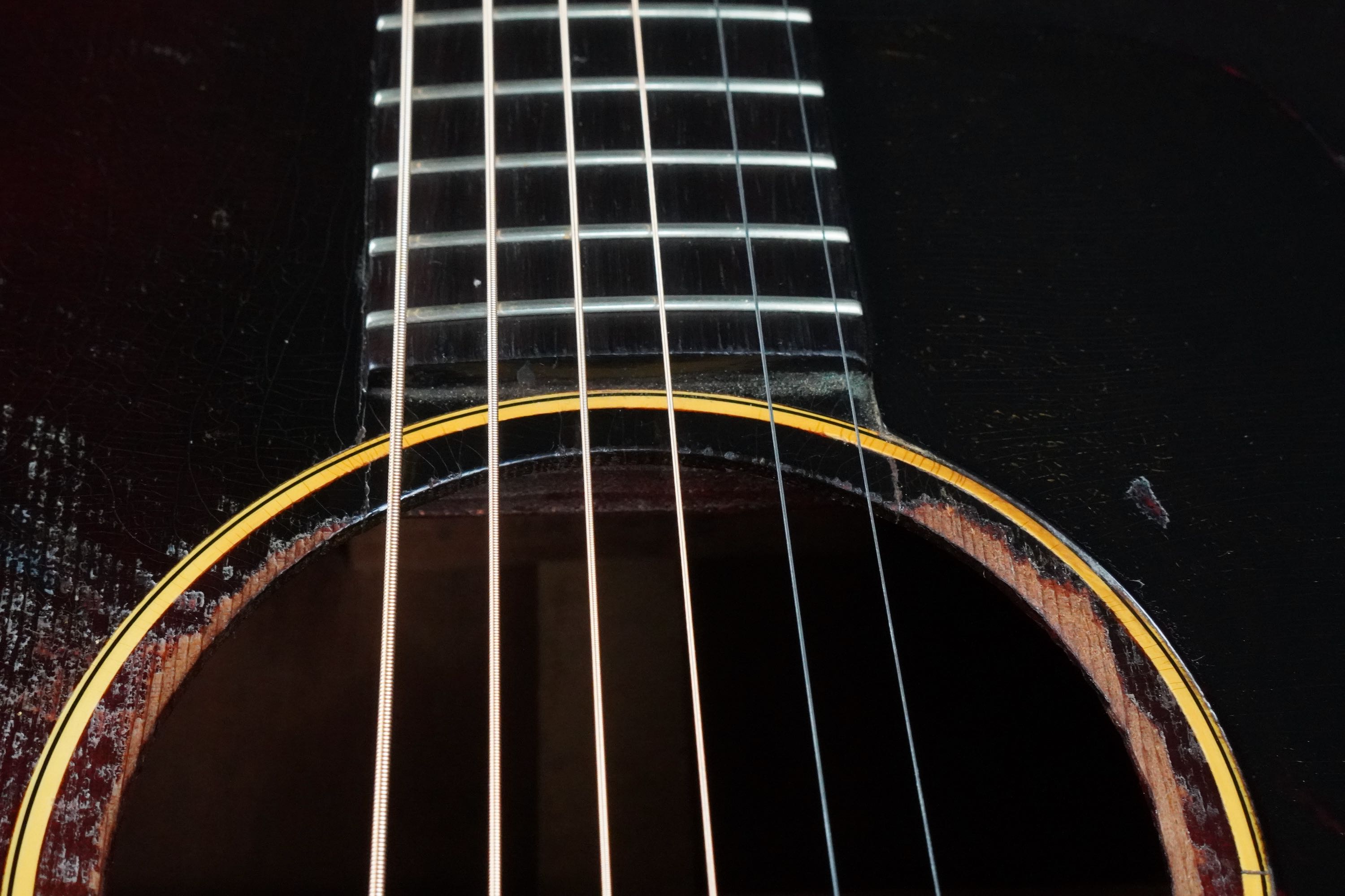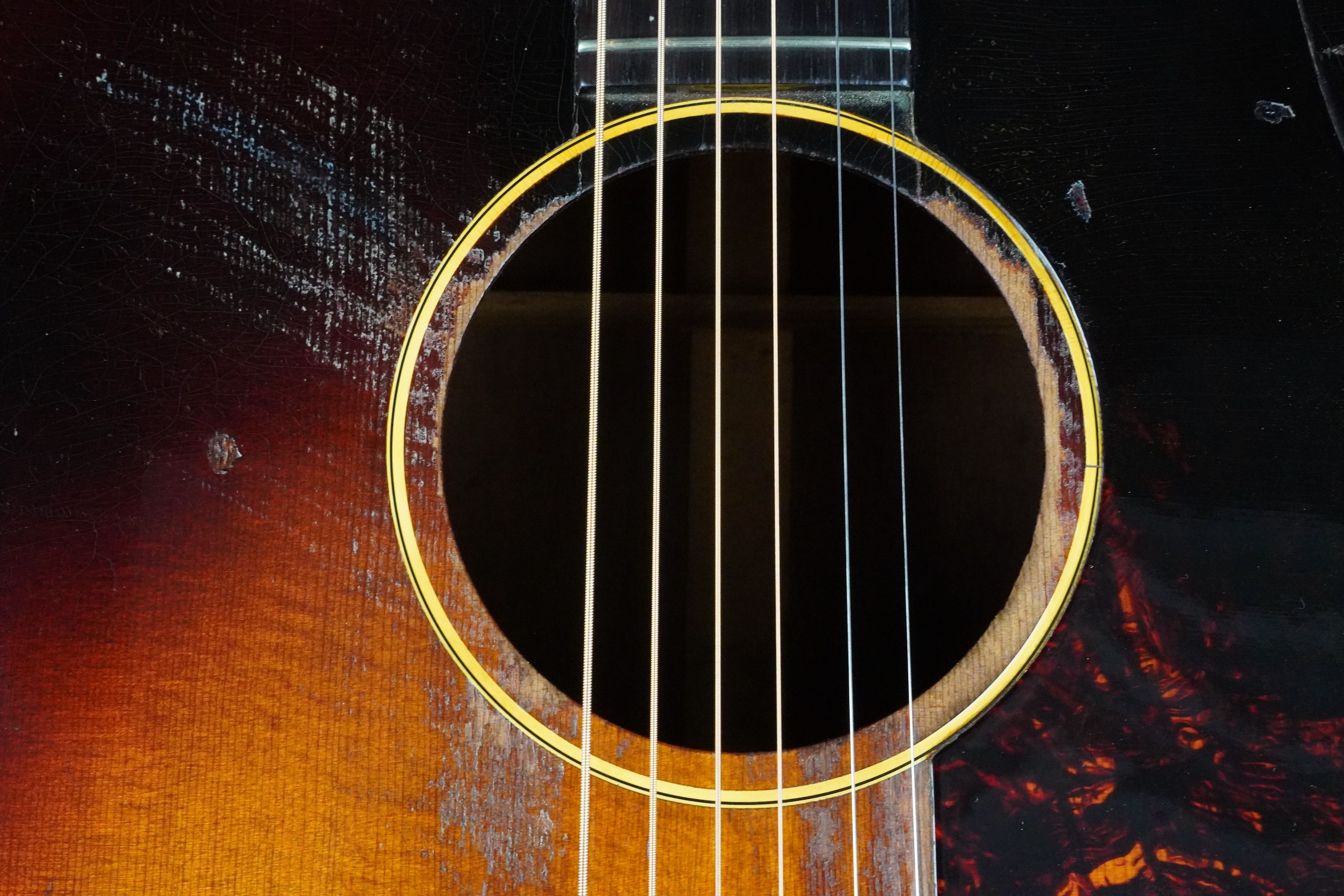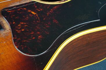 黄色く色焼けたバインディング、こちらも渋い色味となったワンリングのロゼッタに鼈甲柄の薄く大きなサイズのピックガード、このピックガードの縁が若干浮いておりますが、ピックガード周辺に軽くフェザークラックが出ておりますので、あえてそのままの状態としております。