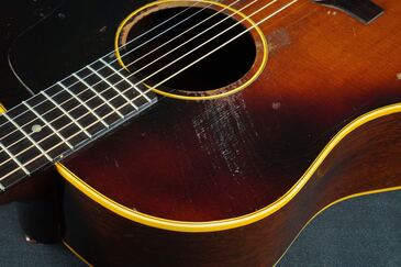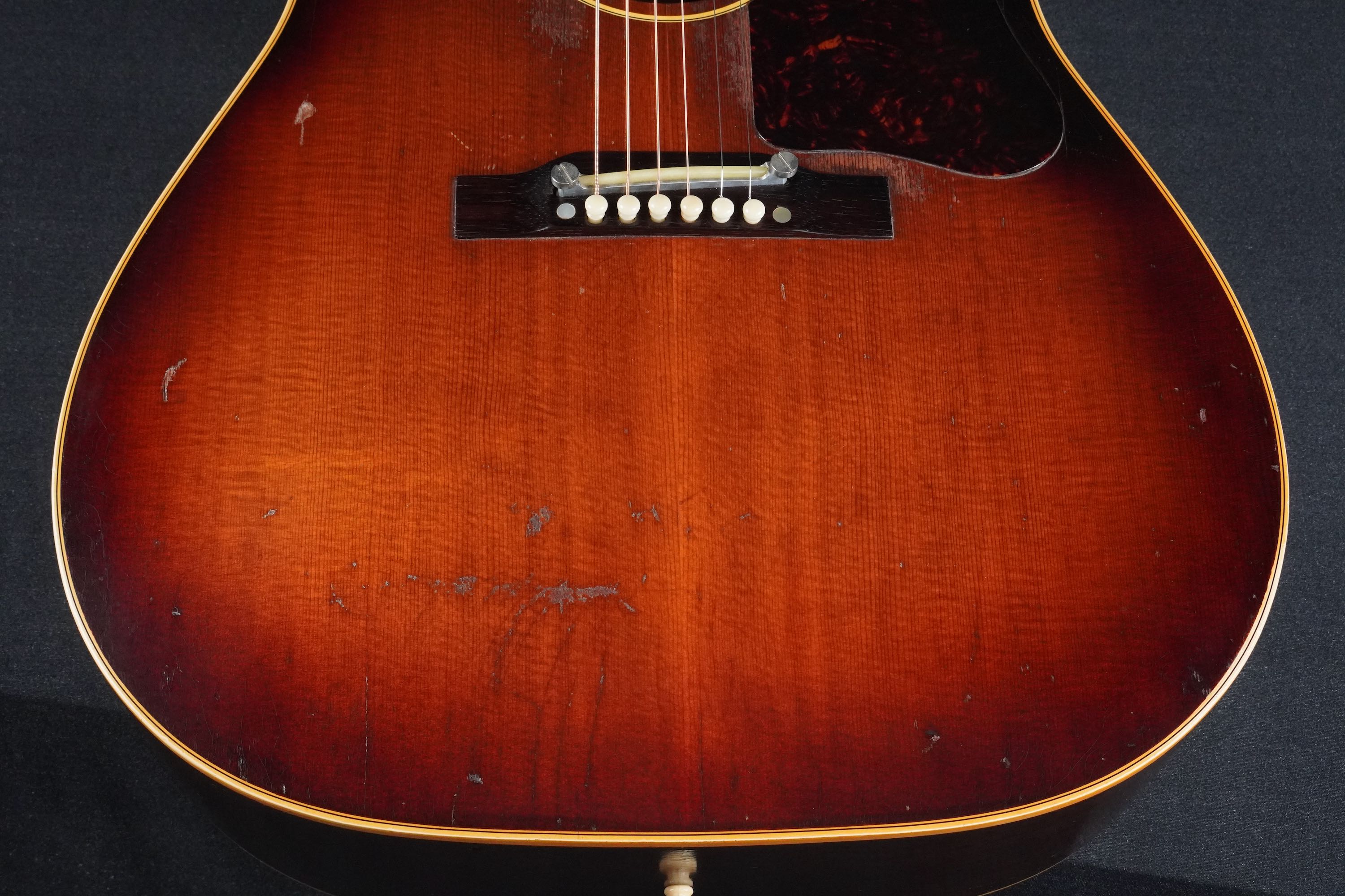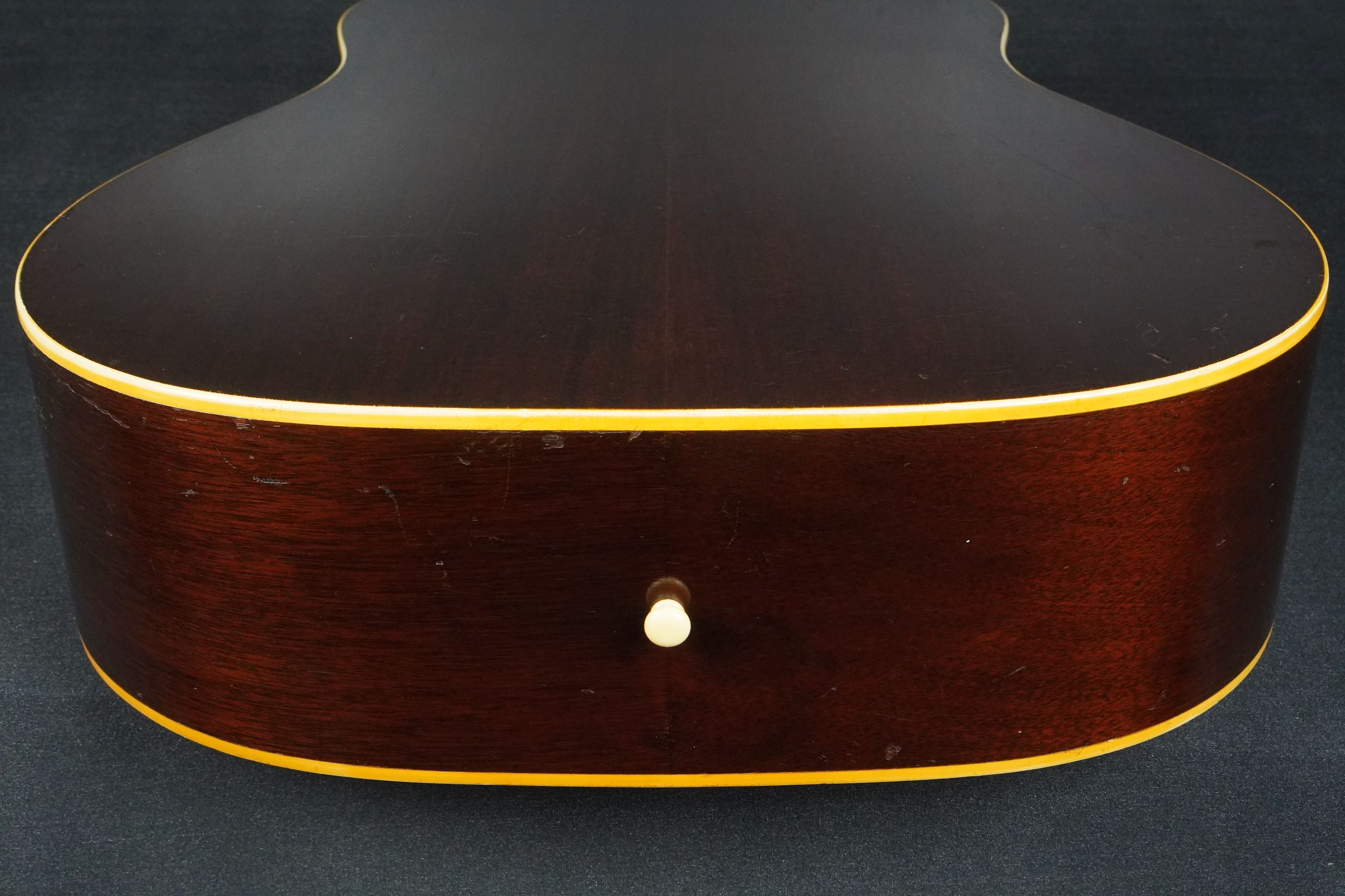バーストのカラーは、外周の濃いブラウンがかなり色痩せして木目が透けて見えるようになっており、中心の黄色味もこの時期のバーストとしては色濃く焼けておりますので、50年代後期としては、かなり渋い色合いのサンバーストになっております。