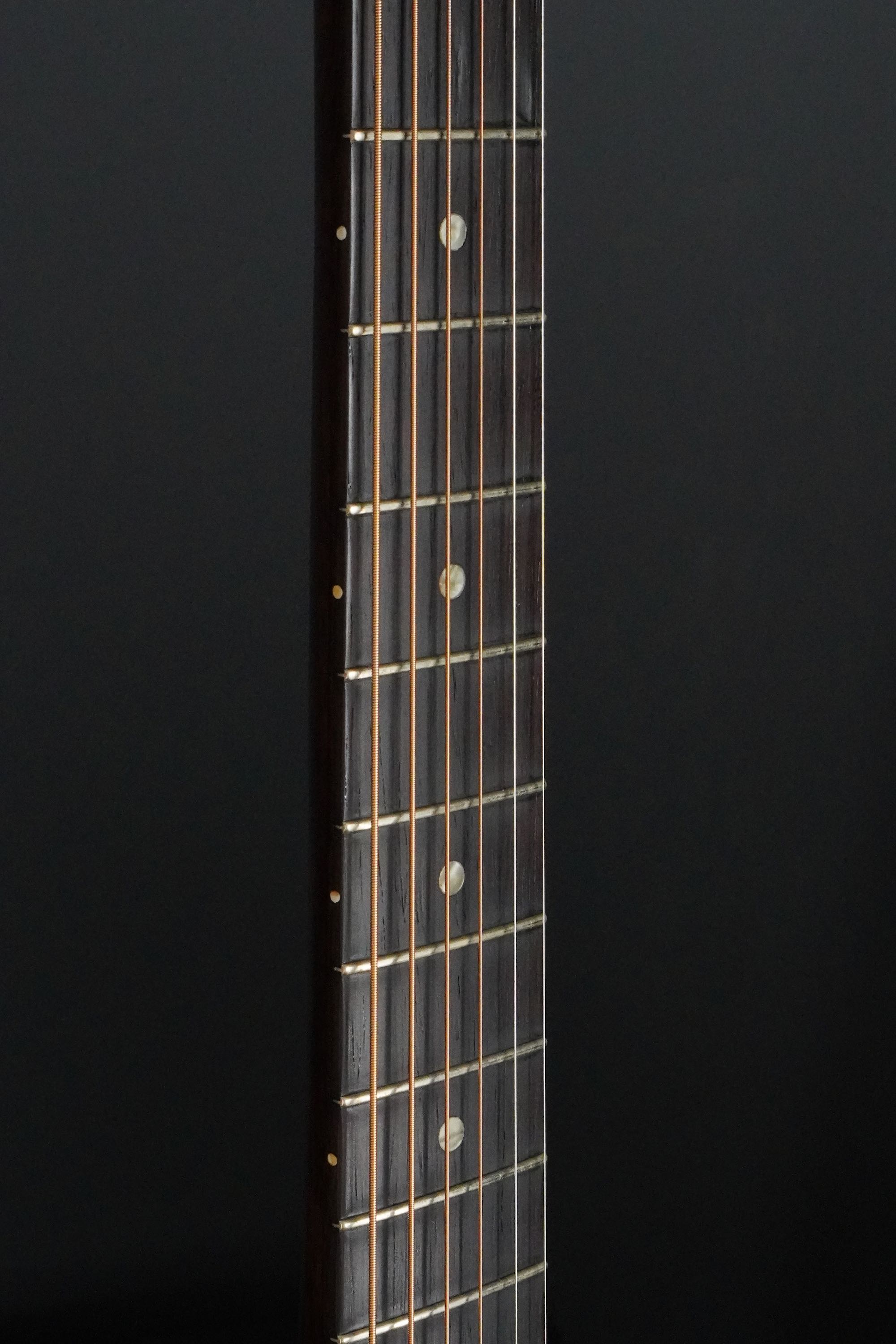 指板のローズウッドは、ダークな濃い色味の良材が使われ、シンプルなドットのポジションマークがひっそり収まります。