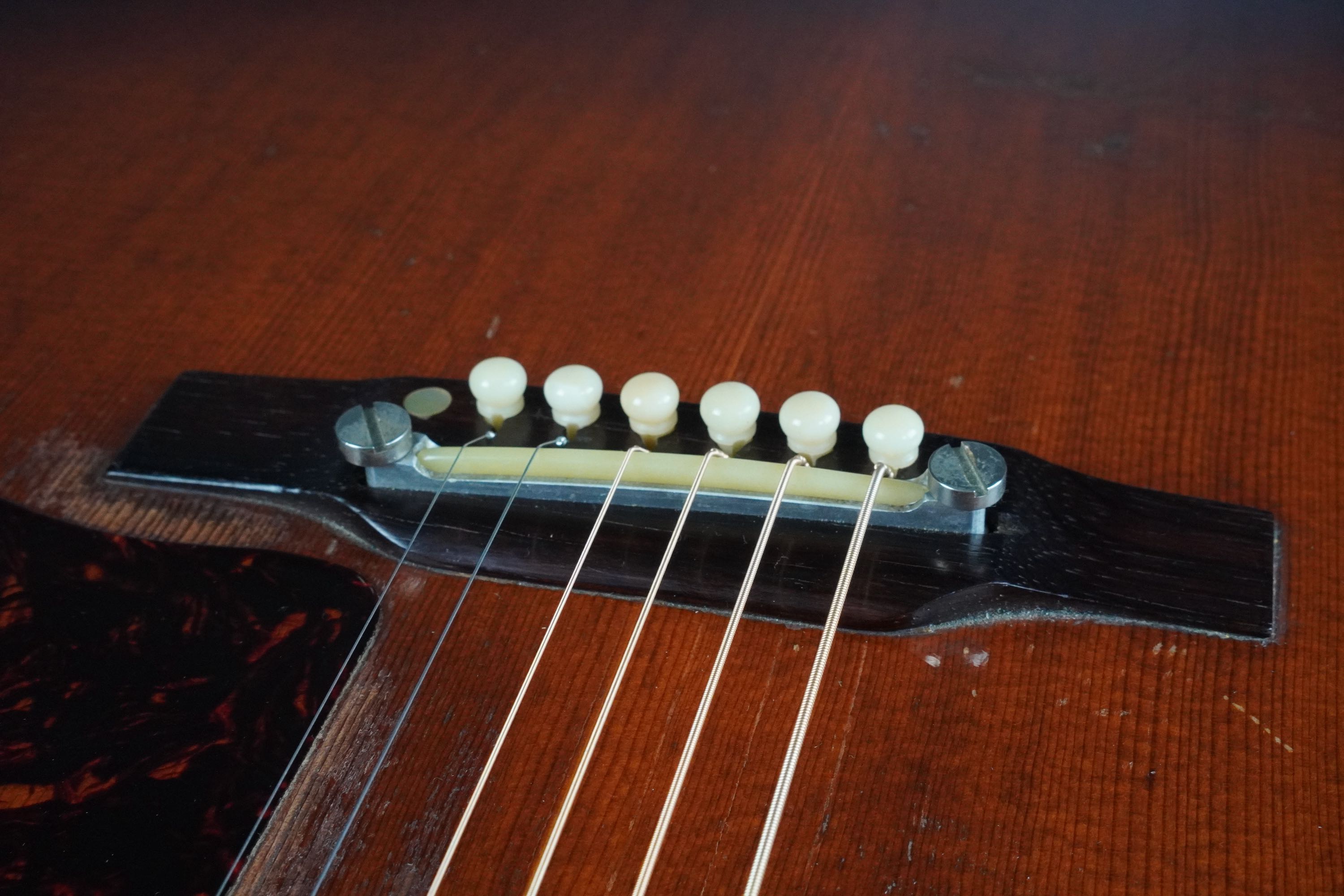 そのアジャスタブルブリッジの最初期は、ブリッジの両脇に大きな弦高調整用のダイアルノブが有る独特なスタイルでしたが、すぐに本機のようなアルミ土台の金属製のアジャスタブルブリッジとなり、そしてすぐ後に、50年代後半によく見られる、真っ白なセラミックサドルにデカネジの仕様になります。