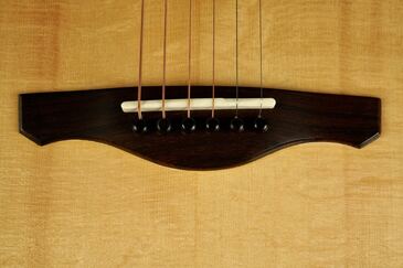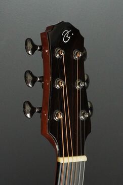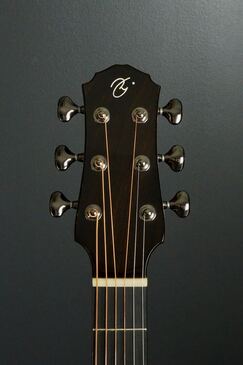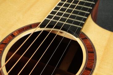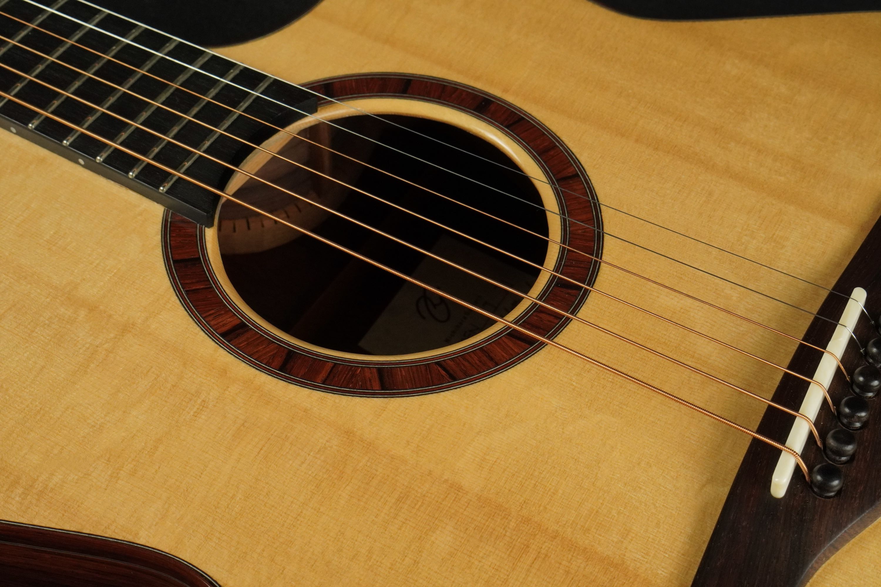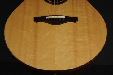 この美しいスプルースにウッドリングのロゼッタ、細かく木材を組み合わせた丁重な造りで、同じくウッドのボディバインディングと共に、ウッディな質感で雰囲気よく仕上げています。