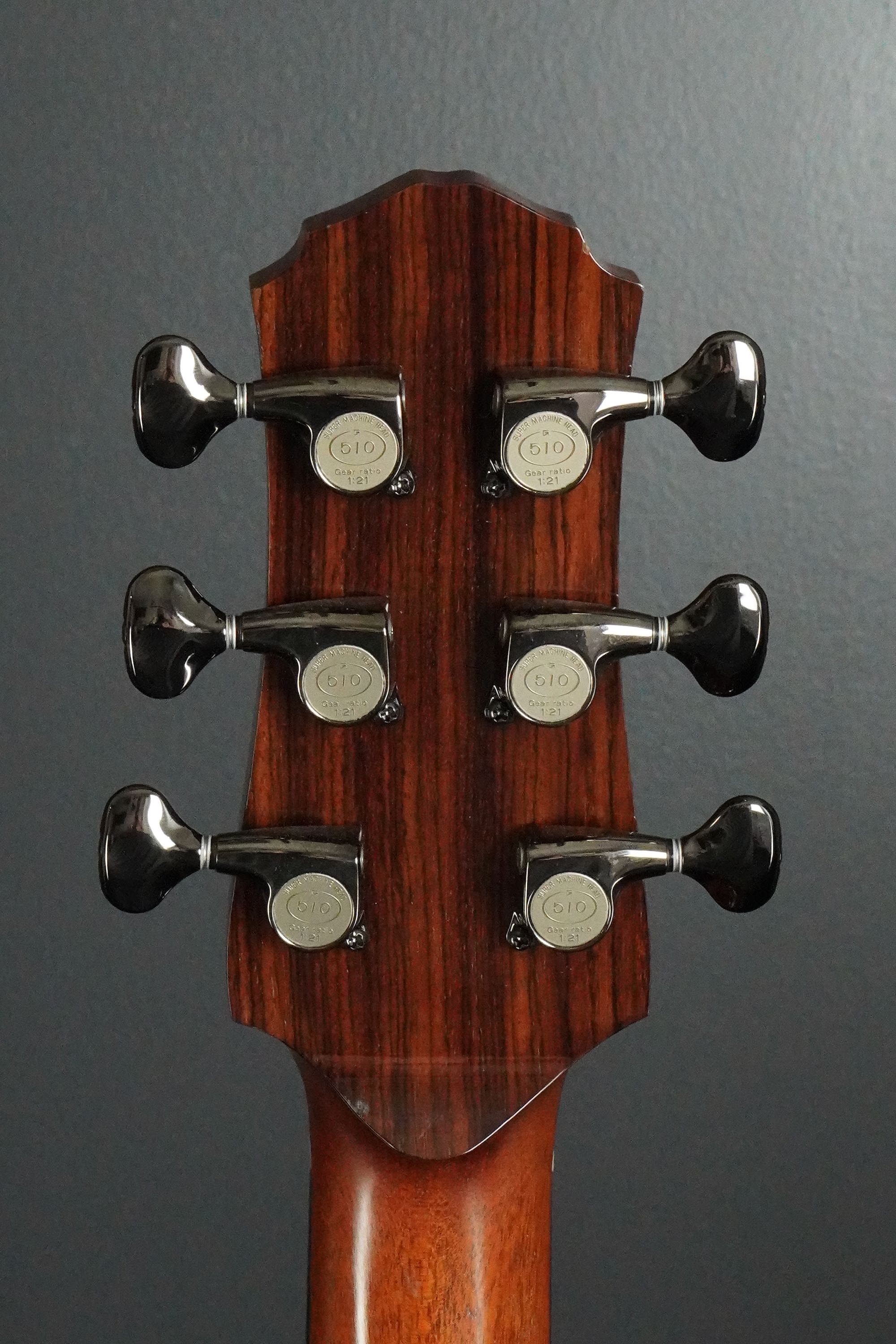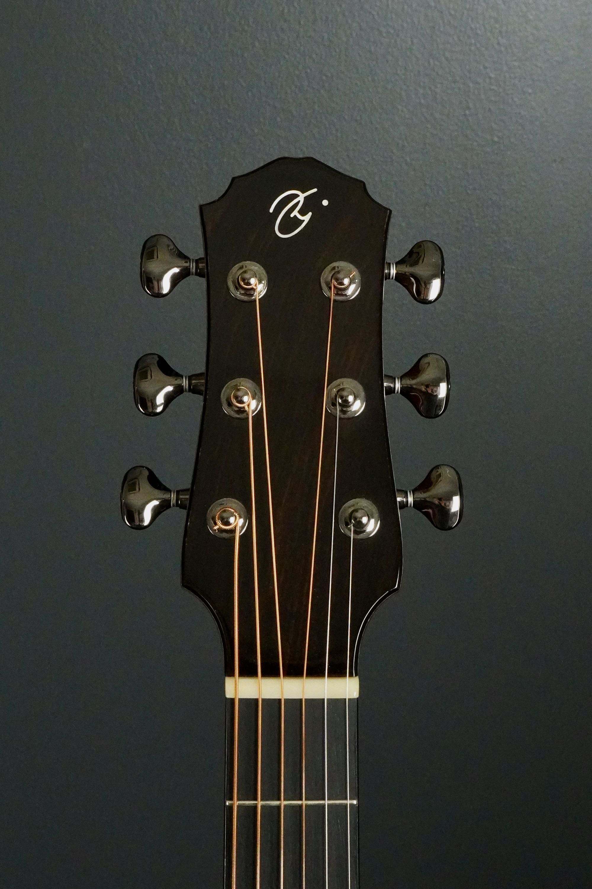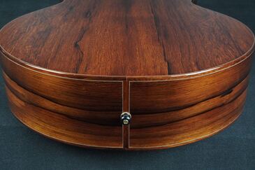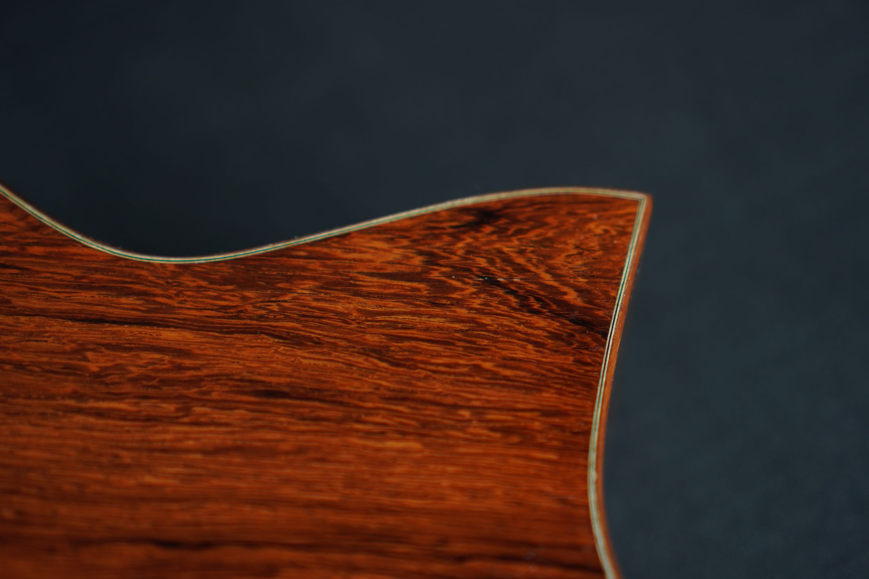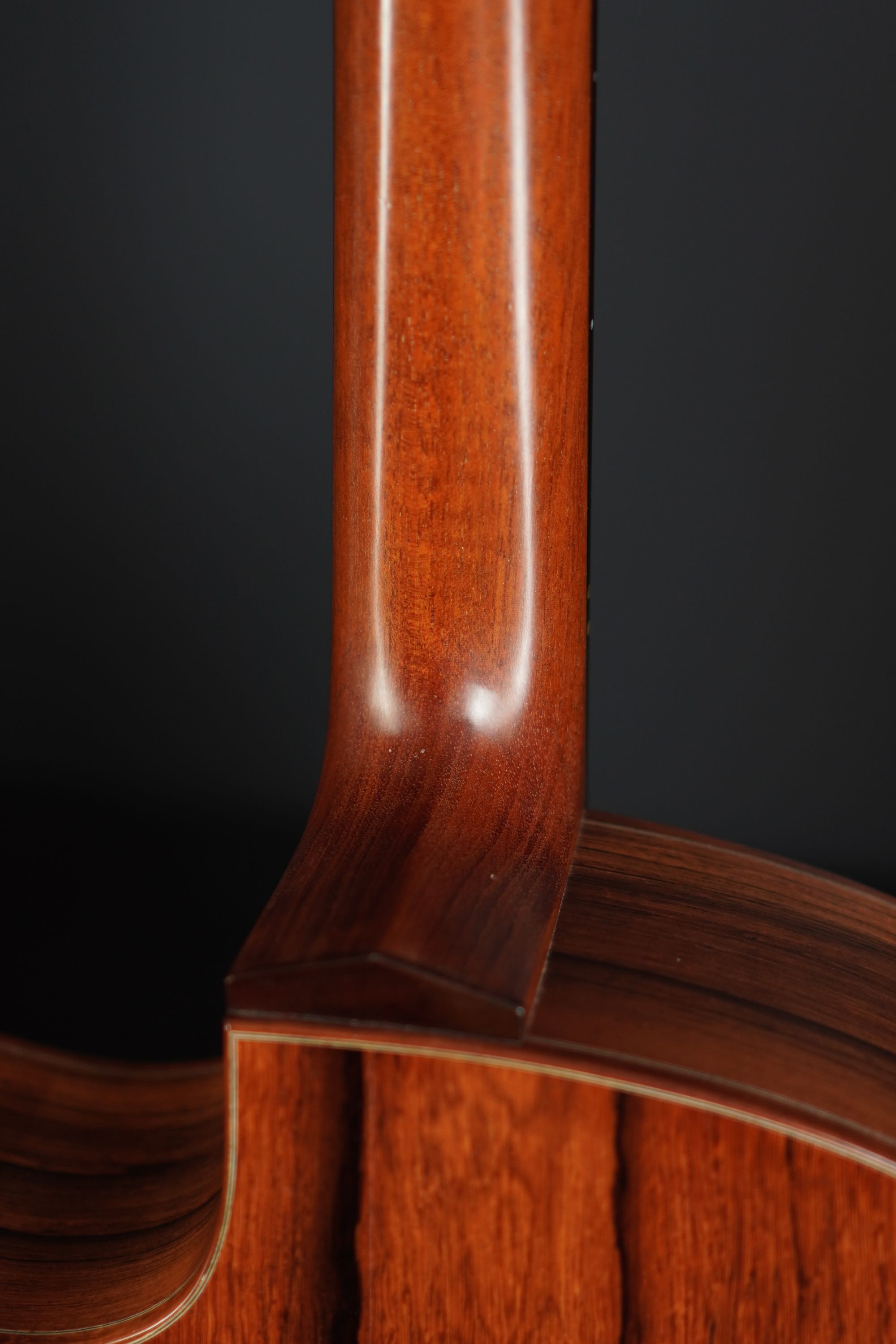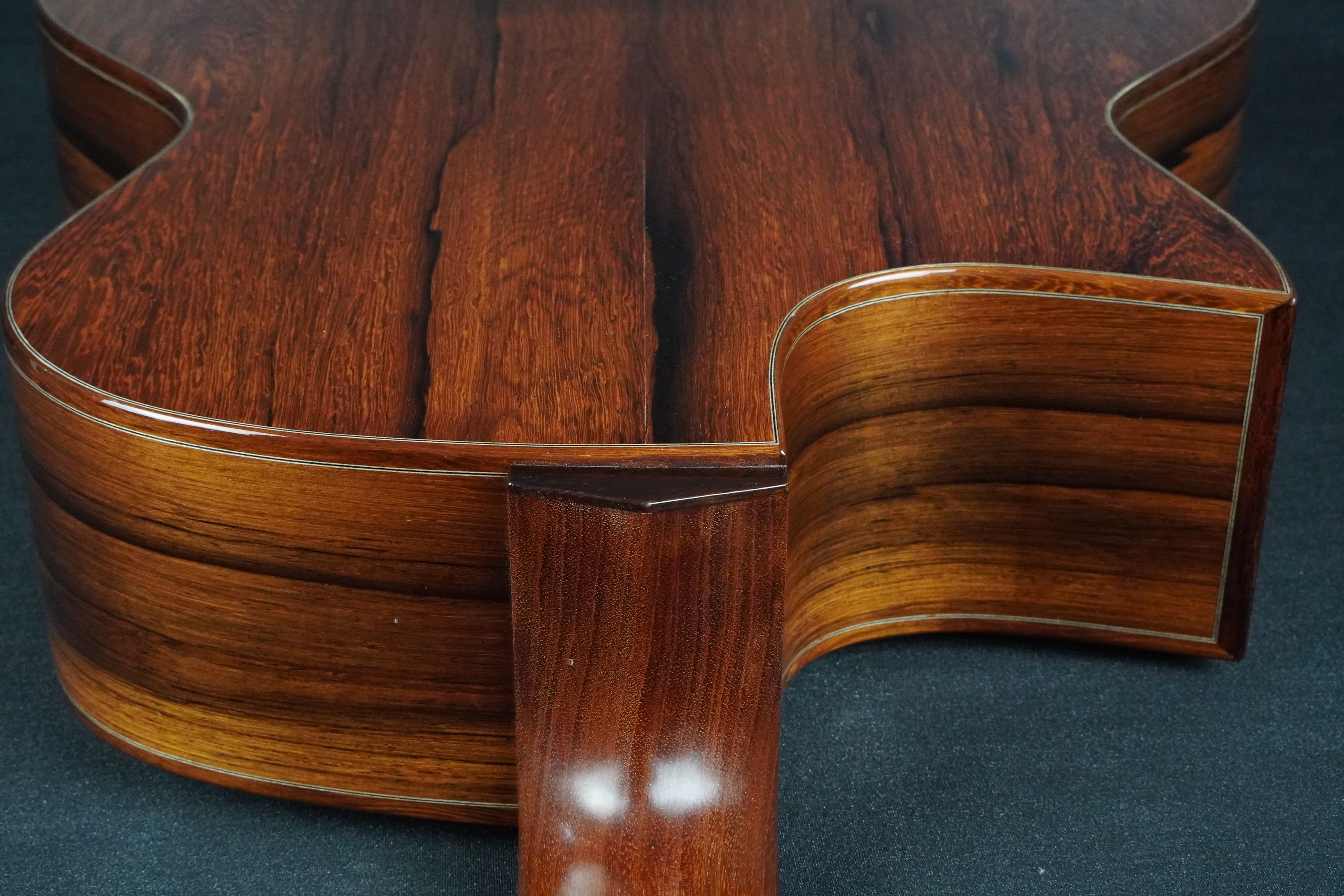 ヘッドプレートは、トップに色味の濃いローズウッドを使い、ヘッドバックには対照的な明るいローズウッドが使われ、特徴的な黒い縞模様が走っています。