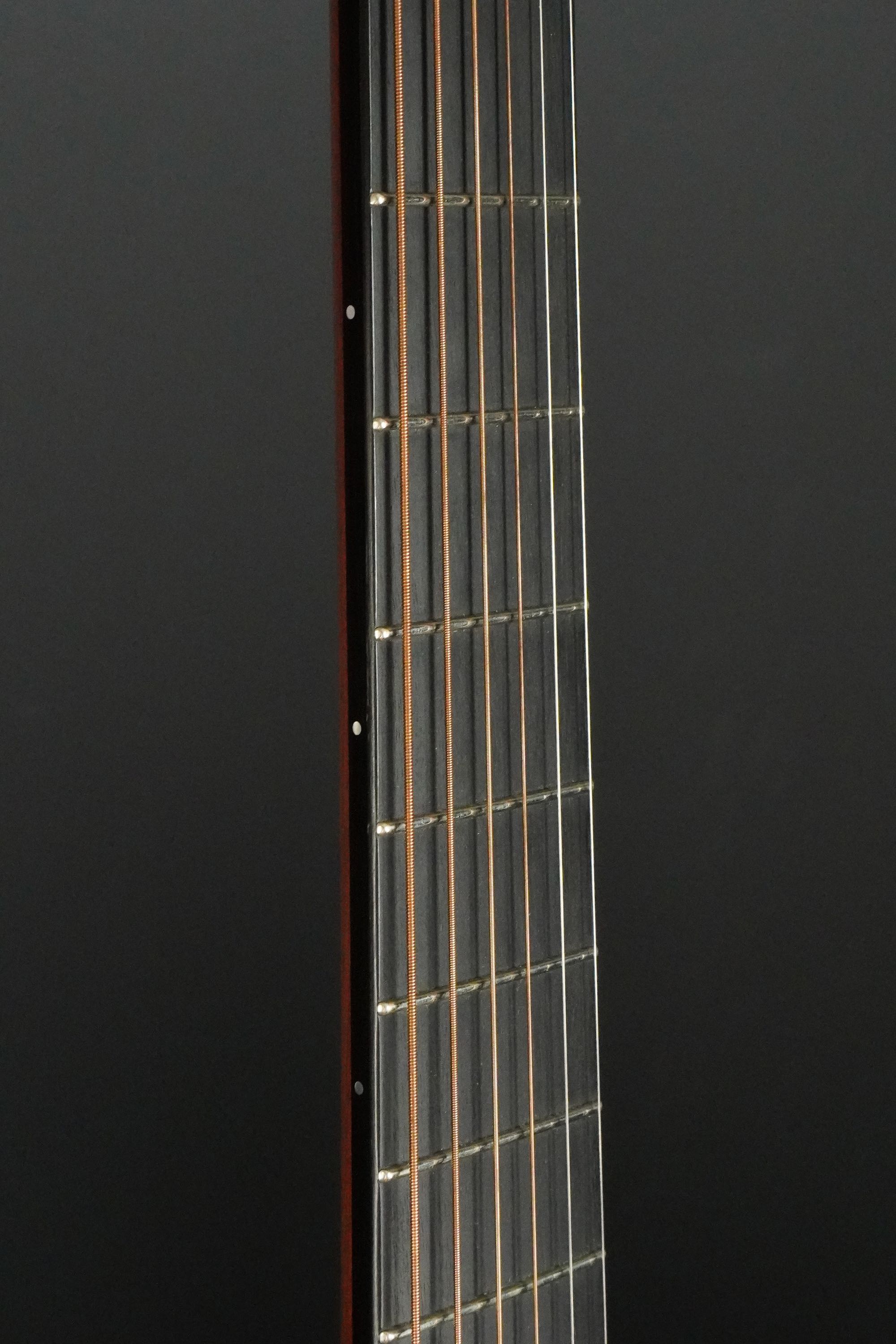 エボニーの指板にはシンプルにポジションマークが無く、それだけに漆黒のエボニー材がエレガントに映えたデザイン、サイドのポジションマークはパールドットですが、12フレットだけアバロンドットに金の縁が付いたダブルのドットで、視認性が高くなっています。