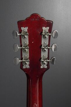 大きなヘッドにシルクスクリーンのギルドのロゴ。三連のペグもレトロなパーツで、時代を感じます。