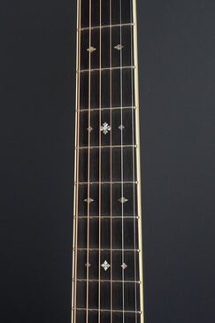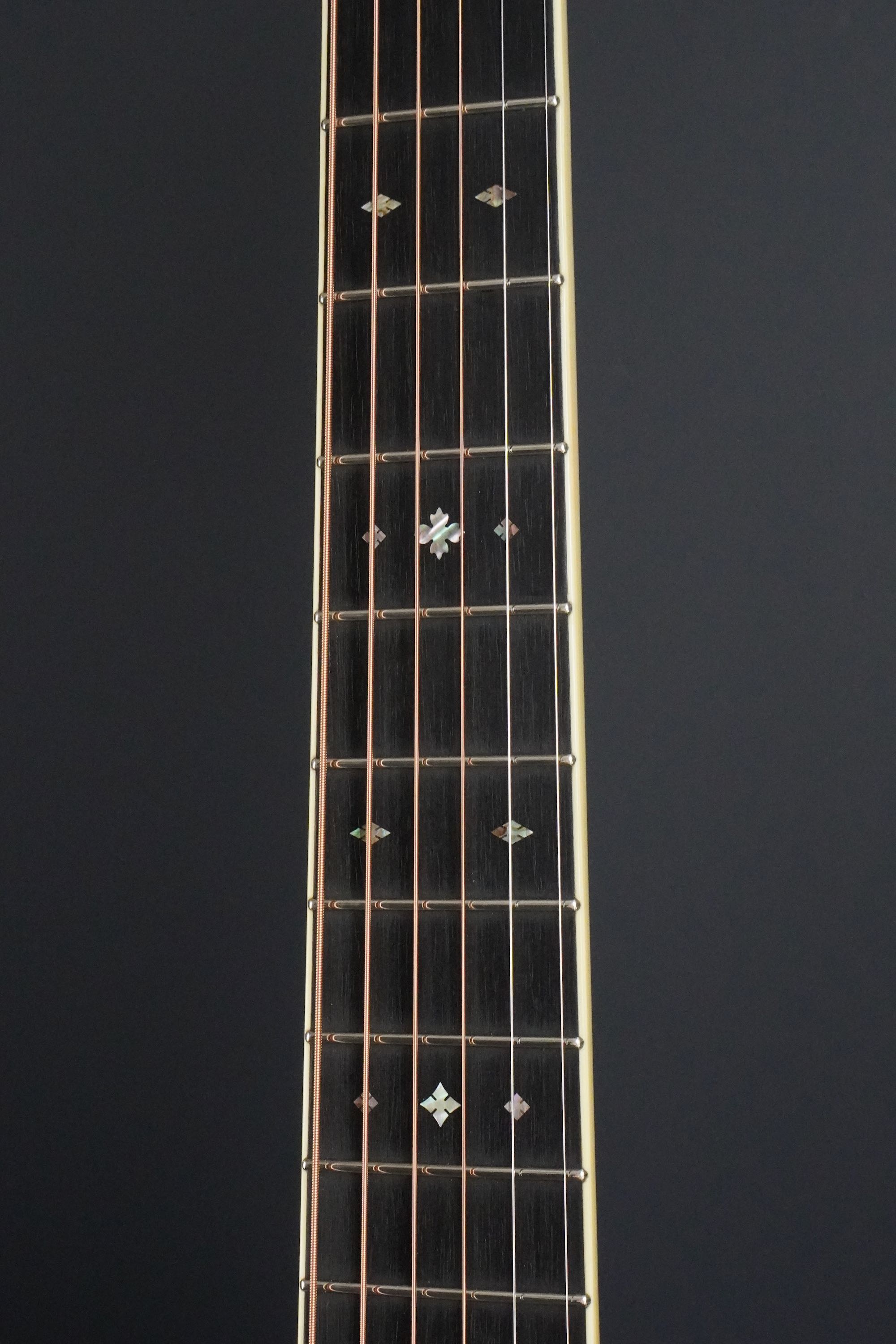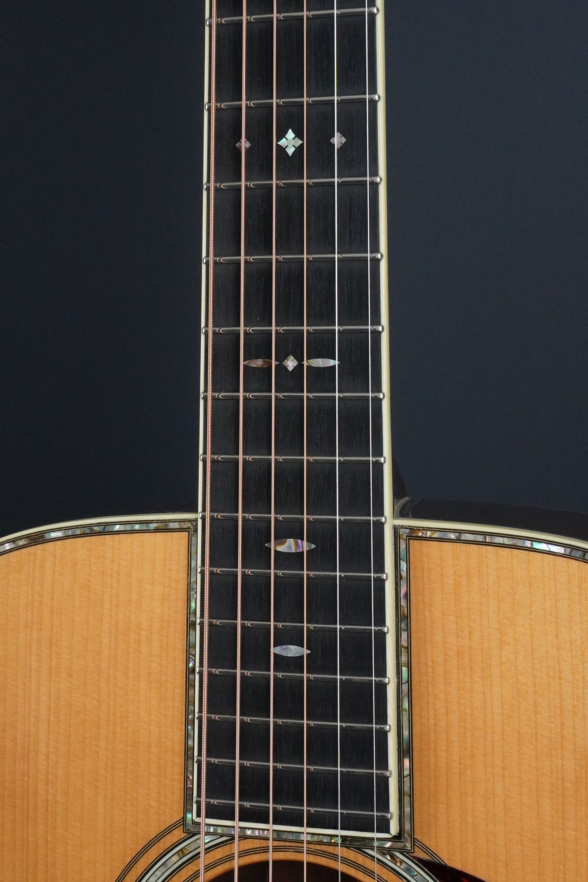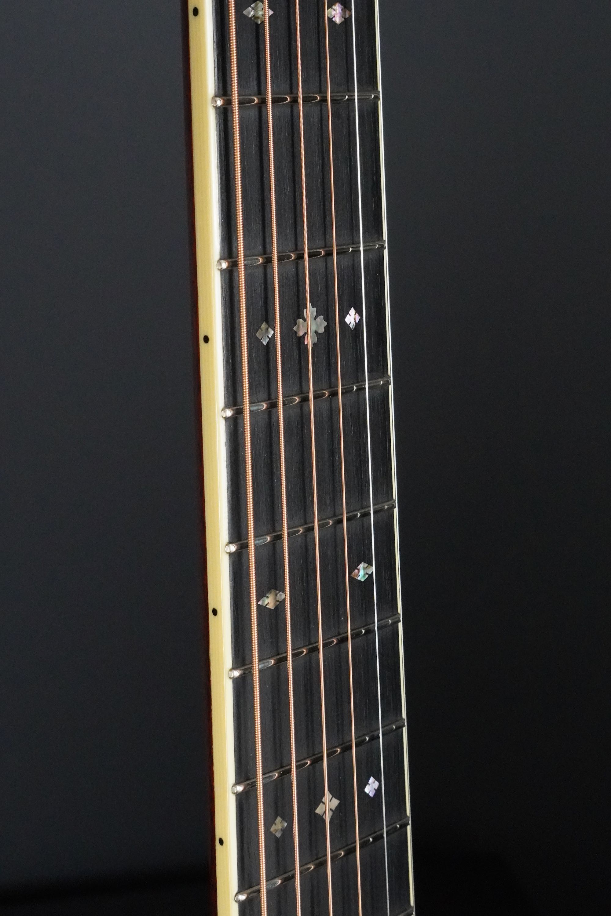 ブラックエボニー指板にはアイボロイドのバインディング、ポジションマークはゴールデンエラスタイルで45タイプのスノーフレイクインレイです。
