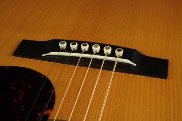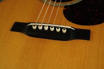 30年代スタイルのスマートなベリーブリッジやグルーインのロングサドル仕様、ブリッジピンもこだわって、大きなアバロンドットの牛骨製のピンで、鮮やかな輝きの大きなアバロンが派手に輝きます!
