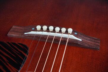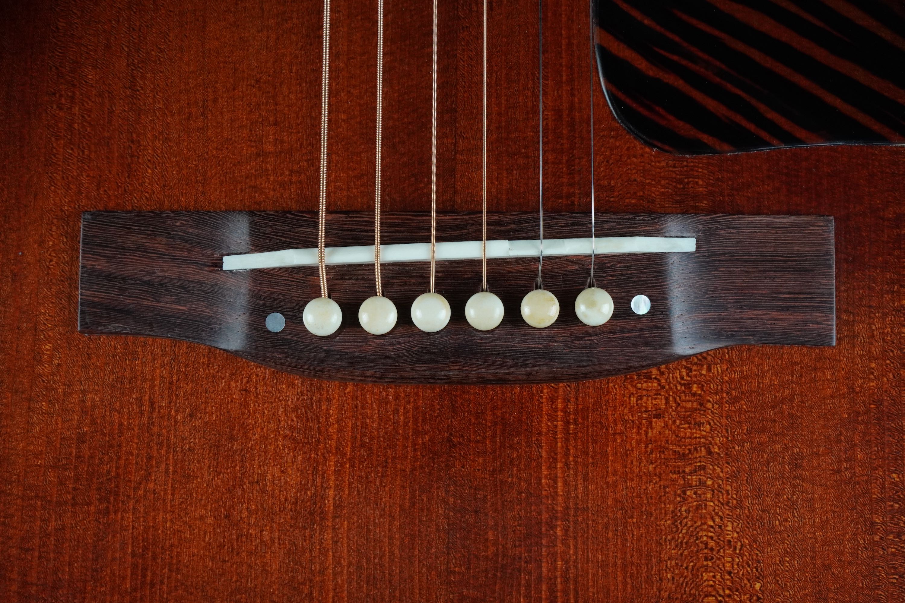 ダウンベリーのブリッジは、美しいマダガスカルローズウッドが使われ、ロングサドル仕様です。