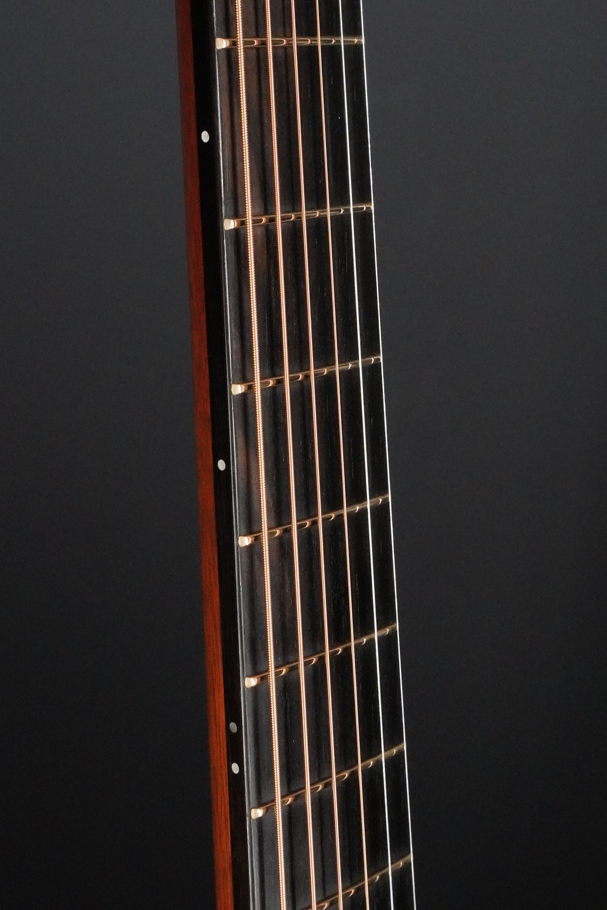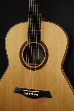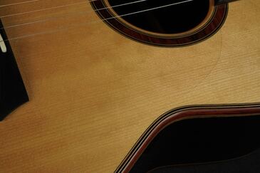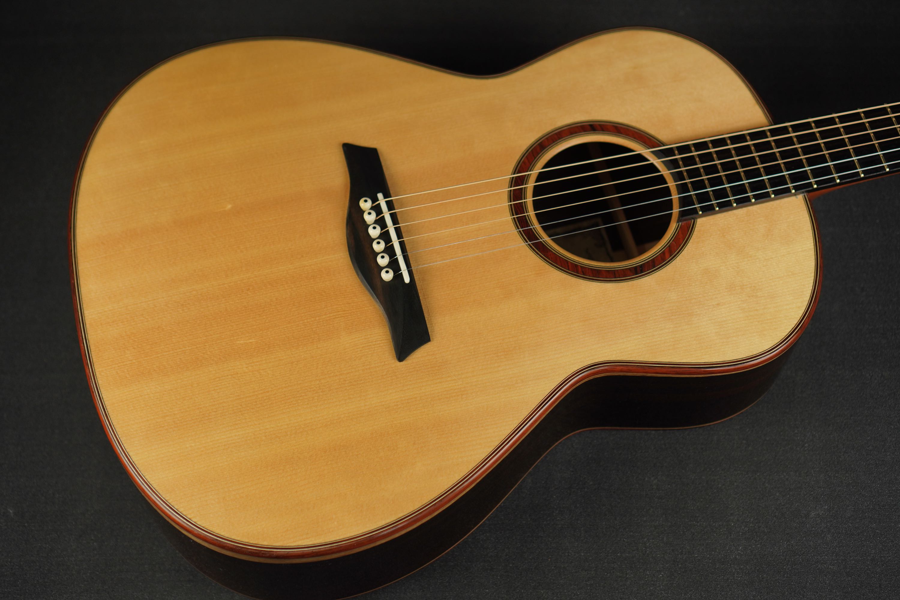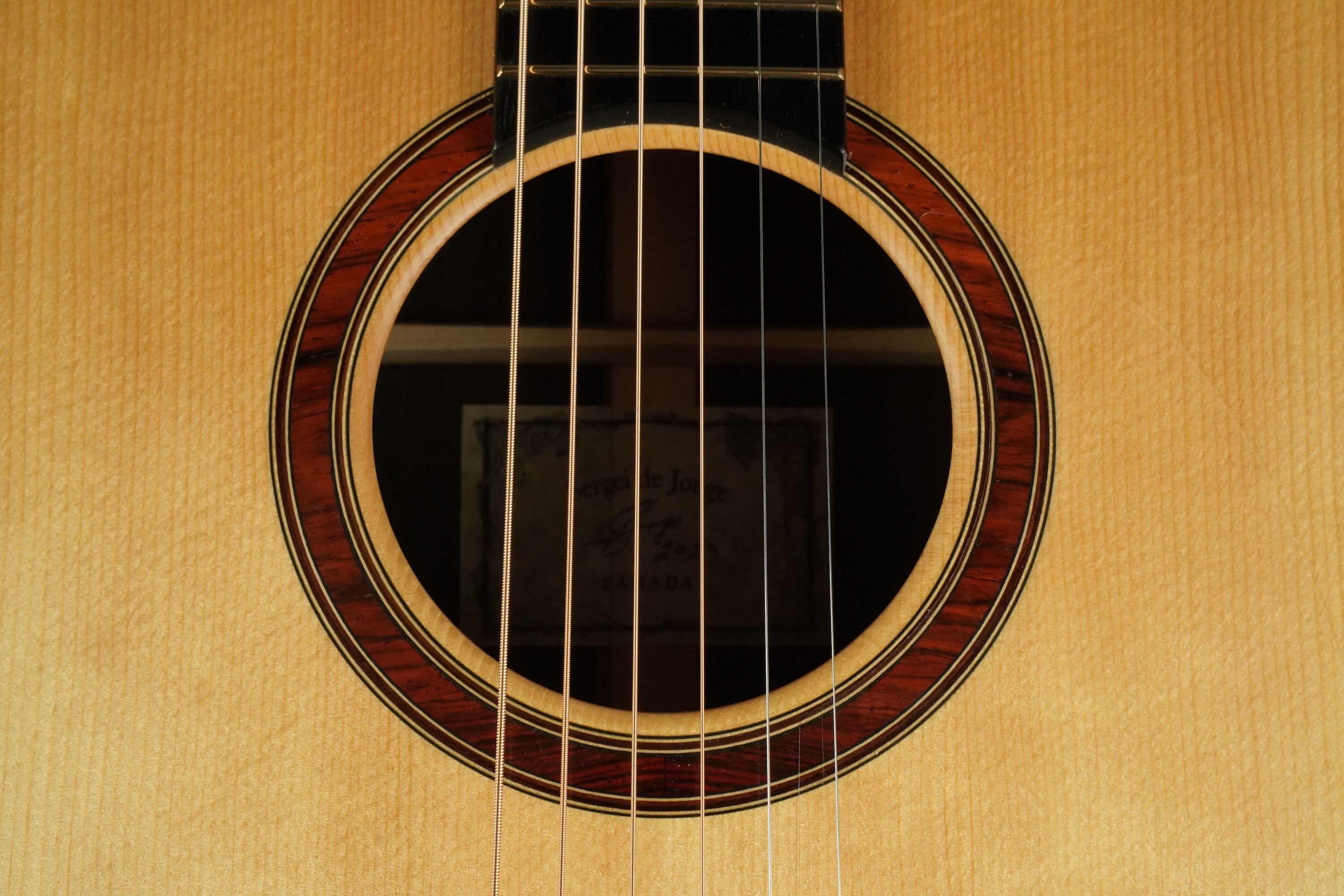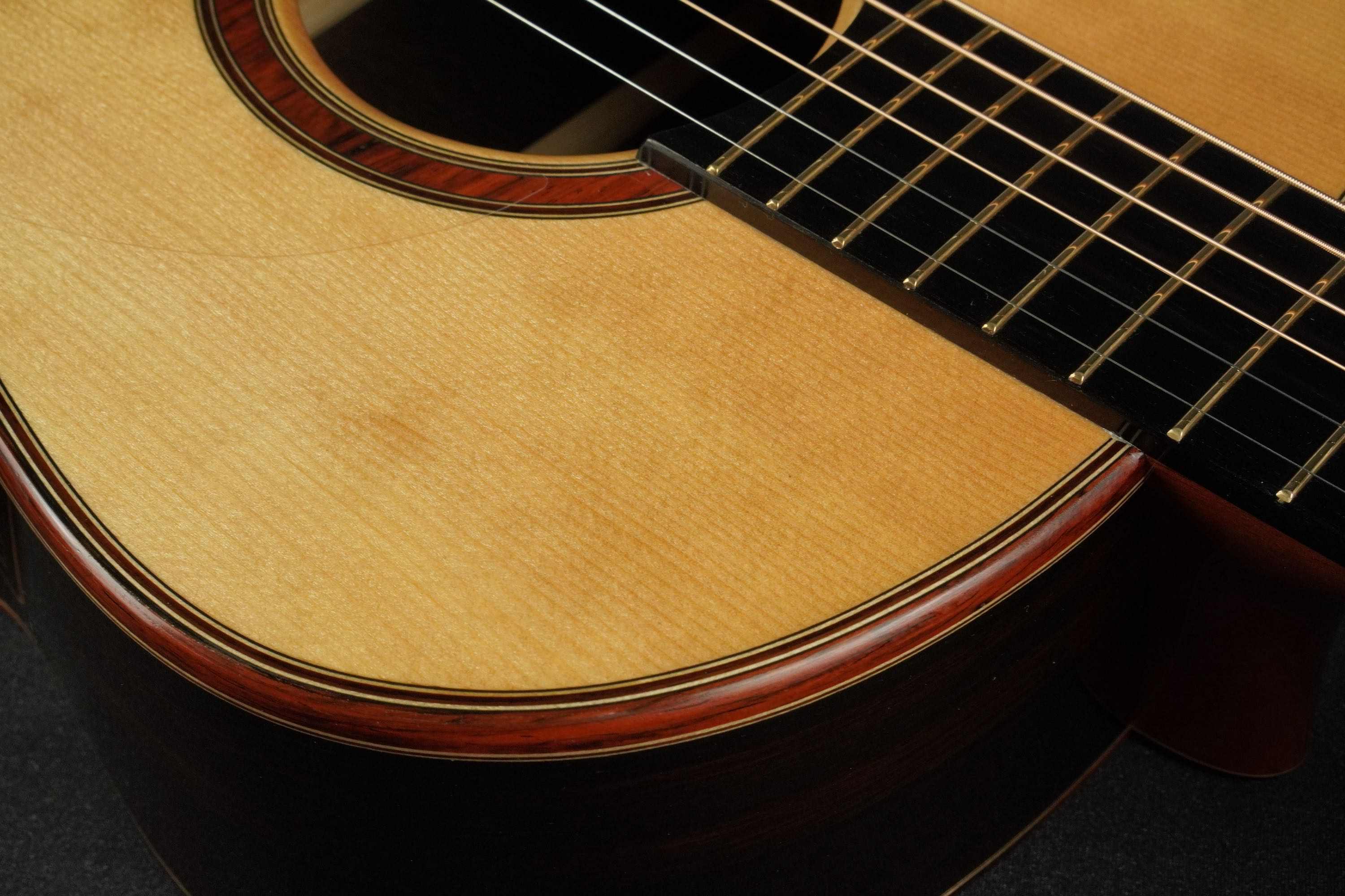 ロゼッタの周りや、トップ外周のウッドパーフリングには、ダークな色が使われ、