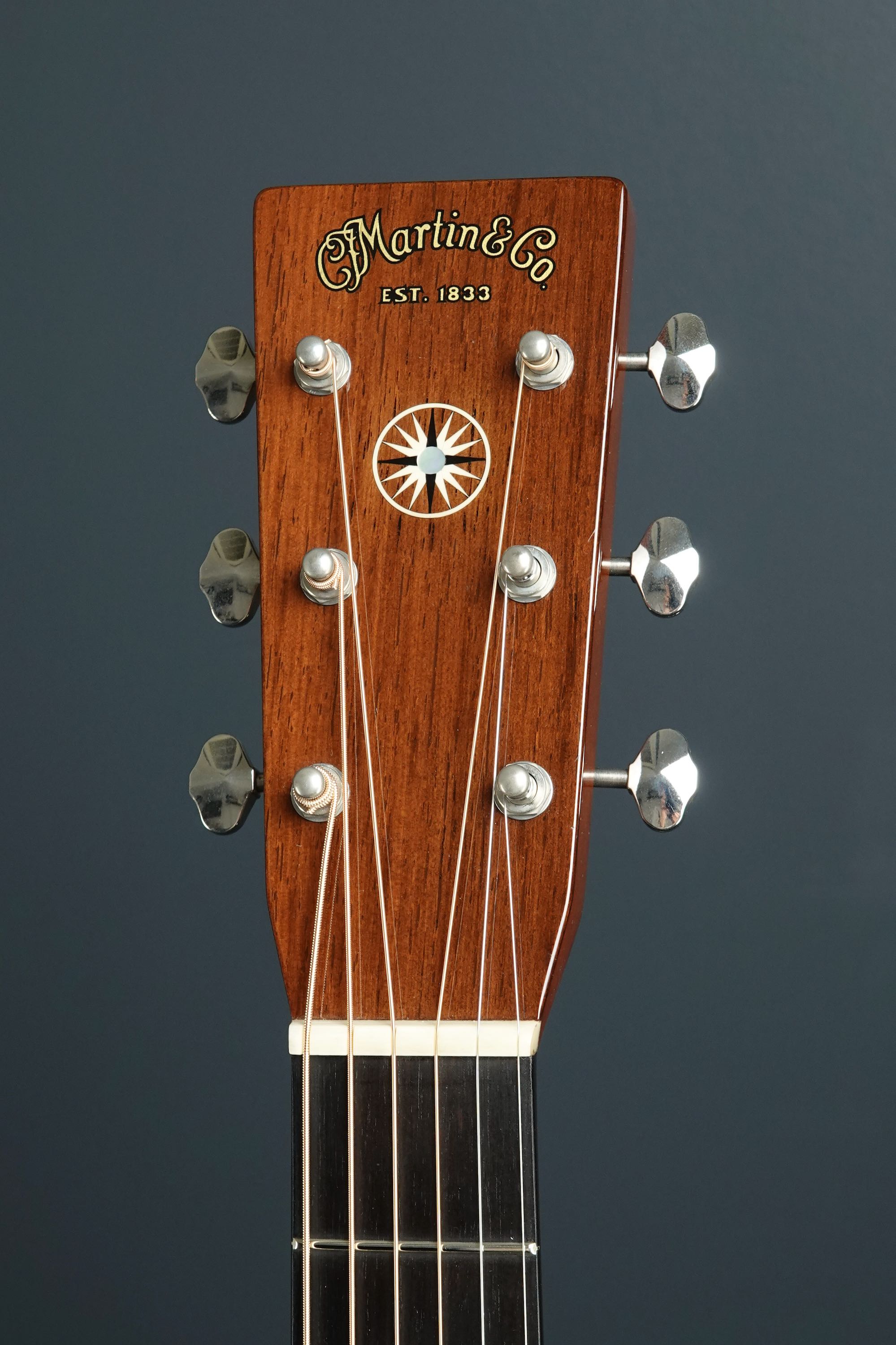 マダガスカルローズウッドの柾目の美しいヘッドプレートにはMartinのデカールロゴ、そしてヘッドの中央にはパールの入ったクロスロードインレイが入っており、チューナーはMartin刻印入りオープンギアのオリジナルが付いております。