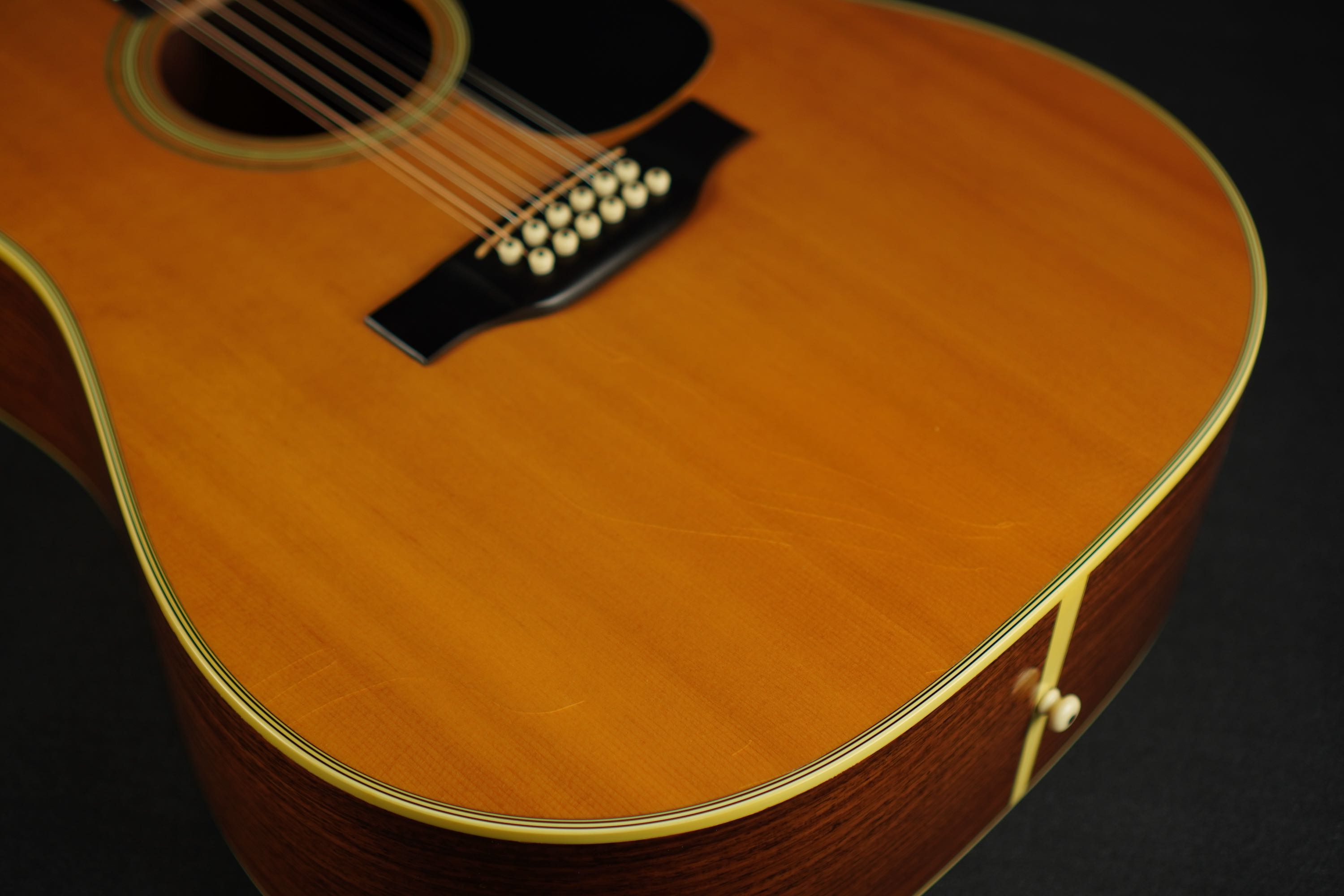 サウンドは、12フレットジョイントの大柄なドレッドノートらしい重厚な感触はありますが、やはり28スタイルですので、煌びやかでレンジが広く、伸びやかに抜ける倍音感が心地良く、12弦ギターらしい広がり感の有るサウンドは最高です!