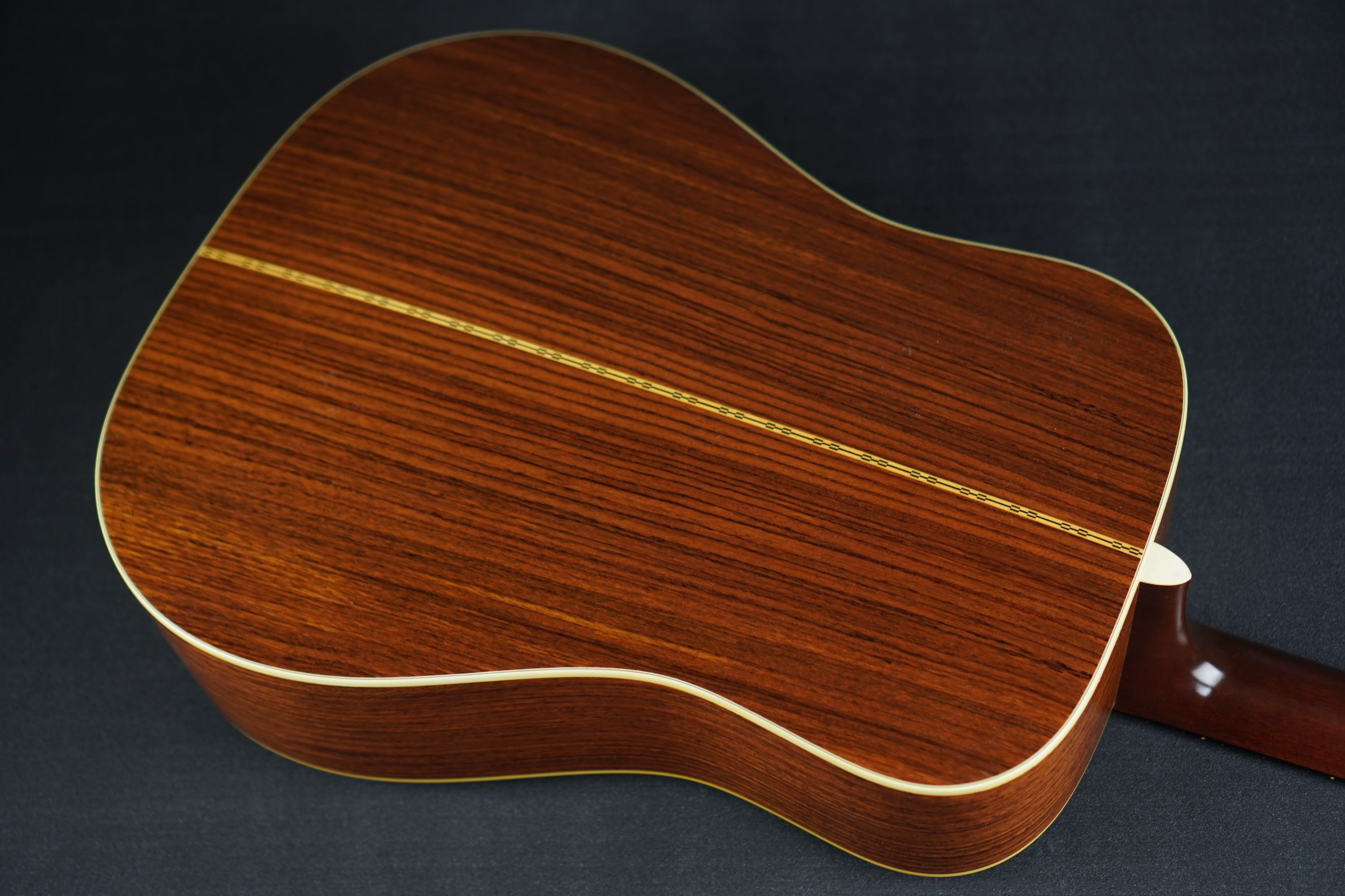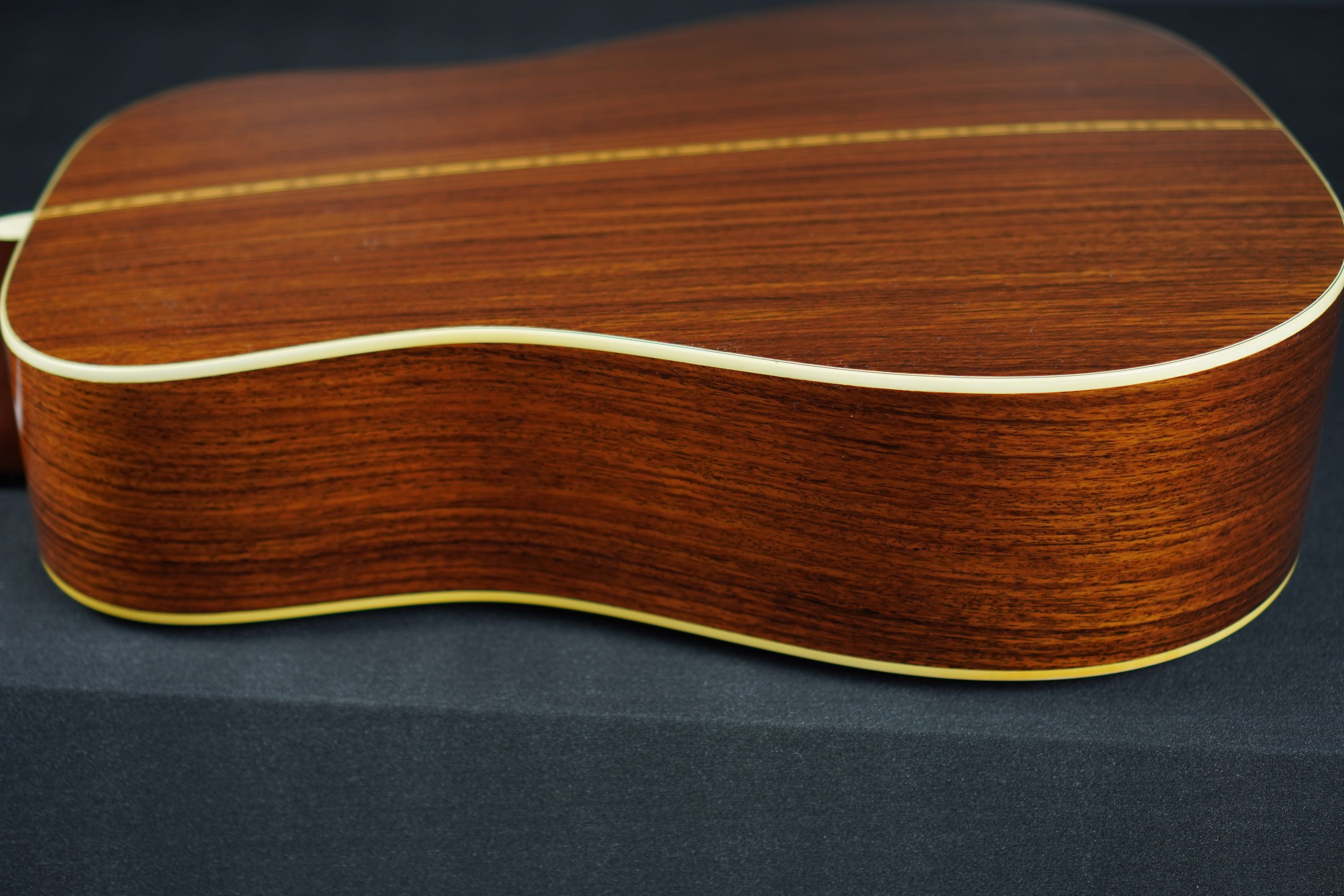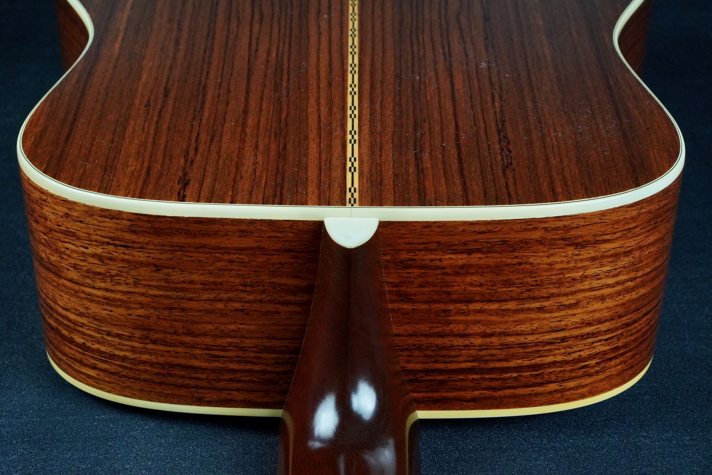 サイド&バックはインディアンローズウッドで、クリーミーな色味に、スッと整った木目が通る柾目の材で、仄かに色褪せたアンティークな風合いです。