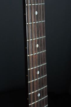 40年代のガッチリとした太いグリップのネック、色味の濃いブラジリアンローズウッドの指板にはパールドットのインレイ、シンプルな黒いヘッドトップにはシルクスクリーンのスクリプトロゴ、トラスロッドカバーも高い位置で、とてもレトロな風合いです。