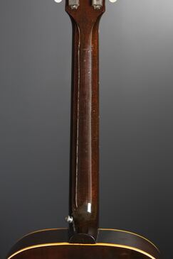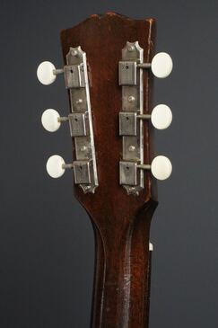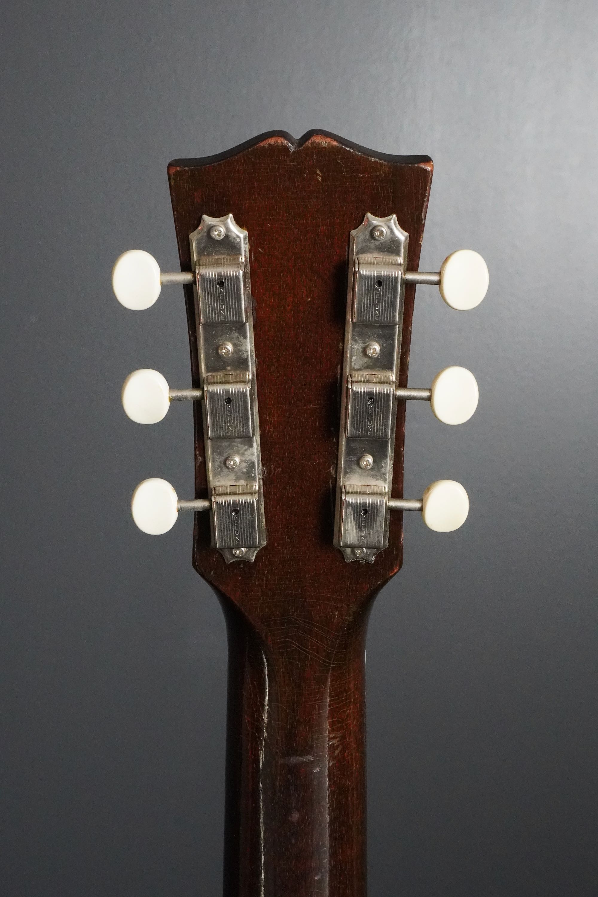 今回入荷の本機はシリアルNoが無い時期の為、正確な年式は不明ですが、ヘッドロゴがスクリプトの初期の頃の製造、最初期のマホガニーボディから、スプルーストップでメイプルサイドバックになった頃ですので、1946年〜1947年頃の製造と思われます。