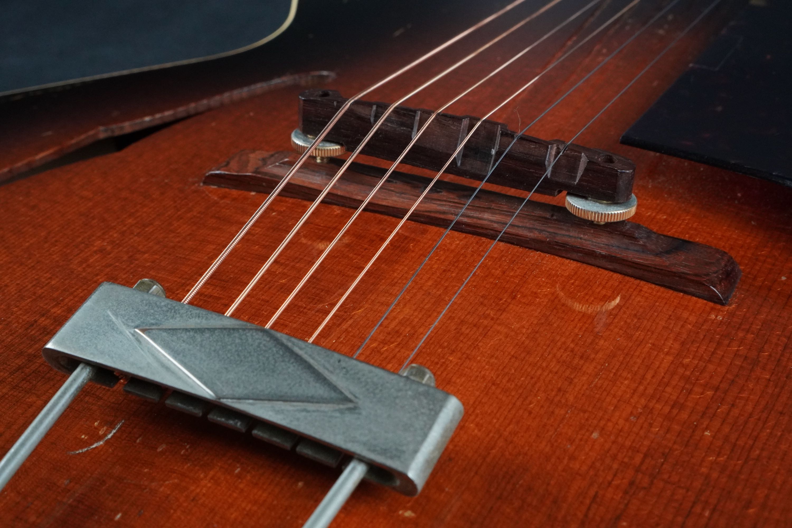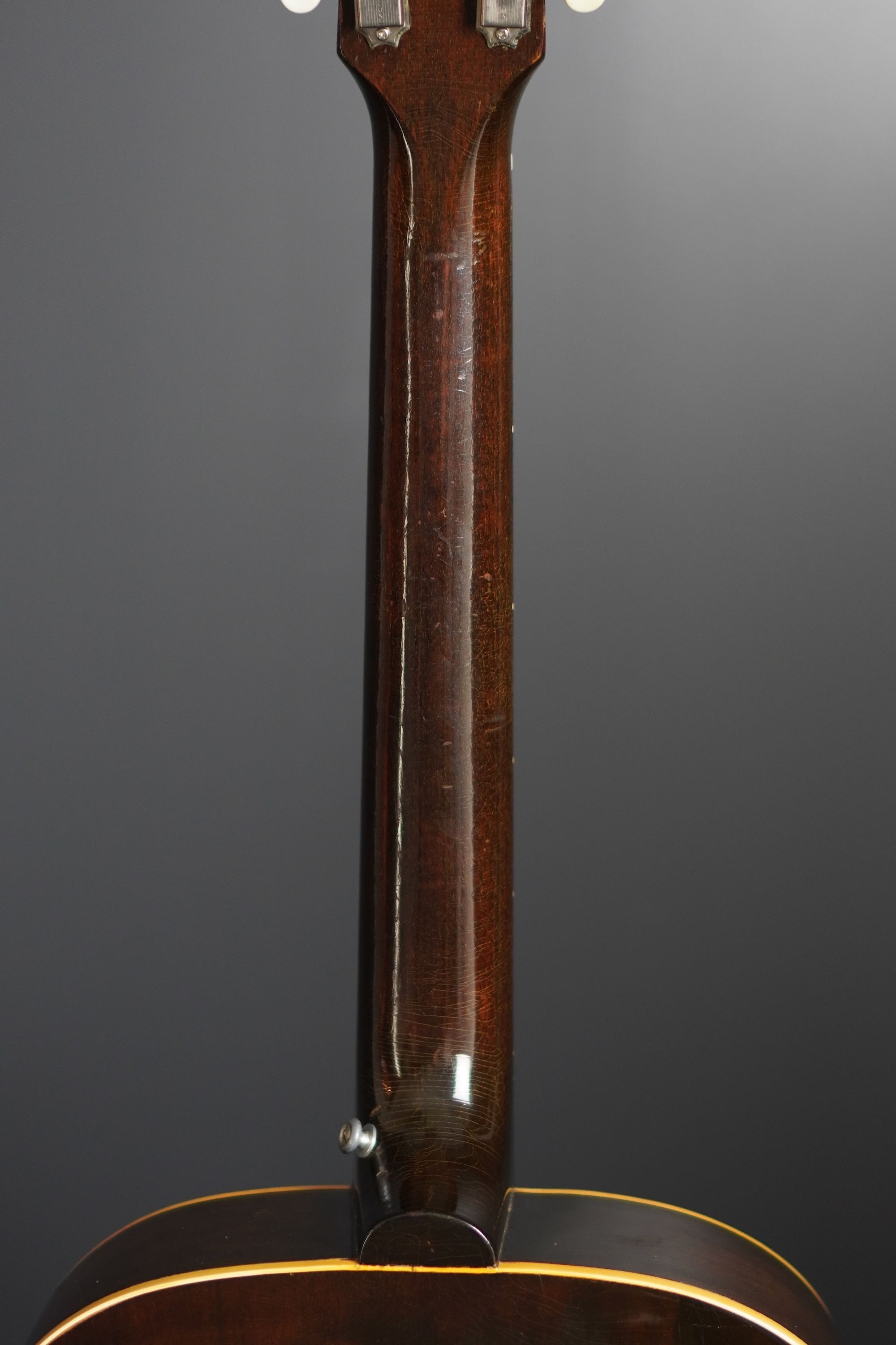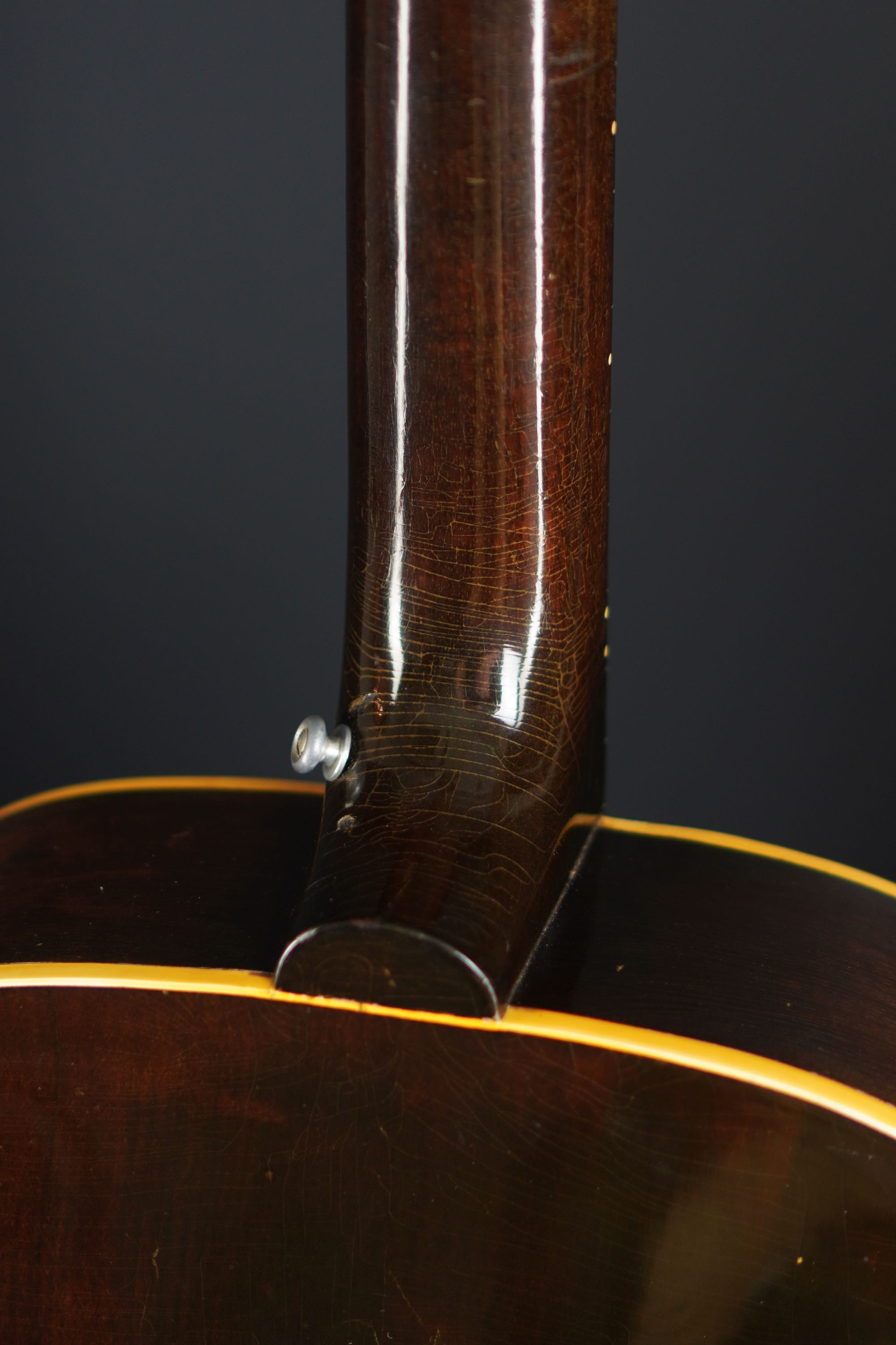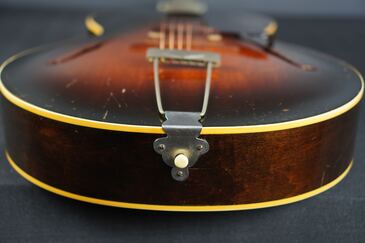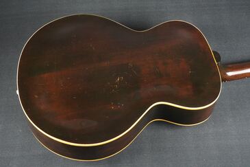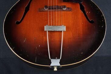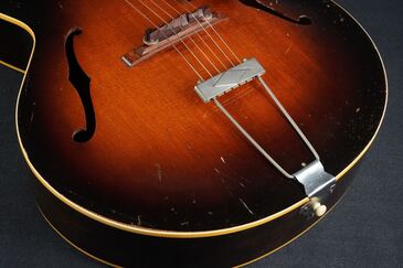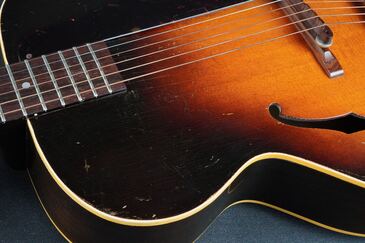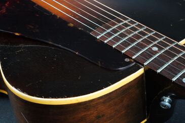 40年代終盤から50年代初頭頃に見られる渋いサンバーストフィニッシュ、センターの黄色味がややダークでグラデーションの幅もあるアンティークなバースト感で、ボディ周りの白いバインディングが飴色に焼け、シンプルな格好良さを感じさせるルックスです。