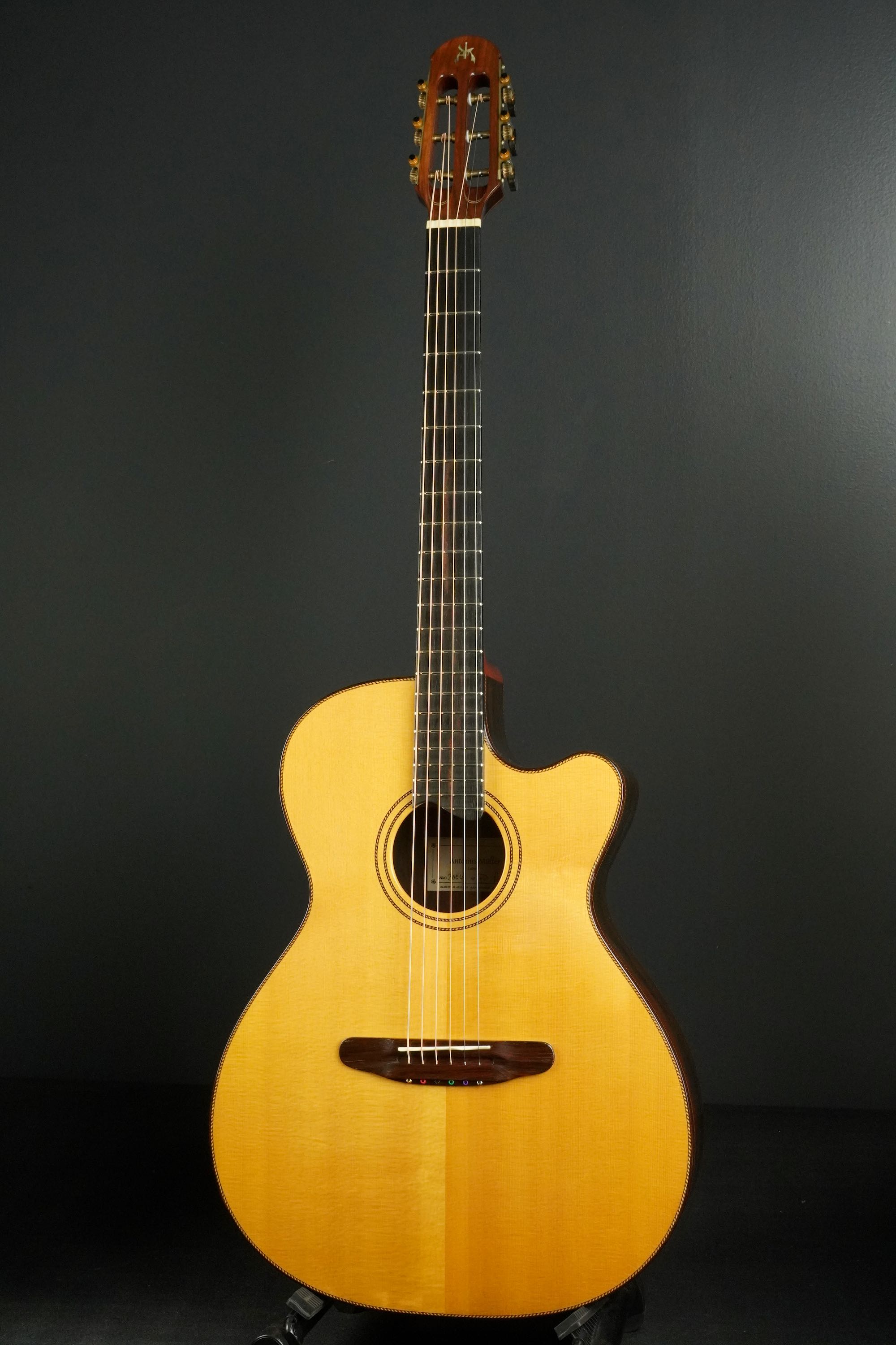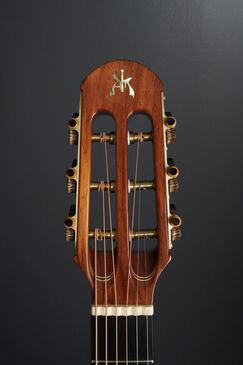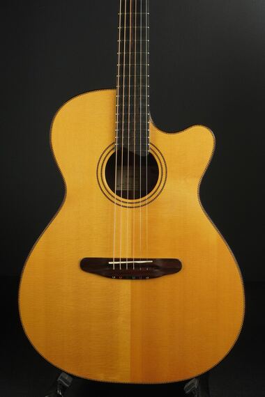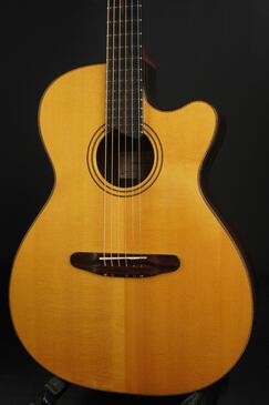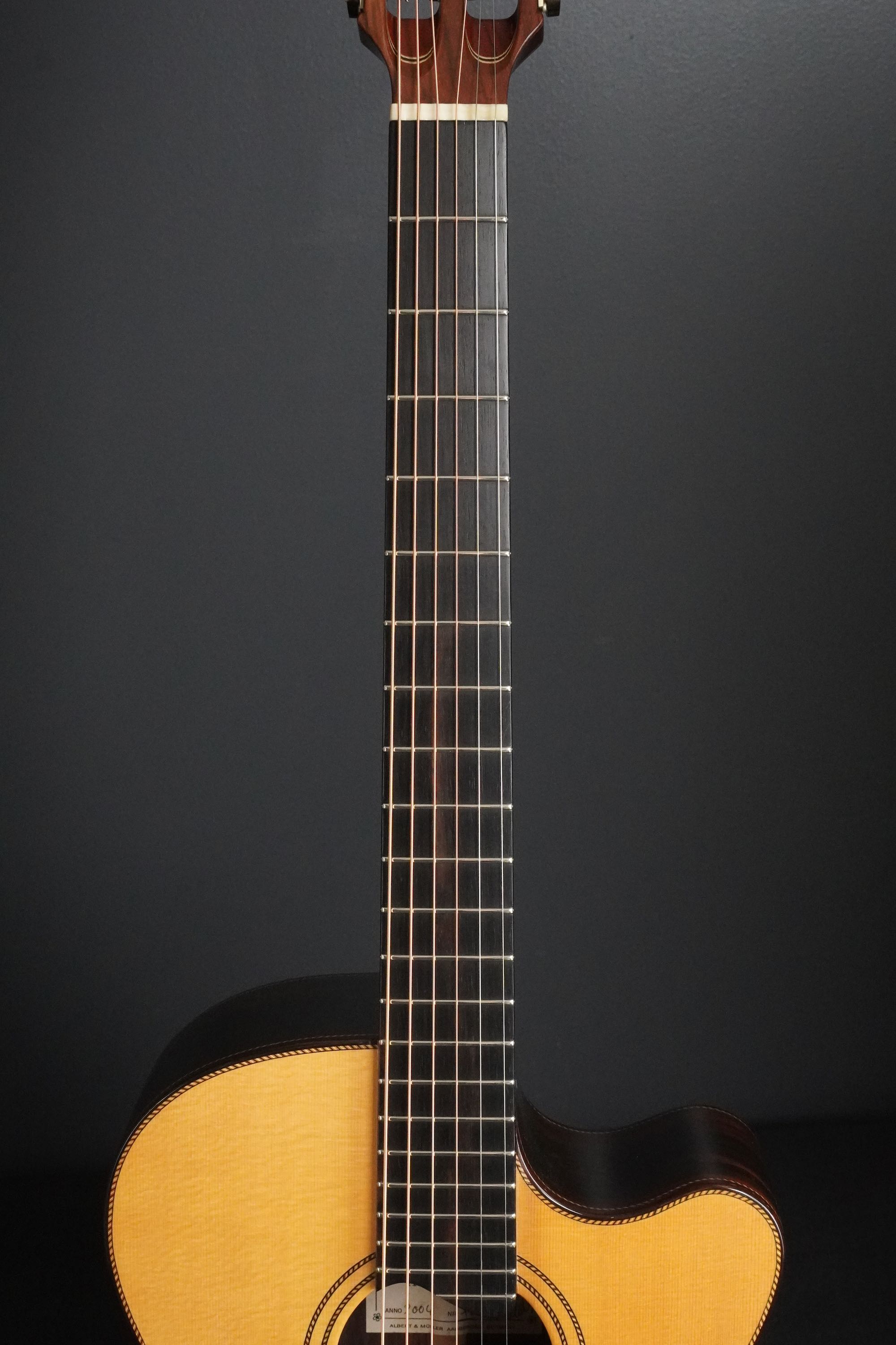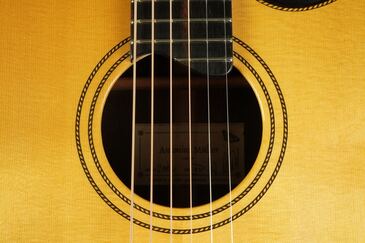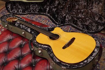 ヨーロッパの手工メーカーらしく、クラシックの名残を感じさせる造りやデザインで、とても優美でエレガントなルックス、ボディサイズは15インチほどですので、OMなどと近いサイズ感です。