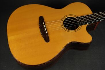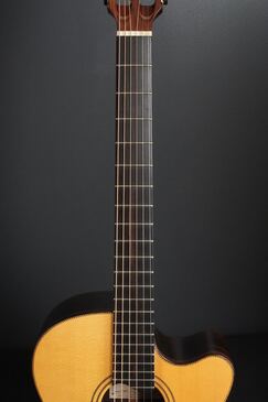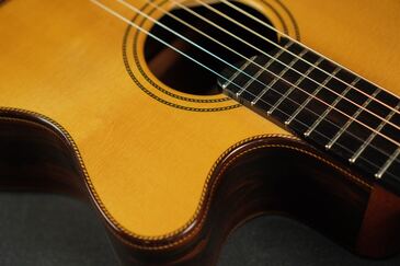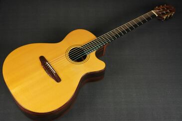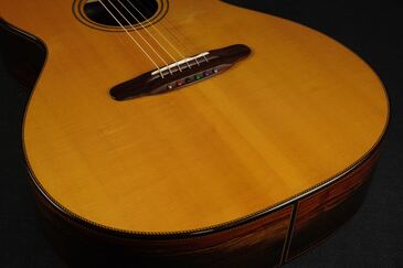ボディーが軽く作られており、レスポンスが非常に良く、低音の迫力や音の太さを感じます。ナイロンギターを弾いてる様なストレス感ゼロの抜けの良さ。低音はとくにコシがありジャーマンスプルースならではのふっくらとした弾き味、あたたかい倍音感が心地よいです。