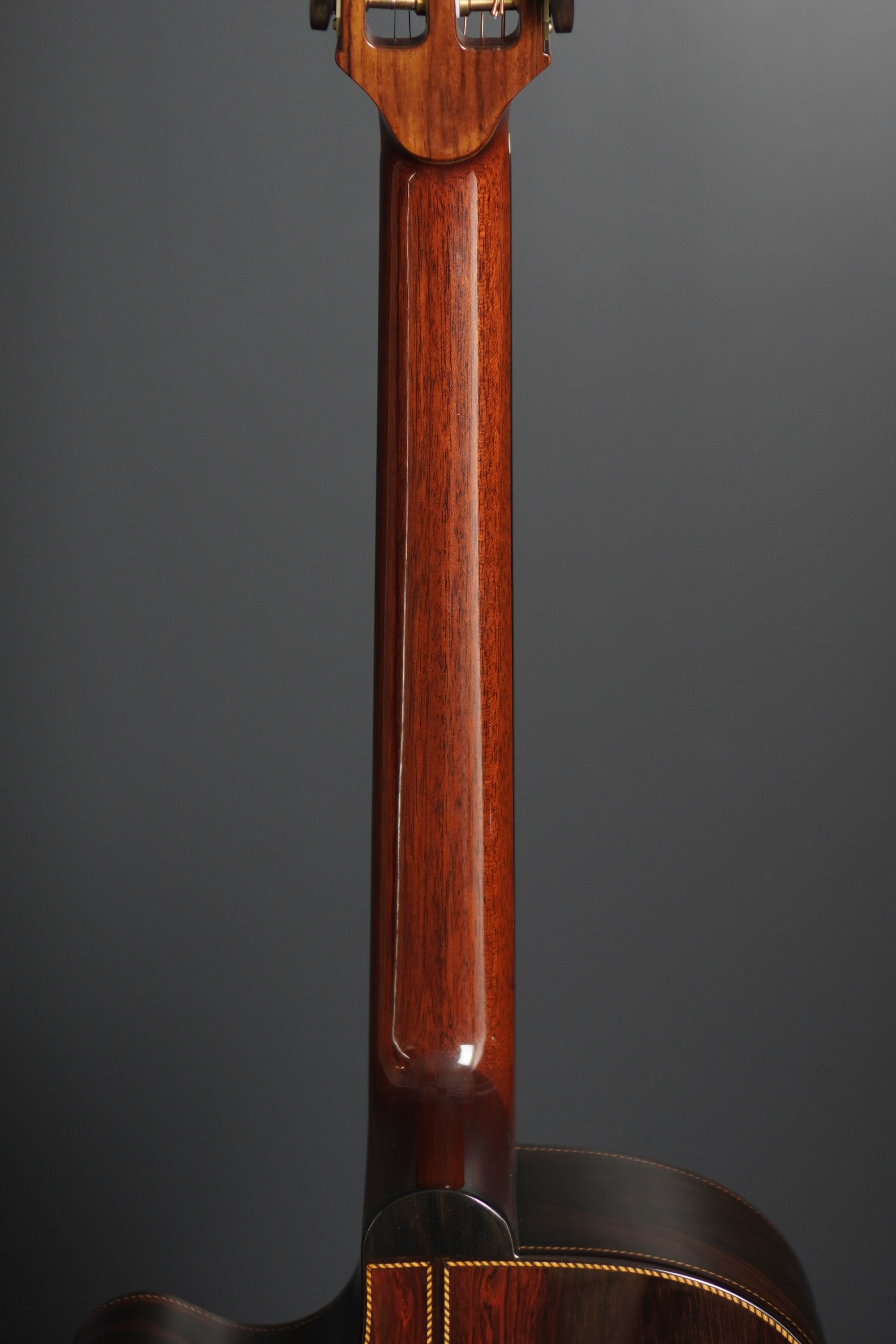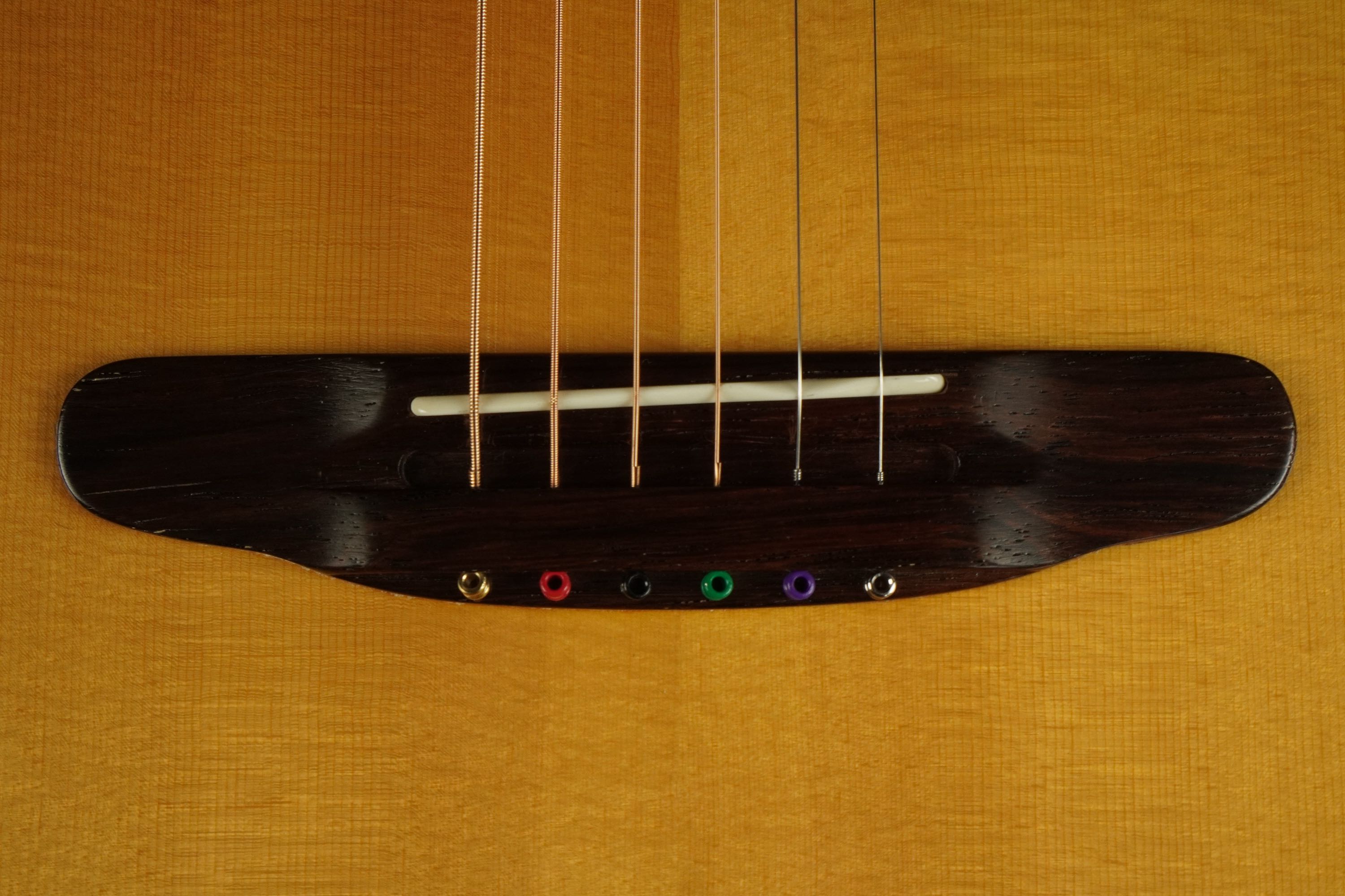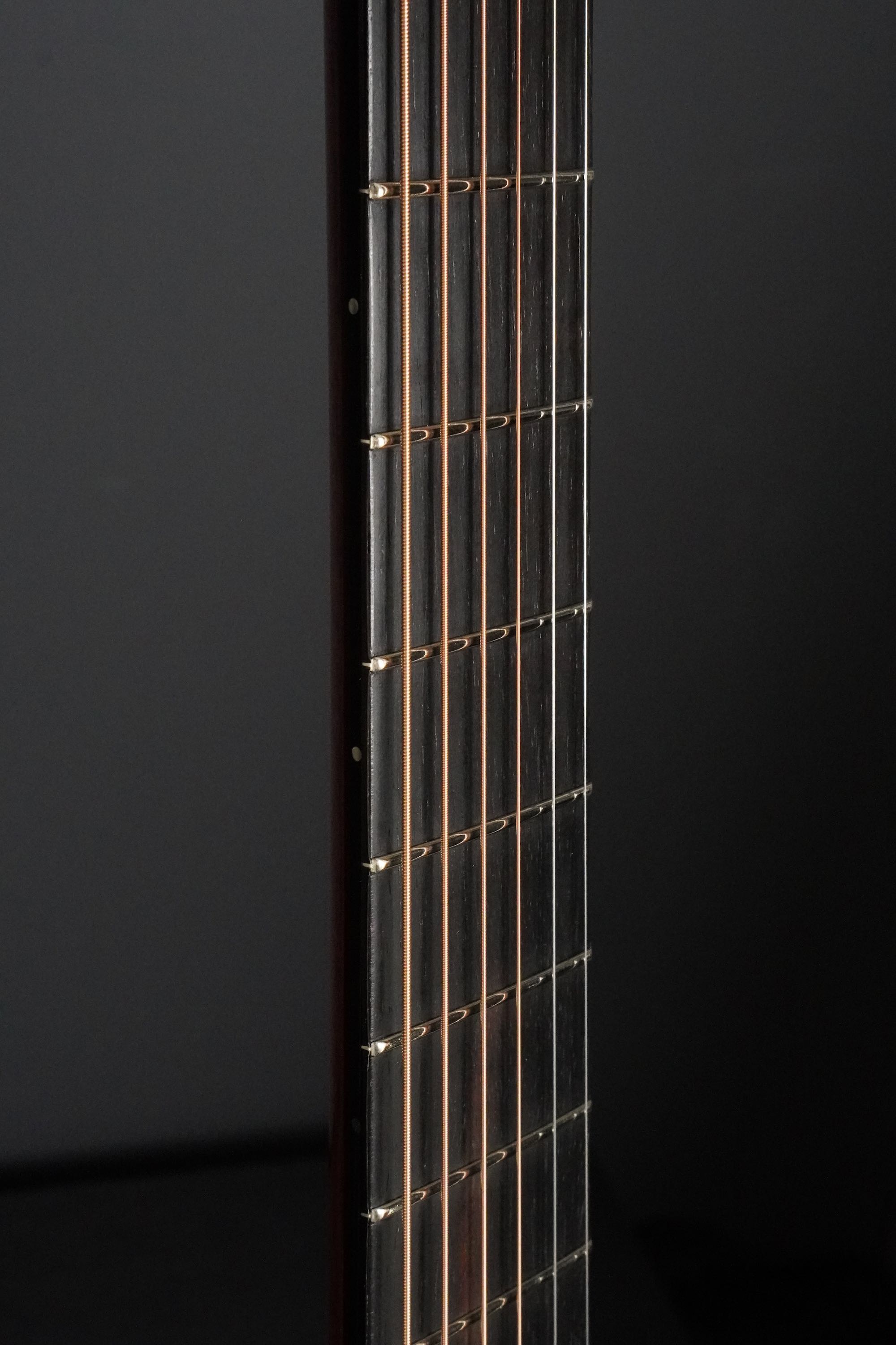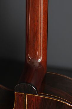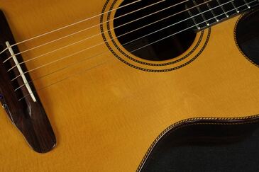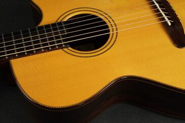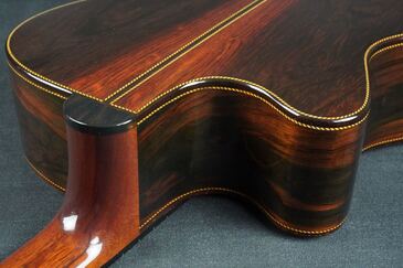 綺麗に面取りされたウッドバインディング、サウンドホールやバインディングには、細かく木材を組み合わせたロープパターンのレトロなパーフリング、ハカランダのブリッジは立体的な造形のピンレスブリッジで、指板エンドのアールの付け方など、全体のデザインが上手く融合し、とても趣き深いデザインです。