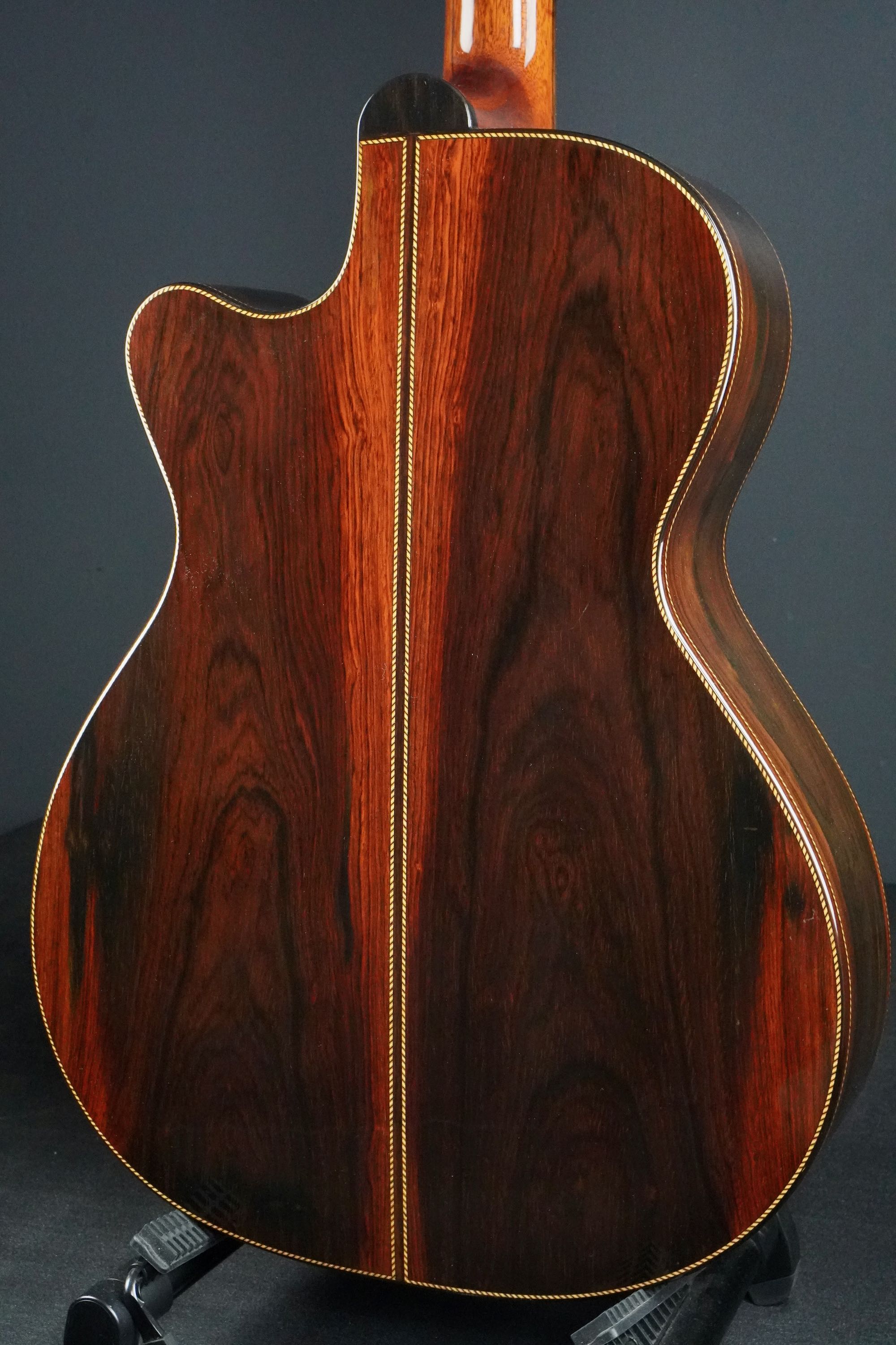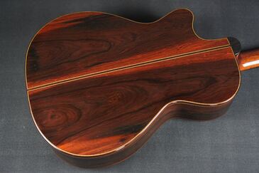 フラッグシップモデルらしくトップにはきめ細かな木目の良質なジャーマンスプルース、サイドバックにも赤黒い木肌にグッとうねった木目の魅惑的なブラジリアンローズウッドが使われております。