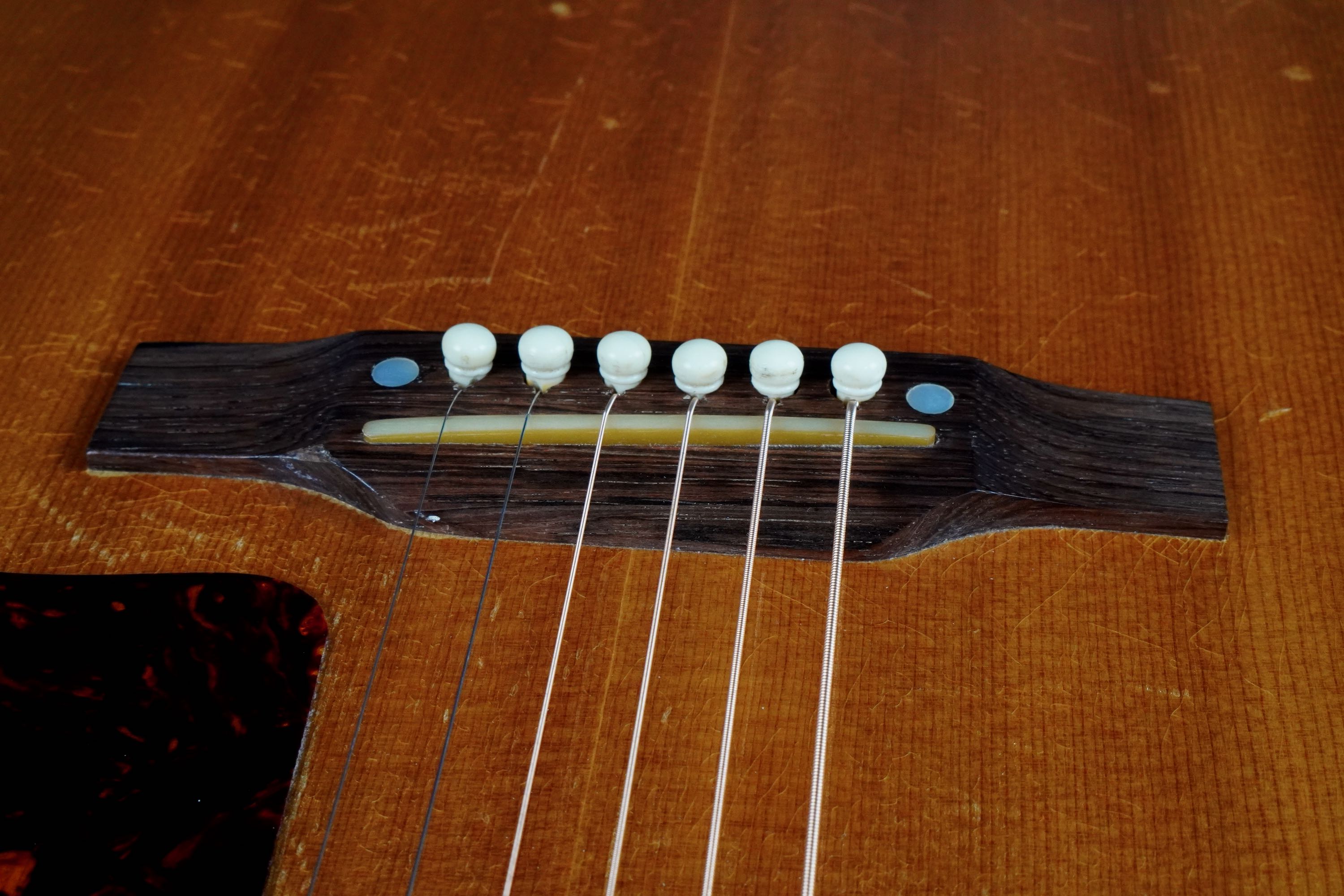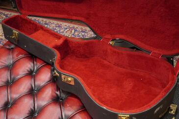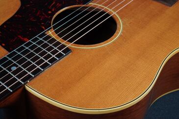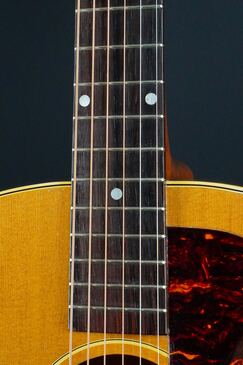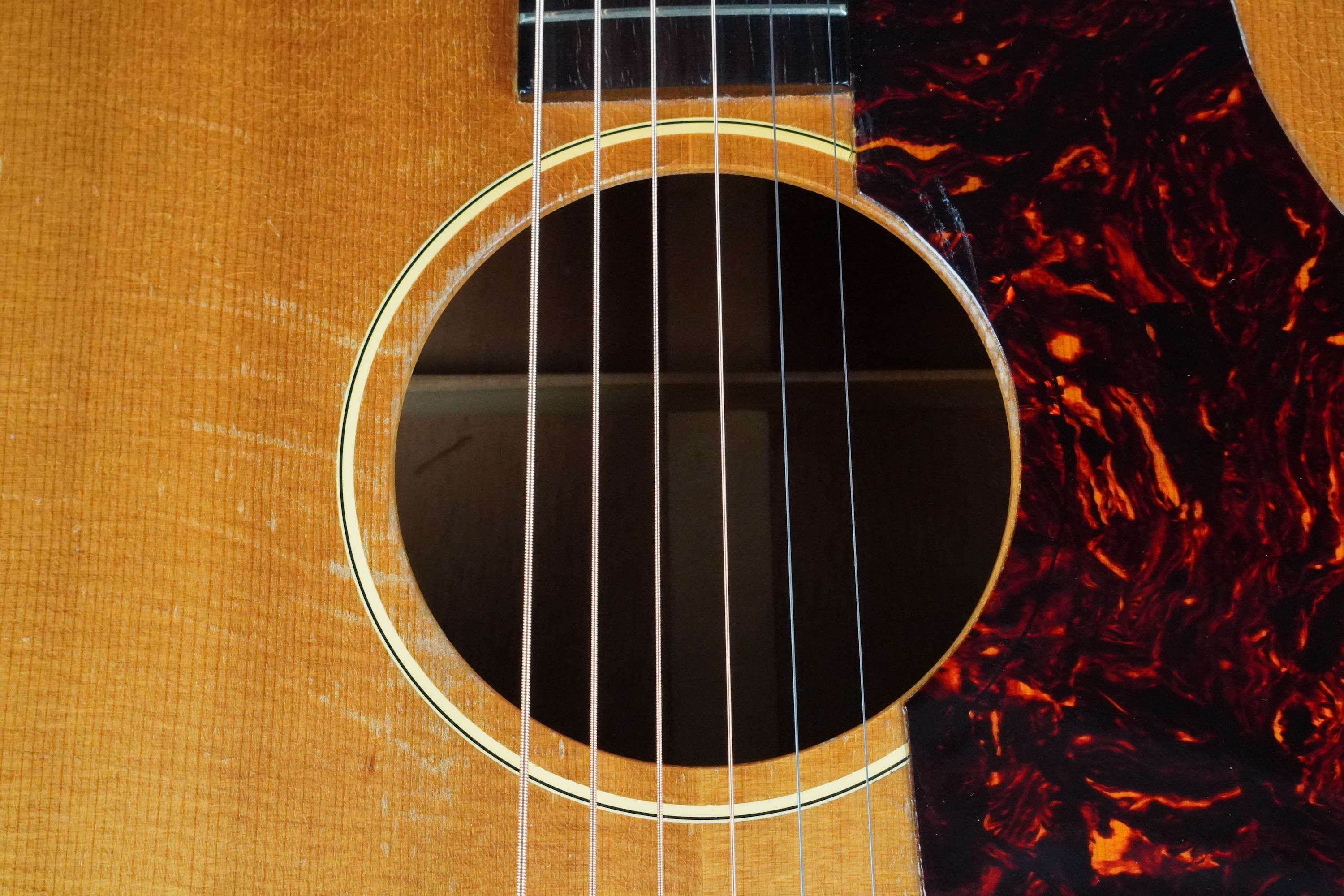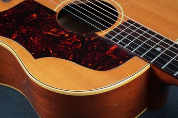 本機も製造年は1955年製ですが、ブレーシングはスキャロップでフレット数は19と変更以前のスペックですが、ピックガードはラージガードとなっており、しかもラージガードの最初期にではサウンドホールのリングが隠れるような、特異なルックスを持つ希少な個体で、このピックガードはなかなか出物が少ない為に認知度も低いのですが、この年式のSouthern Jumboなどでも極稀に見掛けるレアな仕様です。