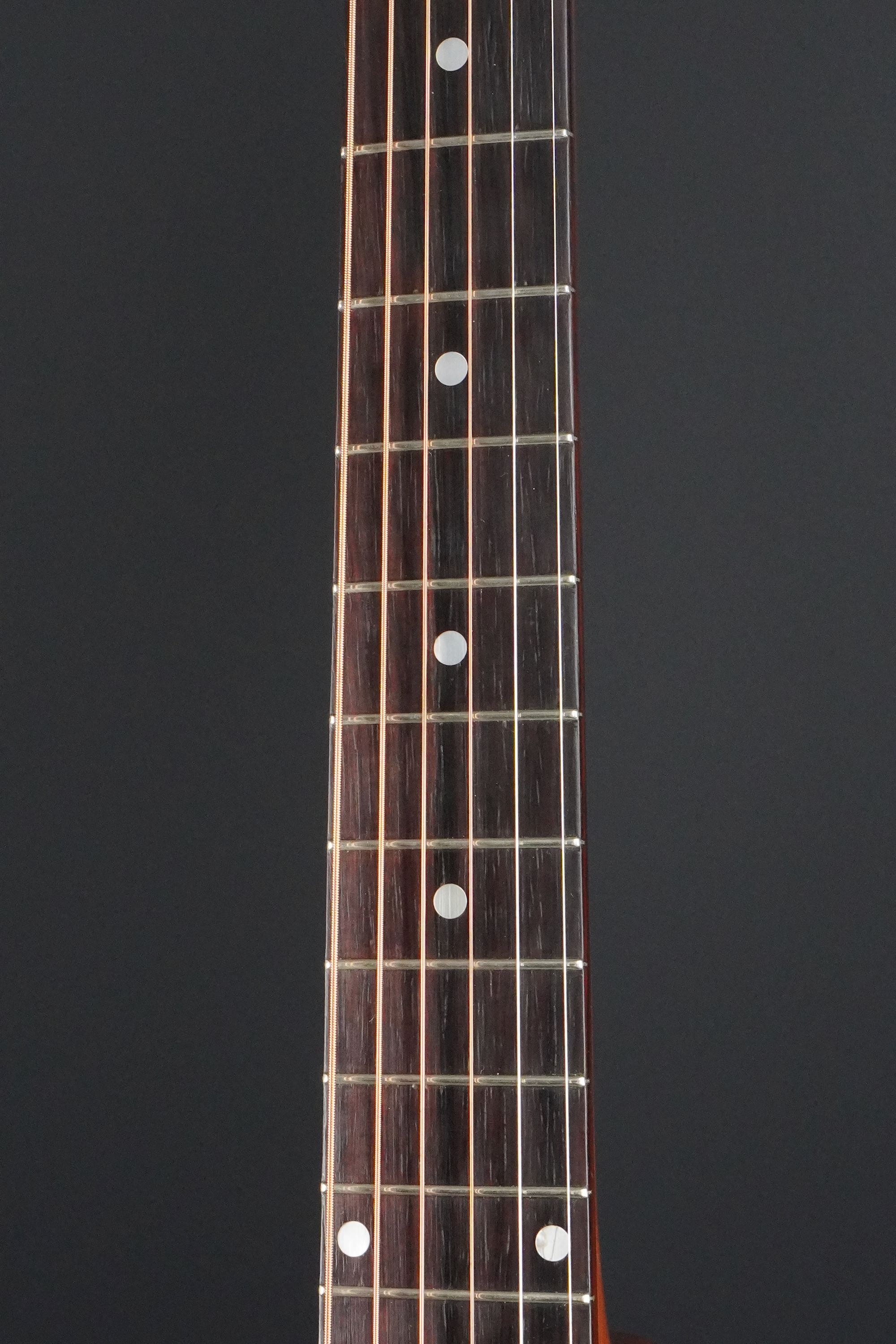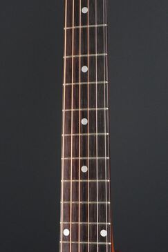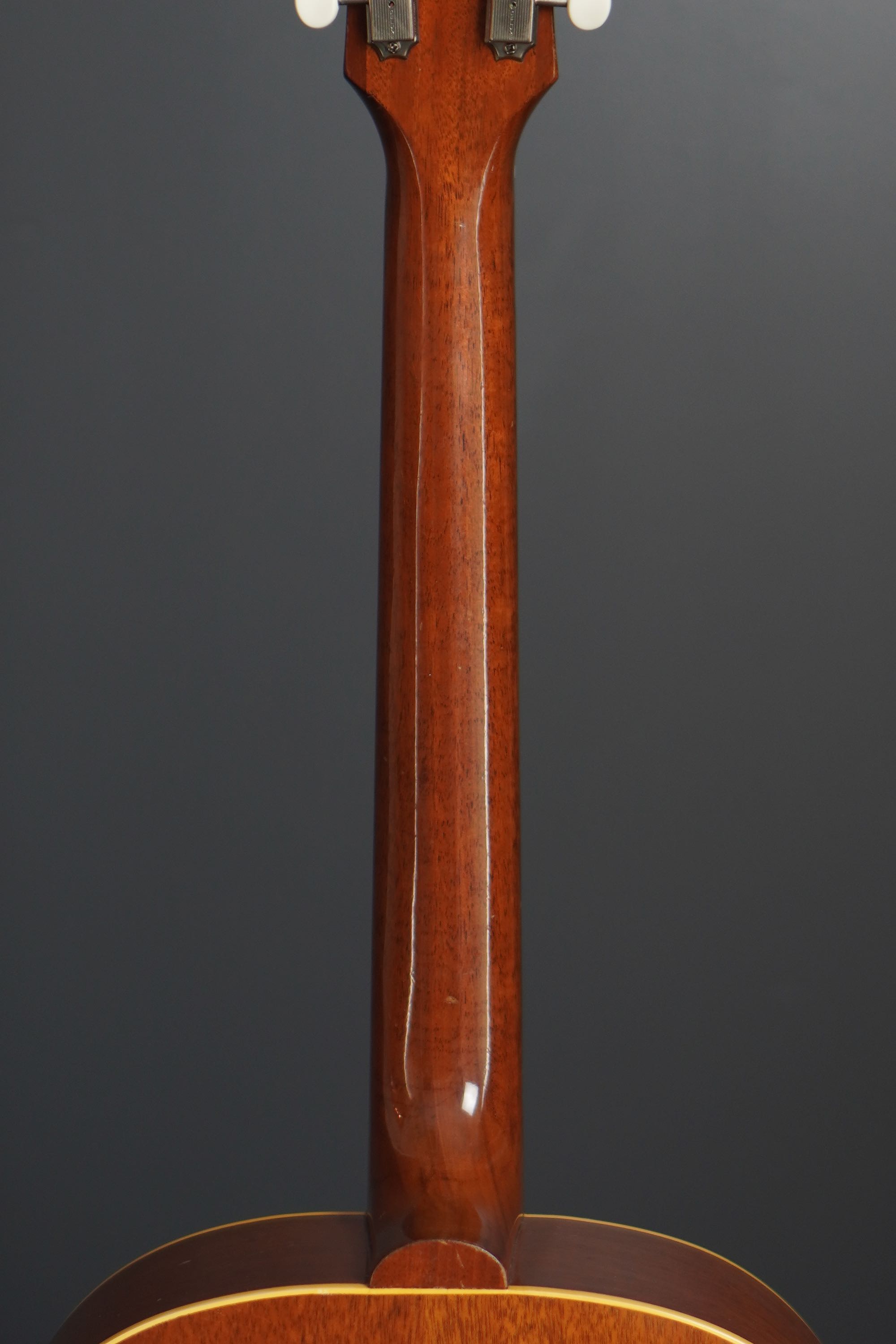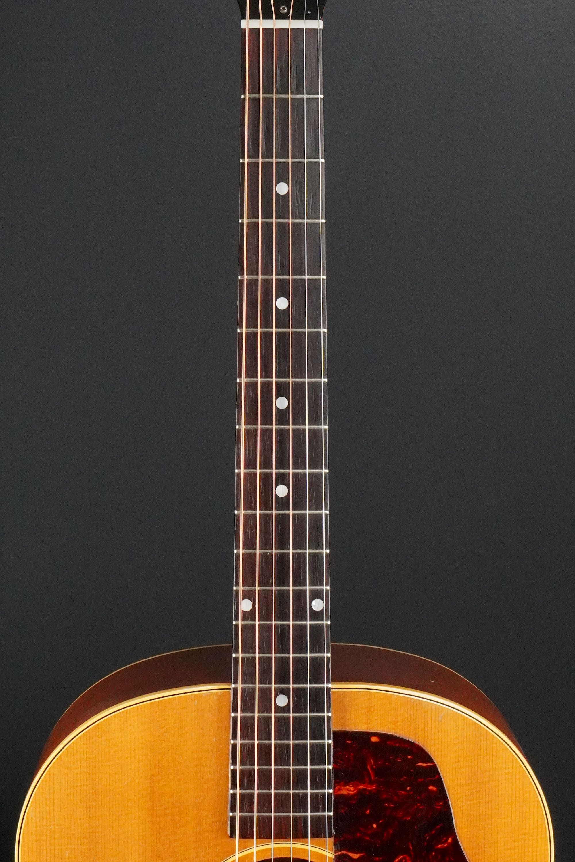 本機も製造年は1955年製ですが、ブレーシングはスキャロップでフレット数は19と変更以前のスペックですが、ピックガードはラージガードとなっており、しかもラージガードの最初期にではサウンドホールのリングが隠れるような、特異なルックスを持つ希少な個体で、このピックガードはなかなか出物が少ない為に認知度も低いのですが、この年式のSouthern Jumboなどでも極稀に見掛けるレアな仕様です。
