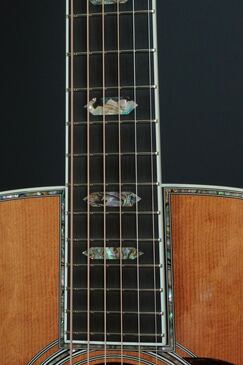 これだけの木目ですと、トップ材の主張が強くなってしまうのですが、そこは45スタイルですので、アヴァロンのパーフリングや鼈甲柄のピックアガードとのコントラストも鮮やかで、とてもゴージャスに雰囲気良く纏まっております。