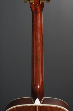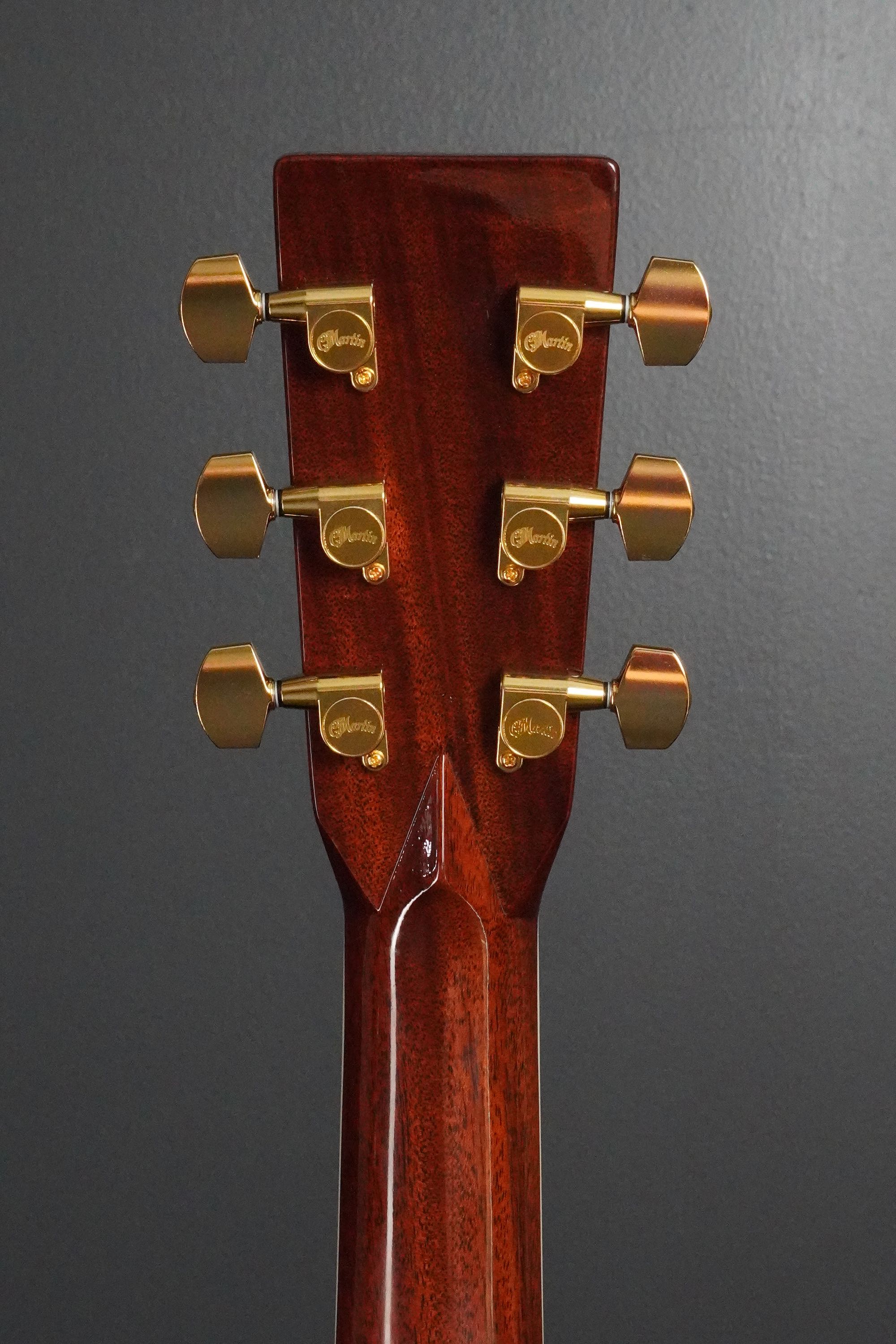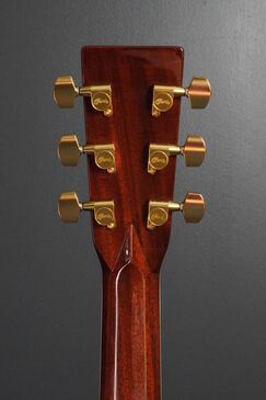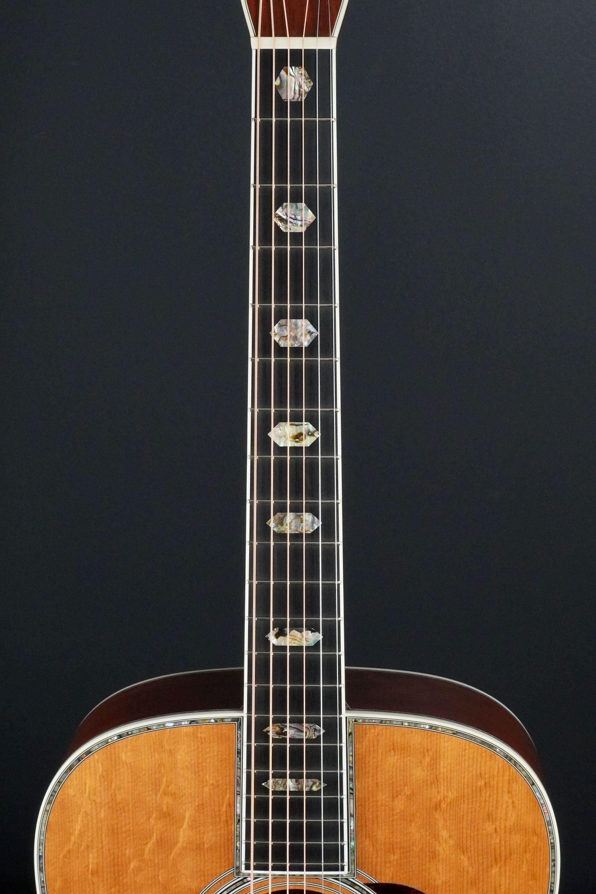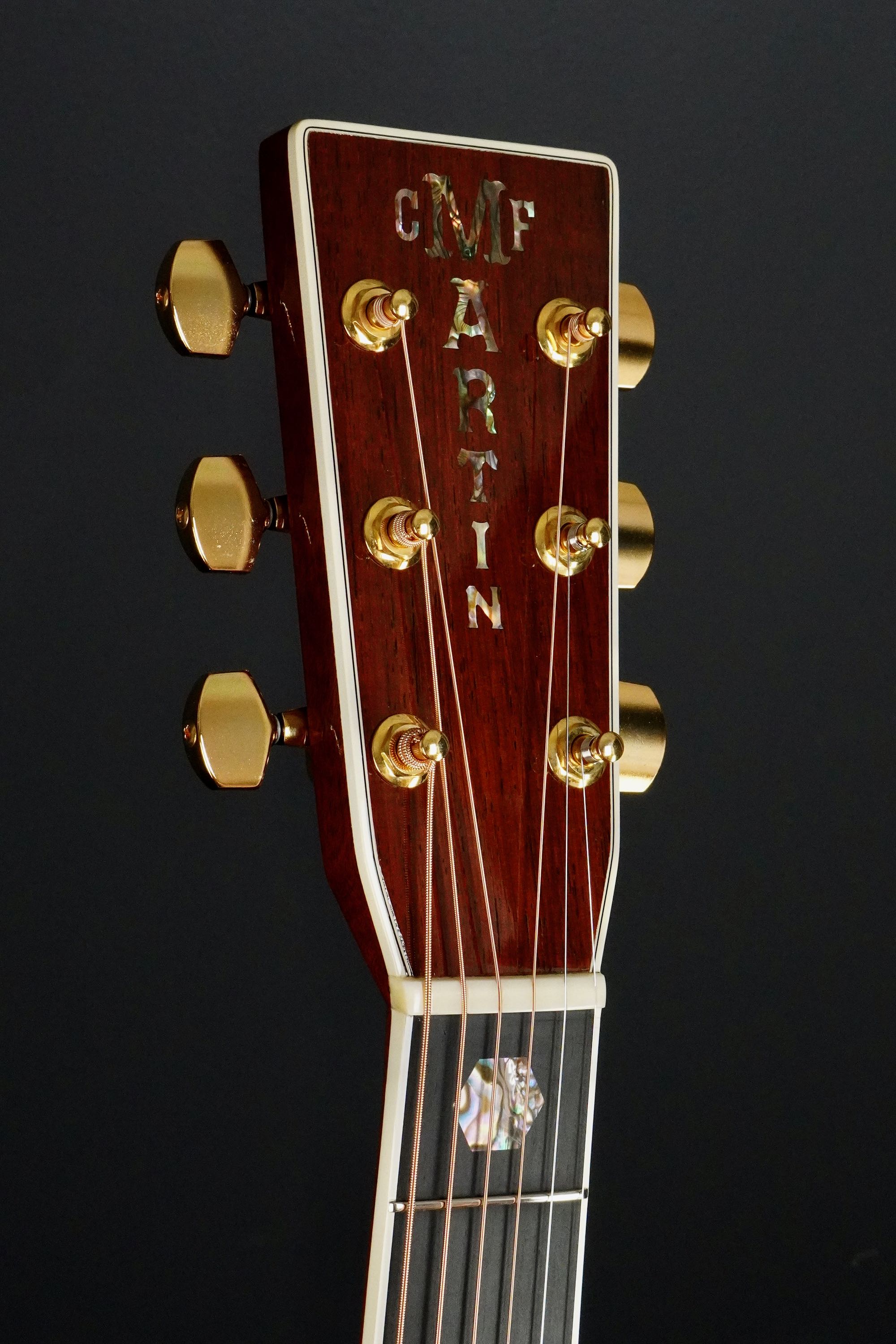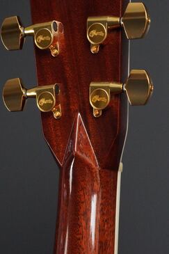 とても存在感のある、ややスクエアなヘッドは、色気のあるマダガスカルローズウッドのヘッドプレートに、アヴァロンのMARTIN縦ロゴ、チューナーはゴールドのロトマチックでマーチンオリジナルのタイプ、黒いエボニー指板には存在感の強いアヴァロンのヘキサゴンと、王道の45スタイルを持ったスペックです。