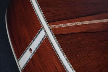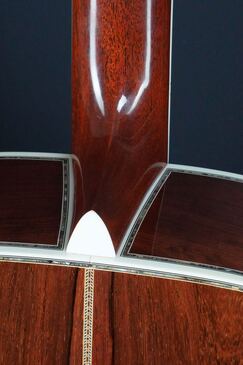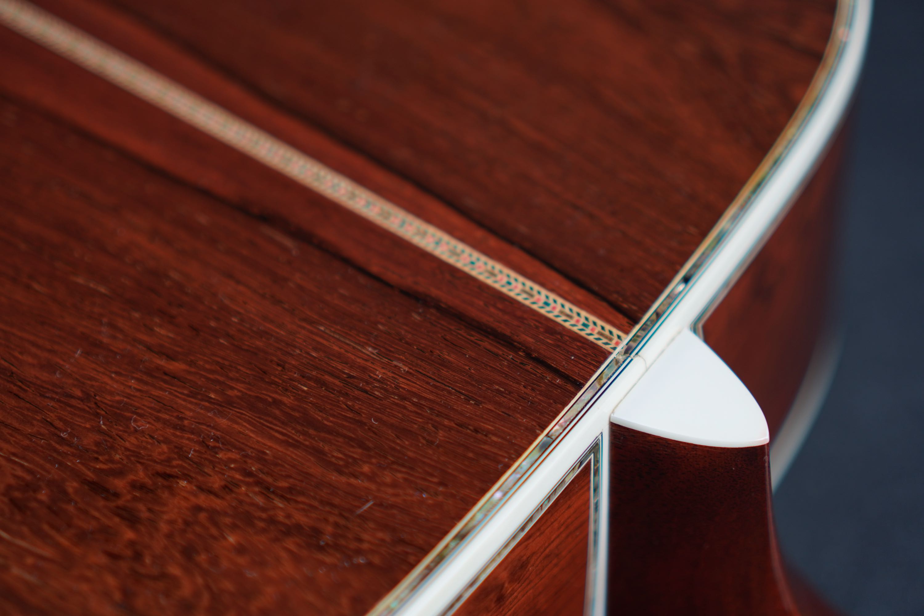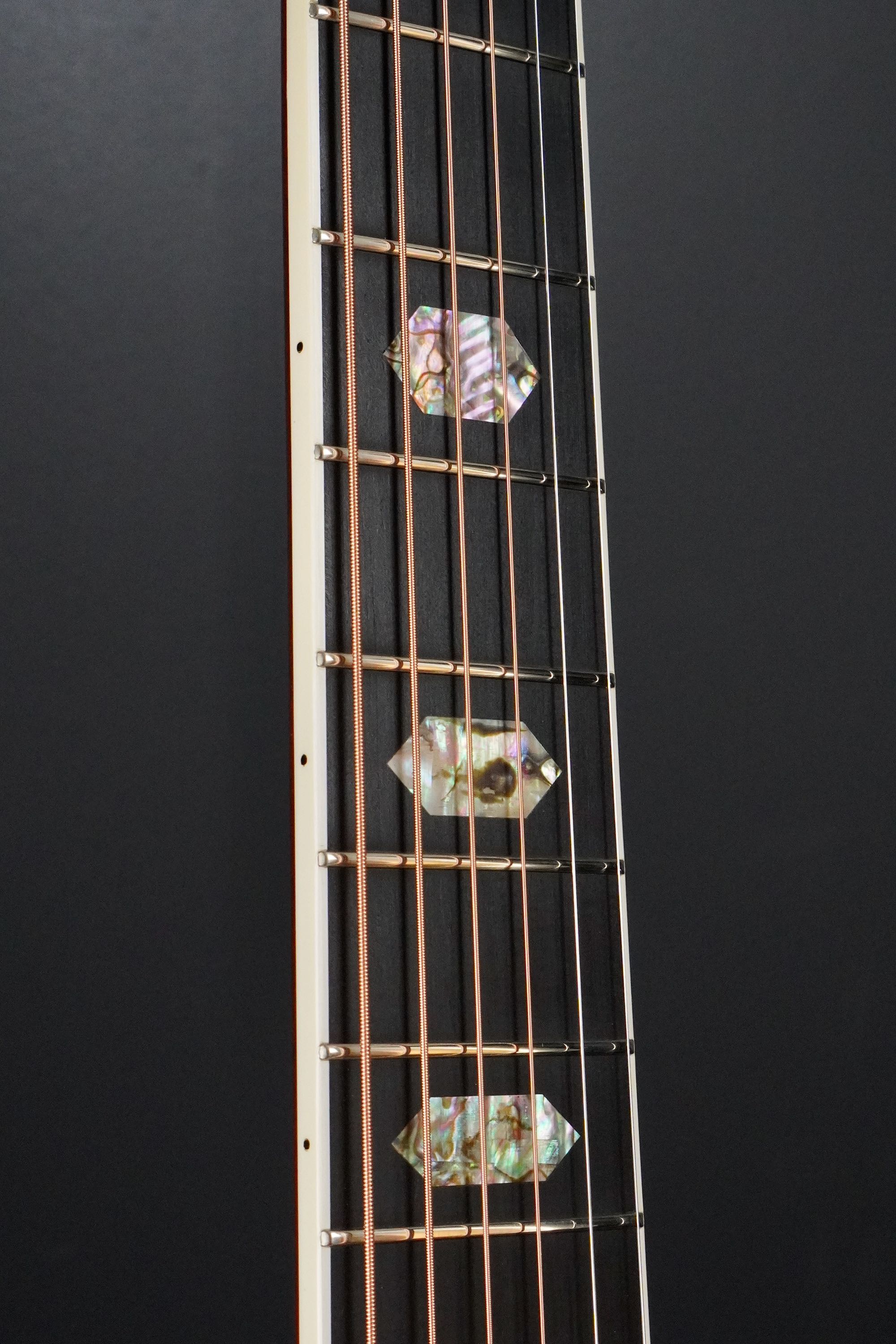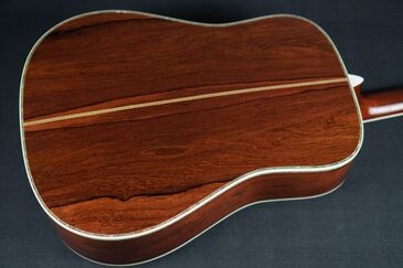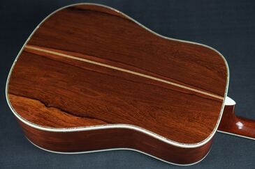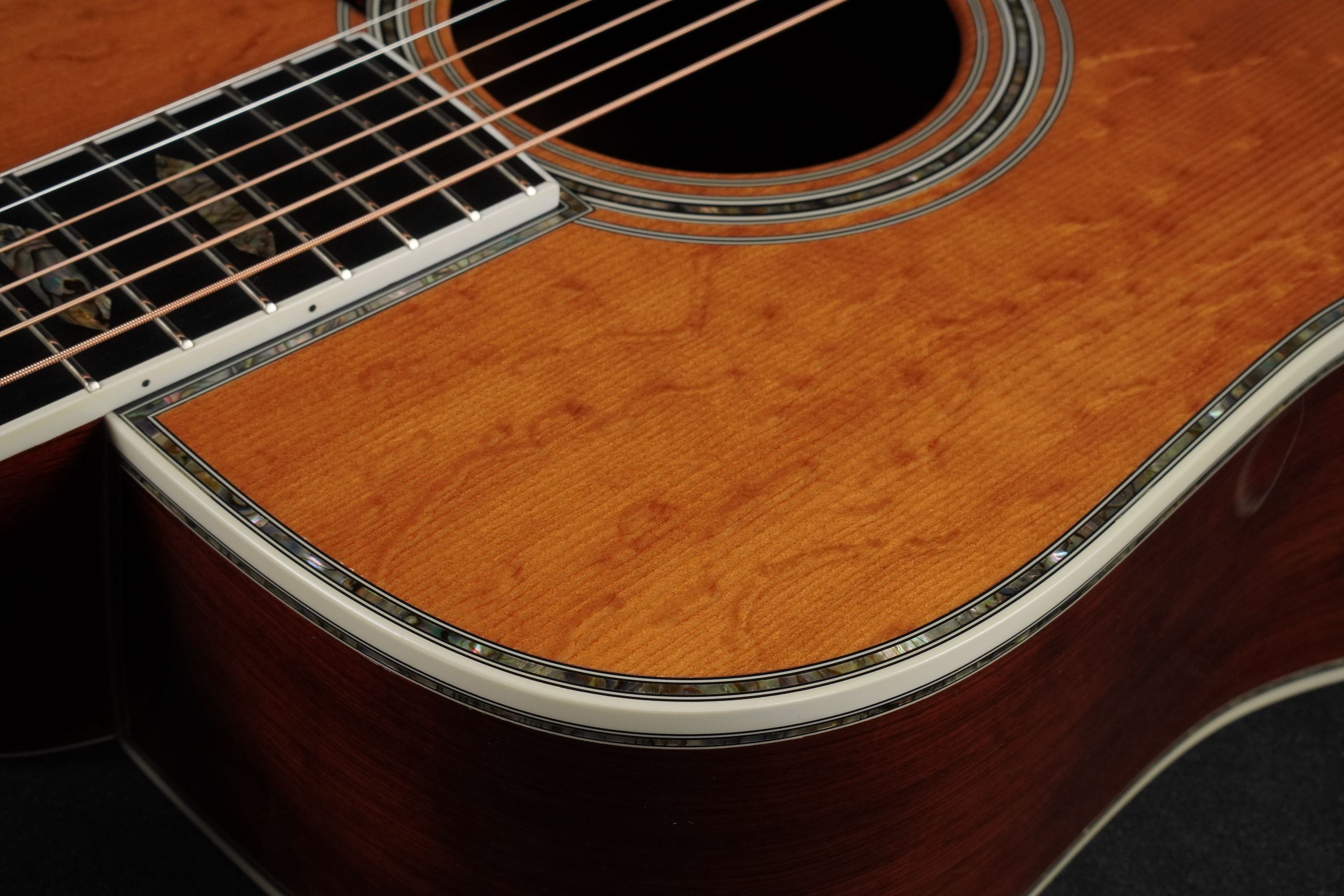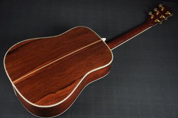 このようなゴージャスなルックスだけでなく、サウンドもまた素晴しいギターで、さすがはそれぞれがトーンウッドとしても評価の高い材でもありますので、ドレッドノートの重厚で豊かな響きを持ちつつ、包み込むような倍音が程良いリヴァーブ感となって、かなりゴージャスで深く豊かなサウンドとなっております。