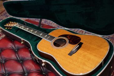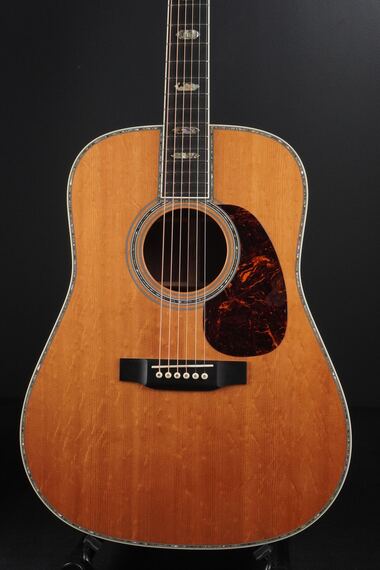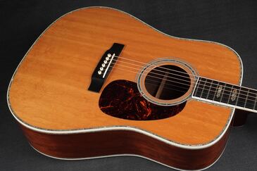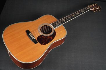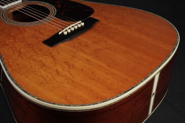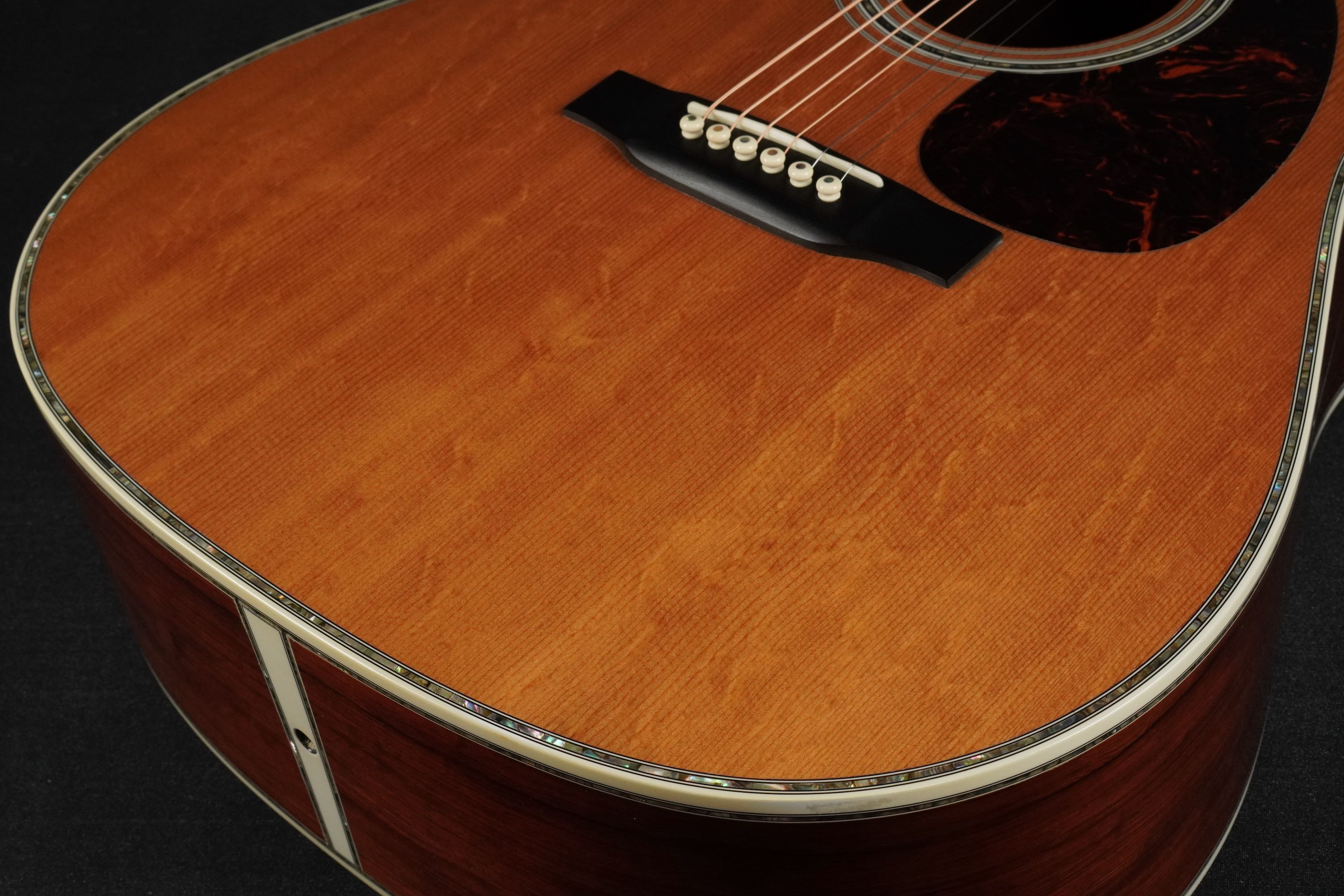 スキャロップブレーシング仕様で反応がよく、各弦の音がキリッと際立つ粒だちの良さ、それでいてドシっと存在の有る芯の強さ、倍音豊かで隙間の無いサウンドが素晴らしく、濃密で美しいトーンの素晴らしいD-45です!