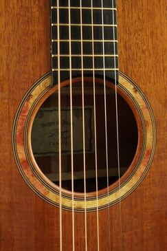 メイプルバールのウッドリングのロゼッタ、ローズウッドを使った赤い色のパーフリングなど、細部も木の美しさを引き出す演出が素晴らしいです。