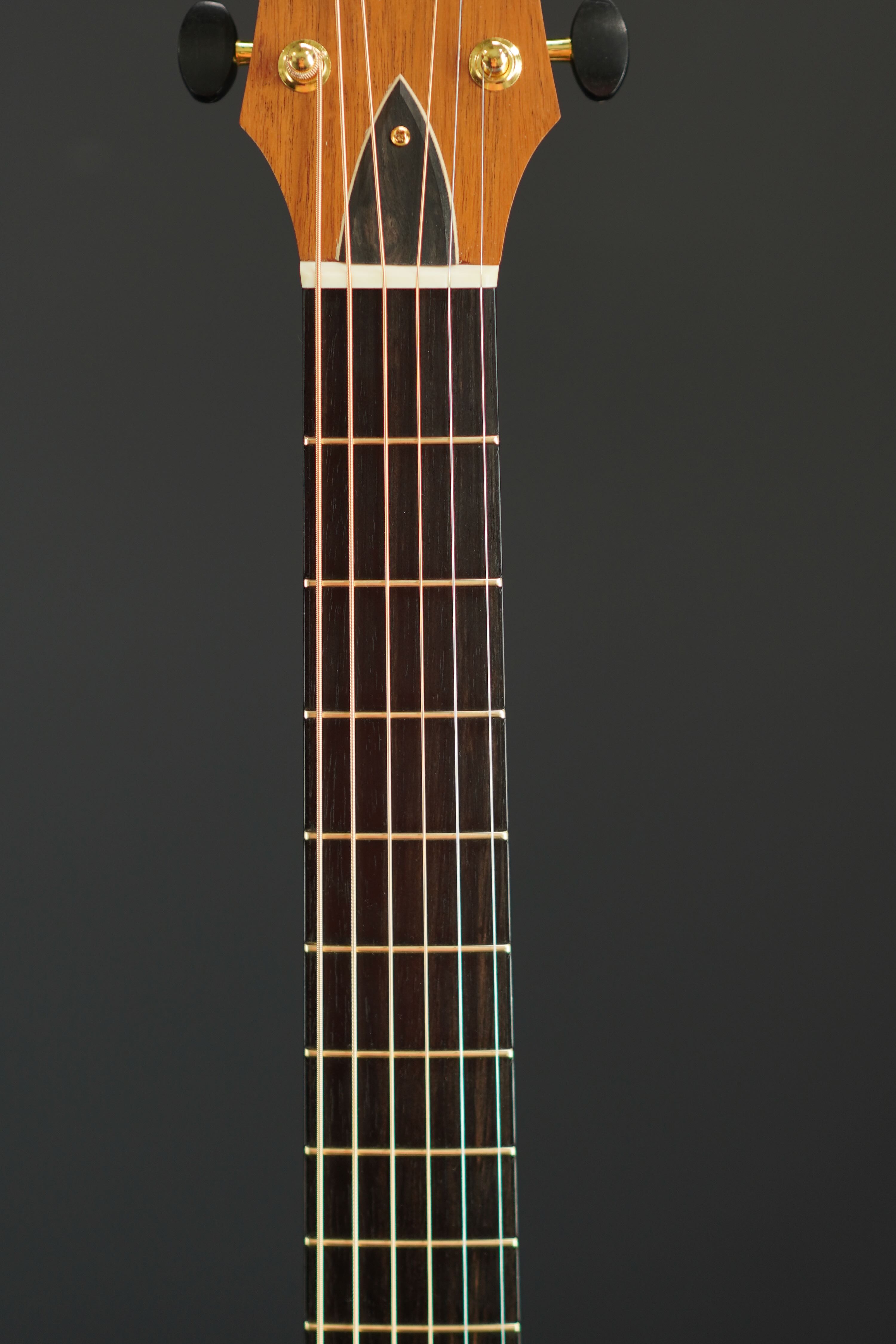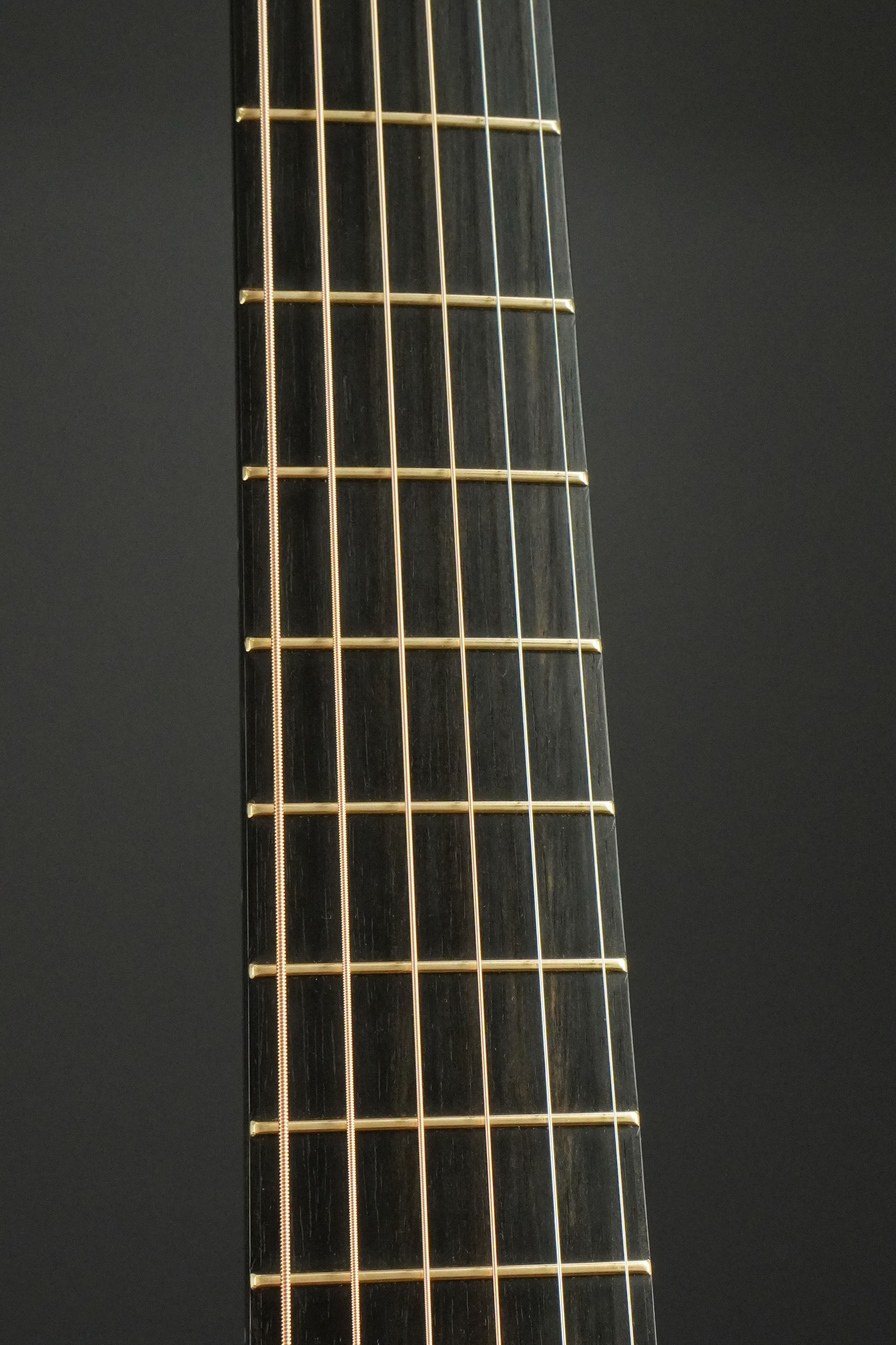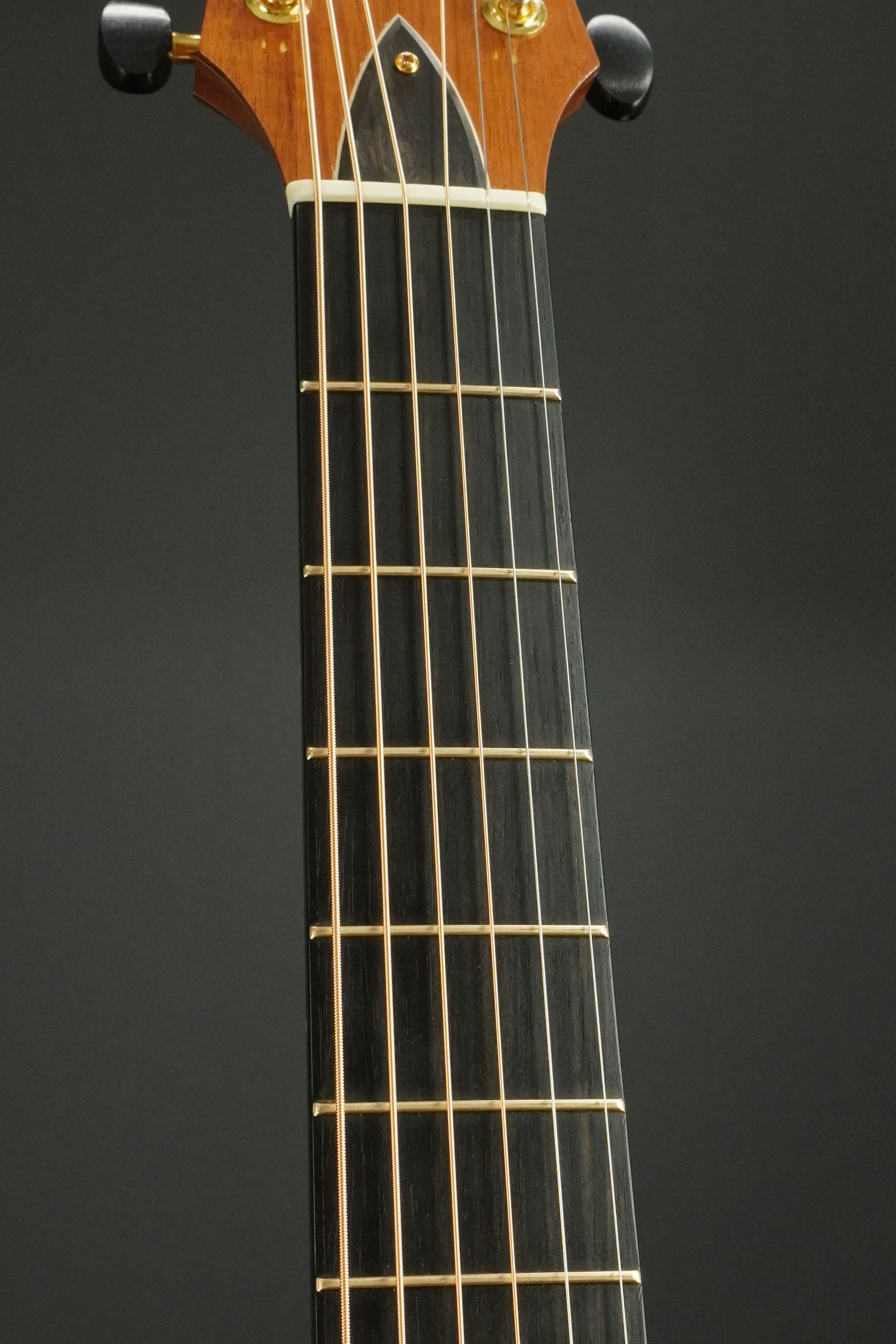 指板、ブリッジは、天然のあたたかい印象のエボニーが使われ、ゴールドのフレットが綺麗に並んでいます。