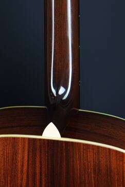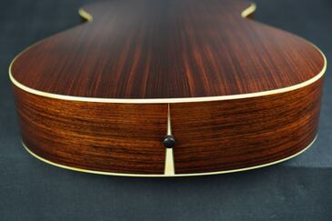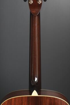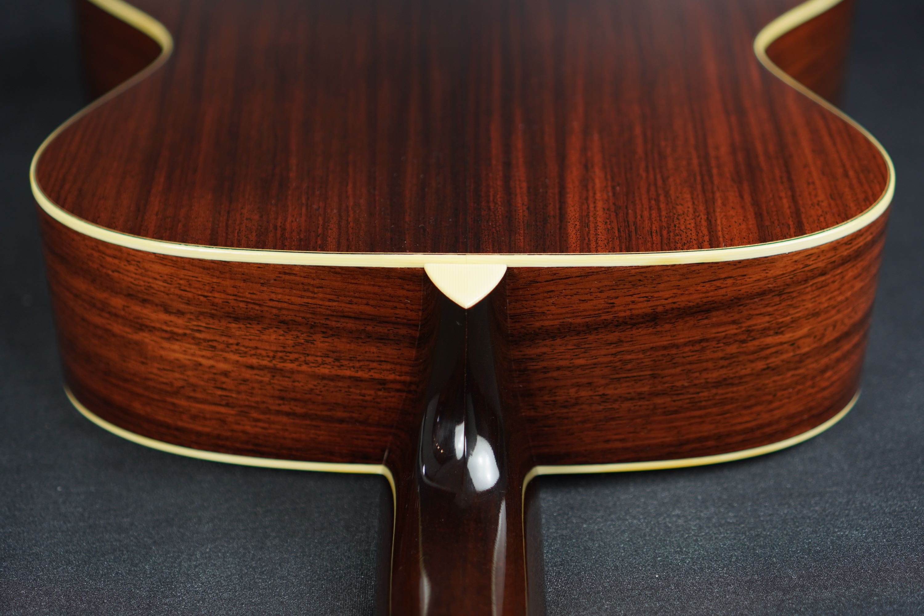 一般的によく使われる材ですが、柾目の穏やかに整った木目や、程良く赤黒い色味など、なかなか風味の良い材が用いられており、背面の装飾はシンプルなだけに、この木材の風味がルックスの一番のポイントになりますが、大柄なこのサイズでも見飽きない、良い風合いのローズウッドです。ボディのエンドピースはシャープな三角形に仕上げられており、細かい所ですが拘りが見られます。