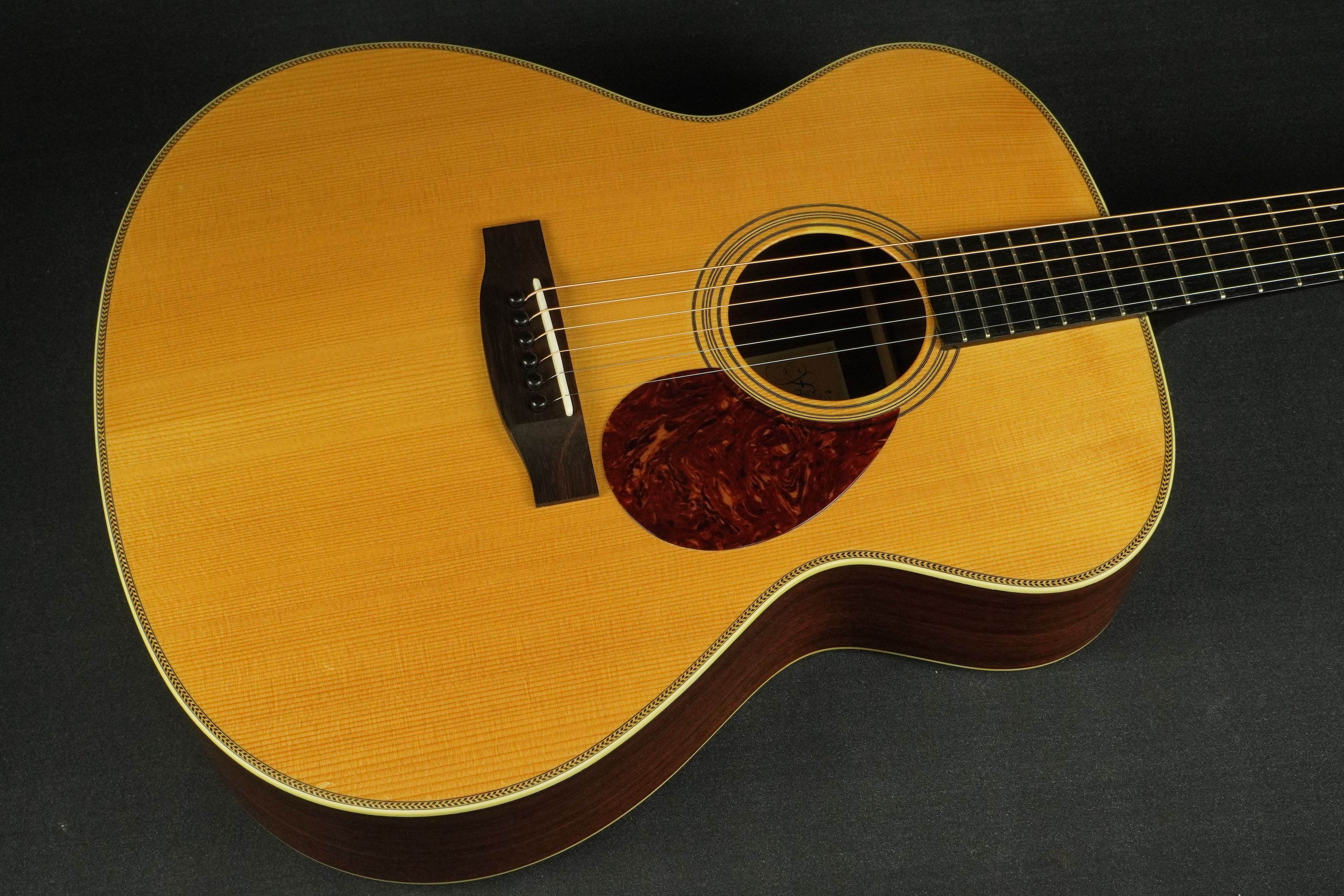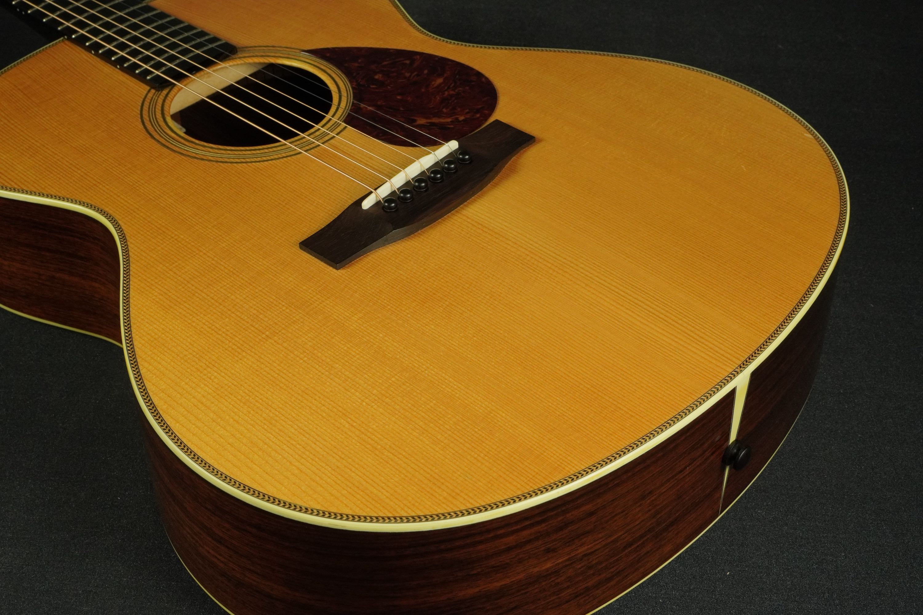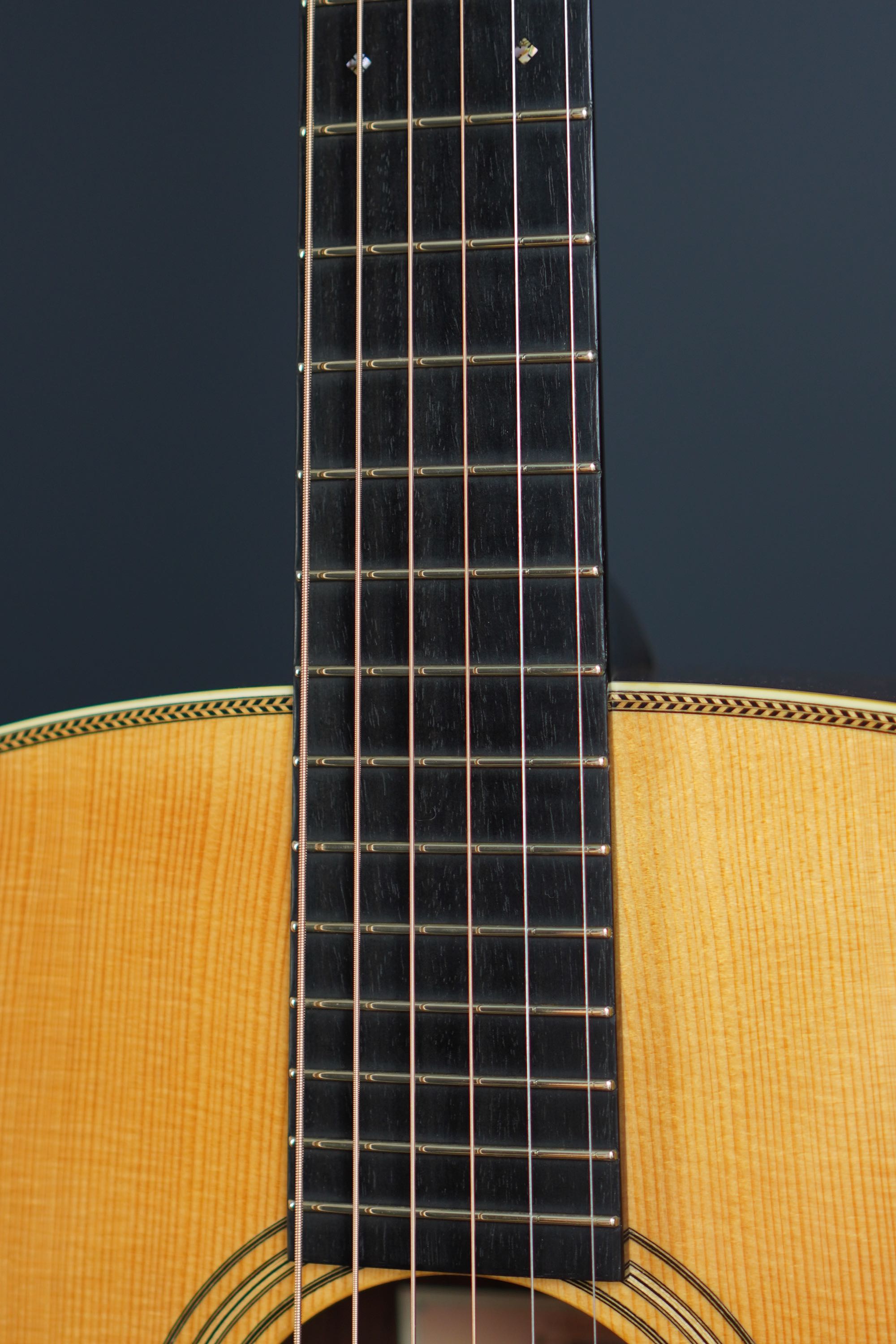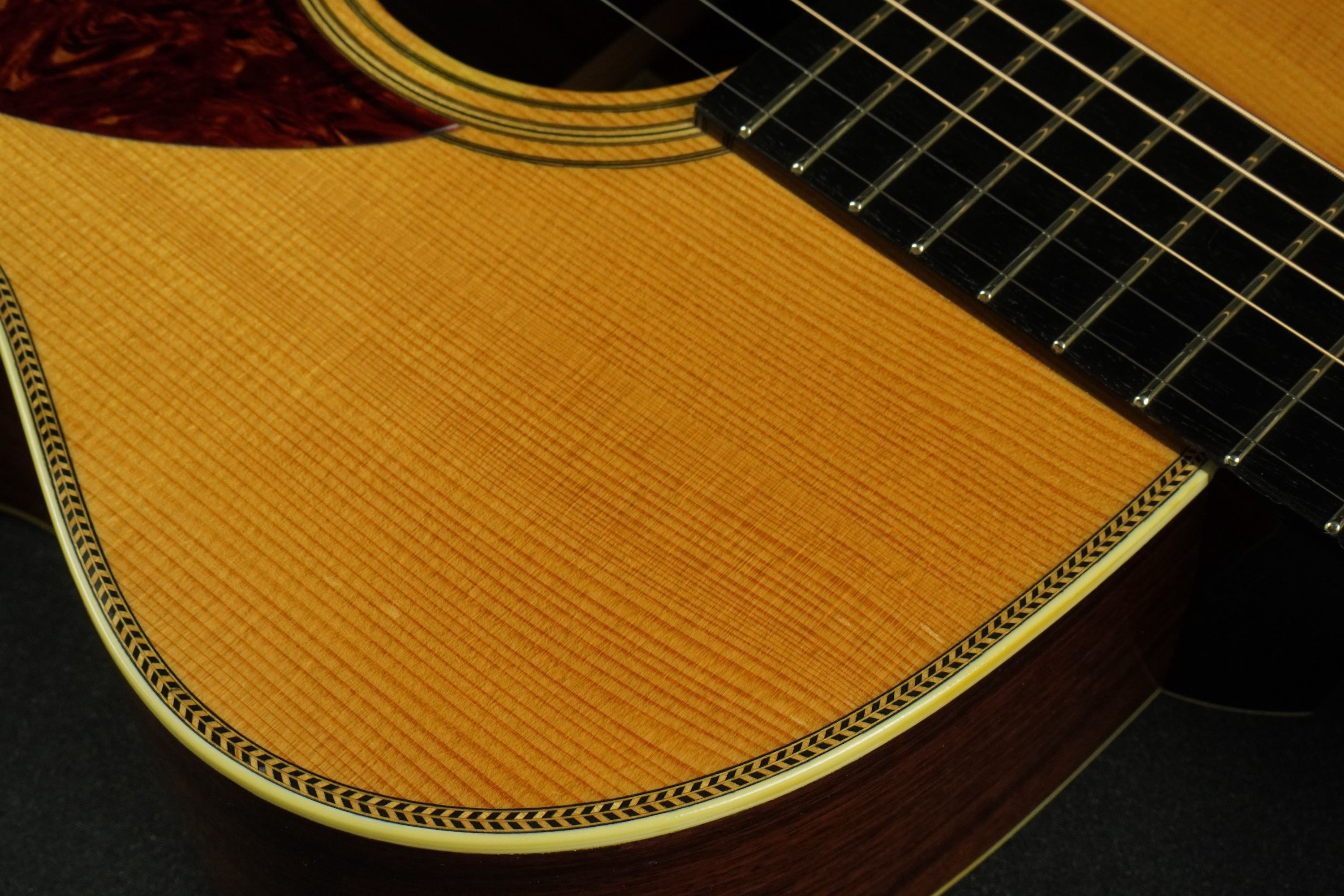 このドシっとしたようなジャンボスタイルの大柄なボディに、小柄なティアドロップ風のベッコウ柄ピックガード、ローズウッドのベリーブリッジもややゴツく大きめで、そこにアイヴォロイドのバインディングにヘリンボーントリムという、なんともアンバランスなような、それでいて目が離せない、なんともファニーな風貌が独特です。
