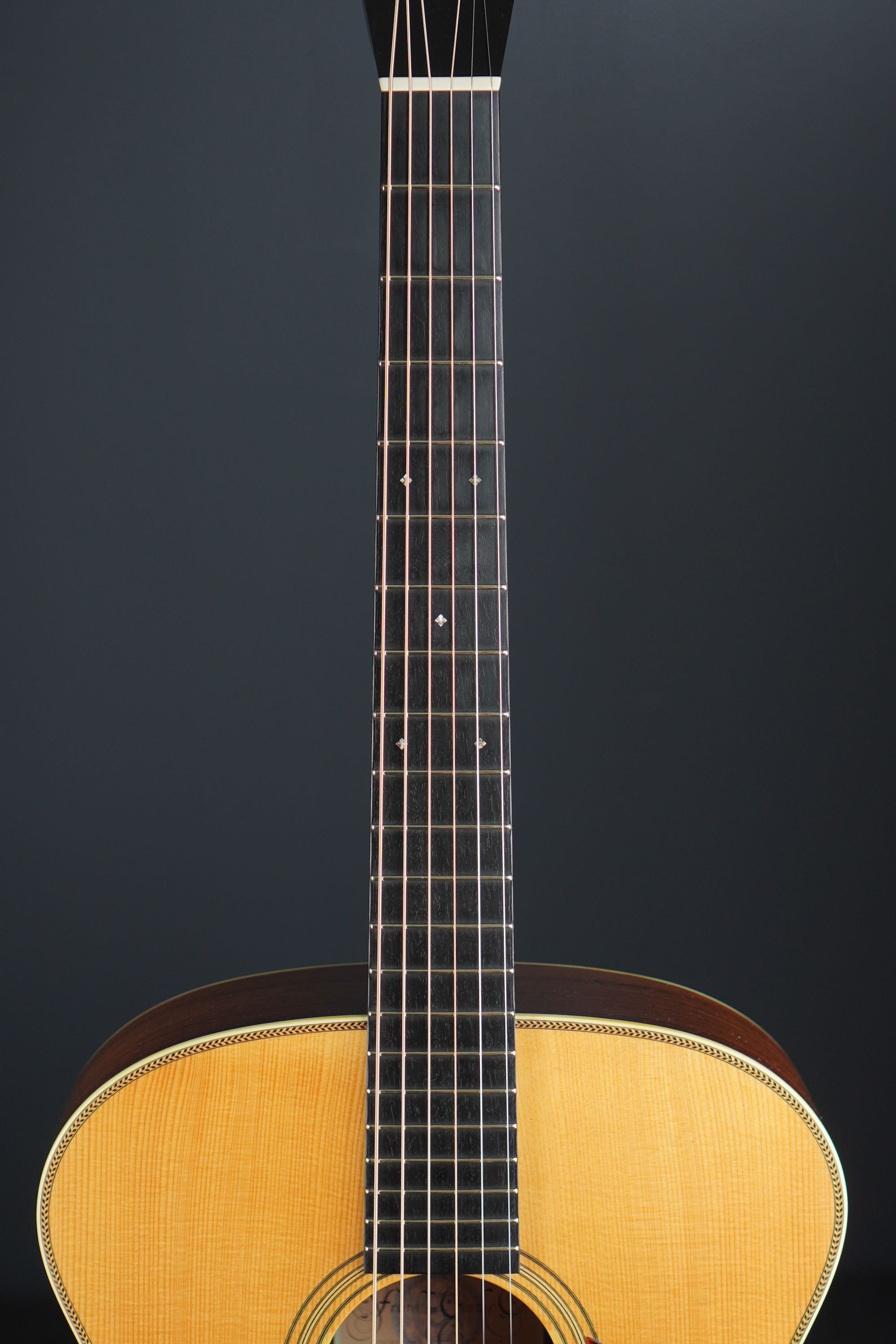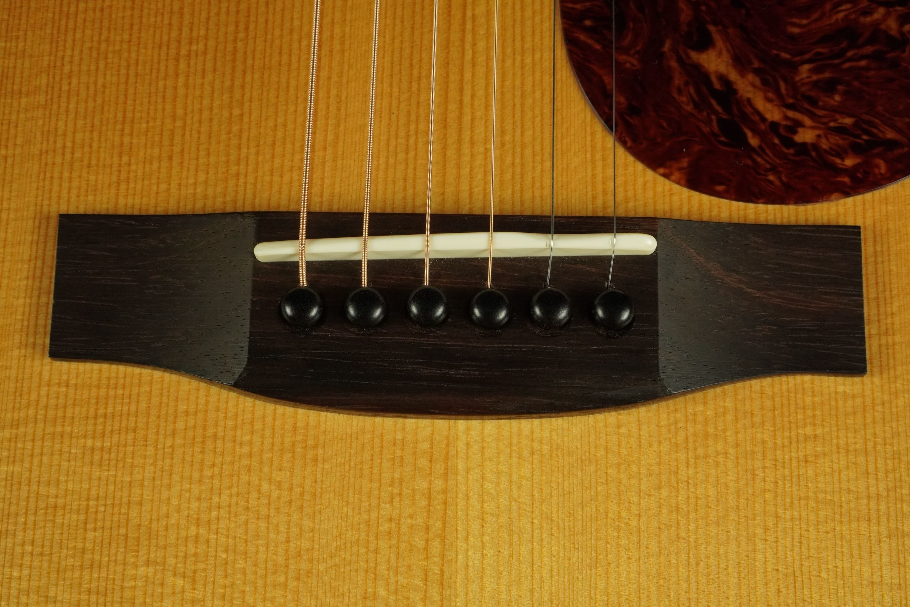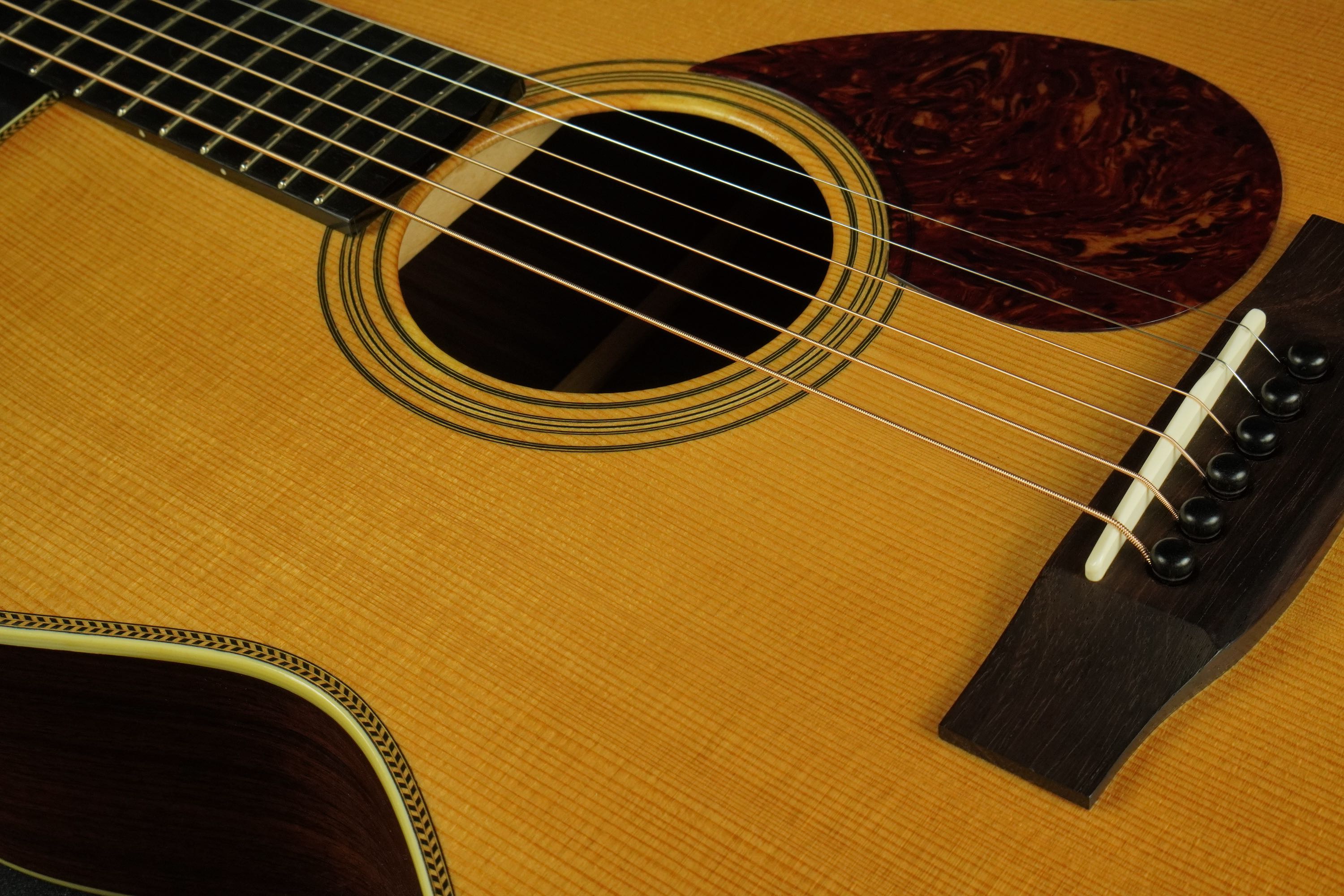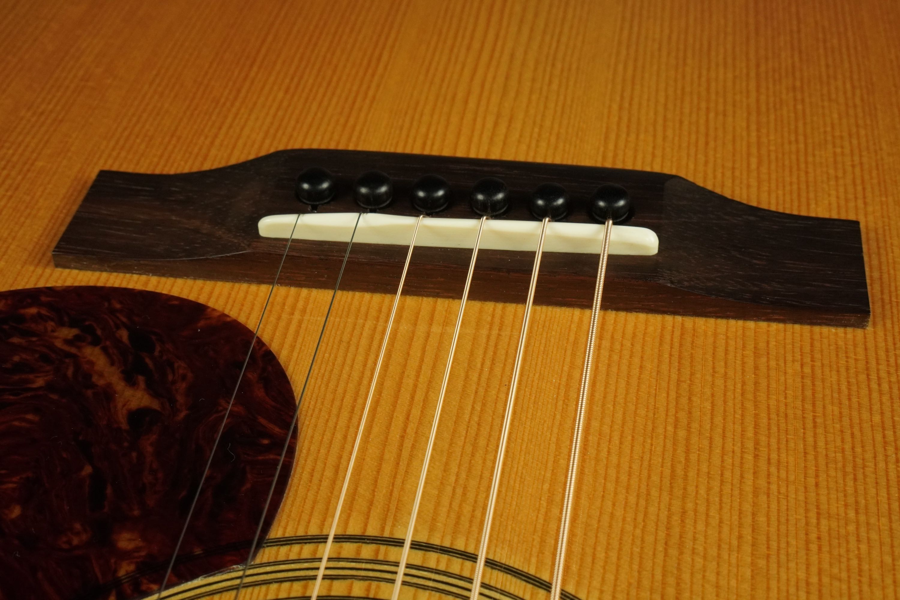 このドシっとしたようなジャンボスタイルの大柄なボディに、小柄なティアドロップ風のベッコウ柄ピックガード、ローズウッドのベリーブリッジもややゴツく大きめで、そこにアイヴォロイドのバインディングにヘリンボーントリムという、なんともアンバランスなような、それでいて目が離せない、なんともファニーな風貌が独特です。