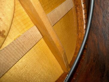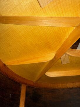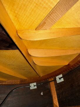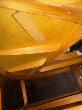 トップの裏に、駒をあてて補強され、リペアされています。6限側の木目の延長線上と、ブックマッチの対面側も、クラック予防の補強の駒が追加されています。
