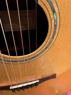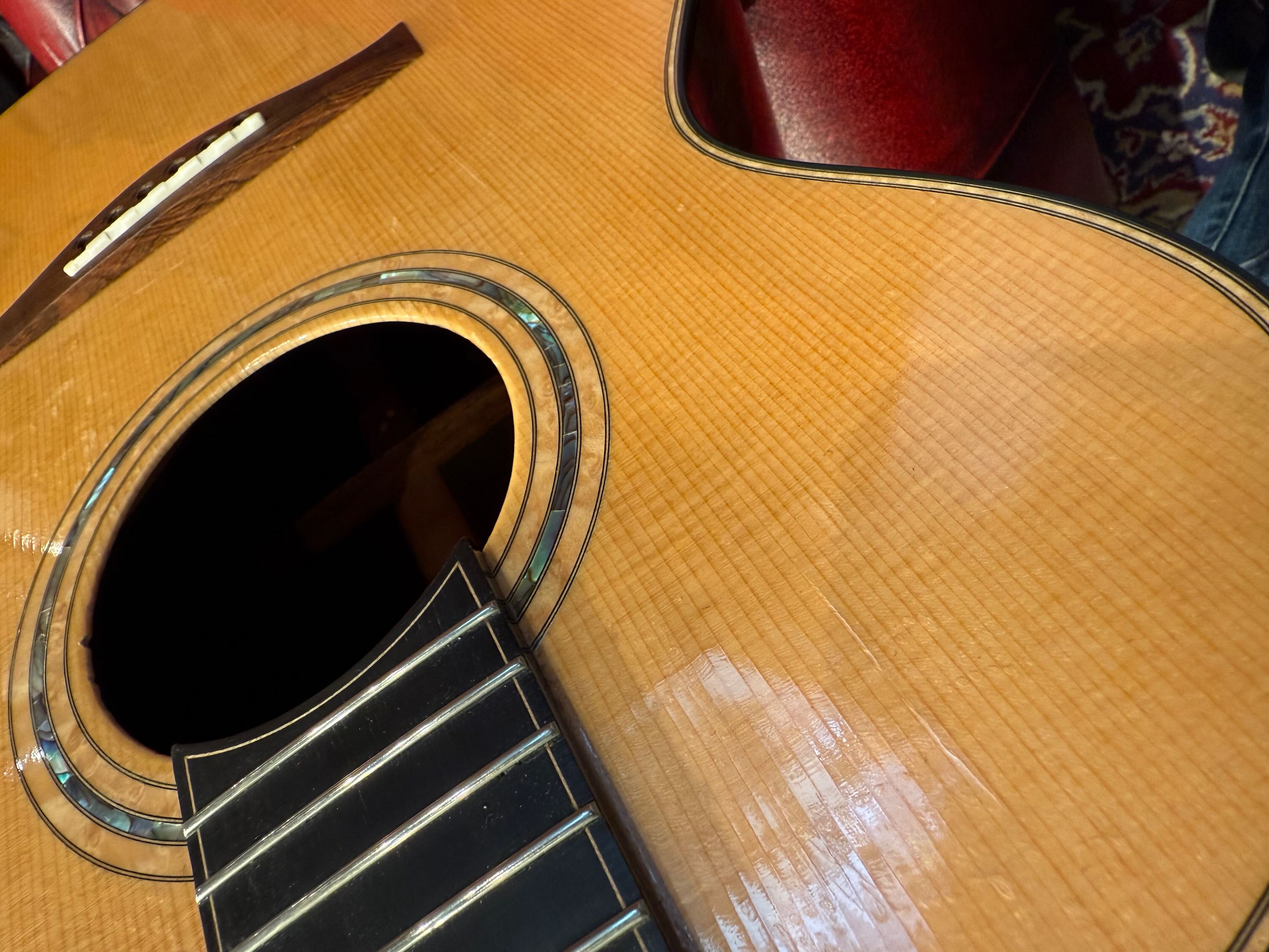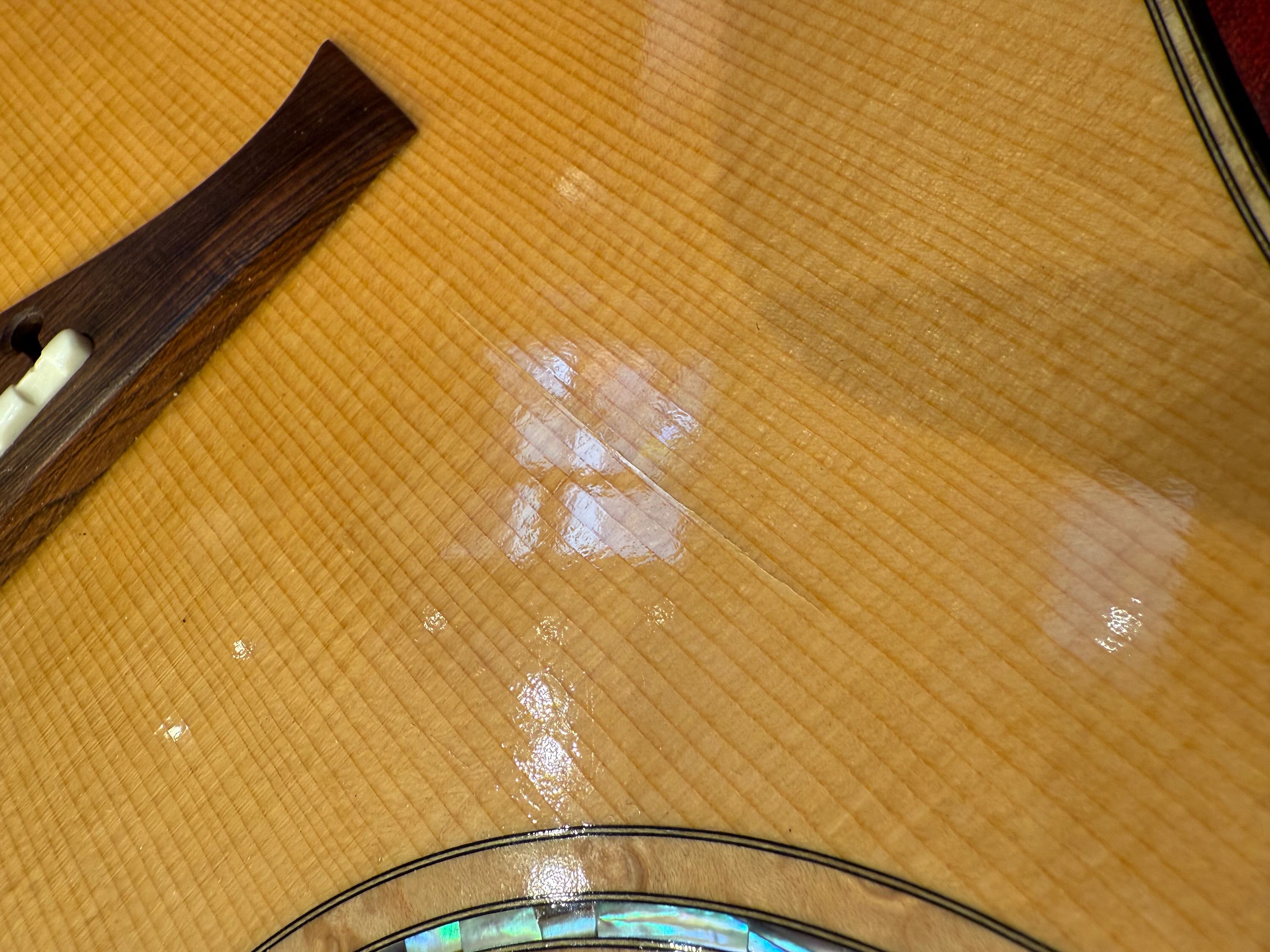 トップの6弦側サウンドホール傍から、ブリッジの木目に沿って、ラインクラックの補修があります。