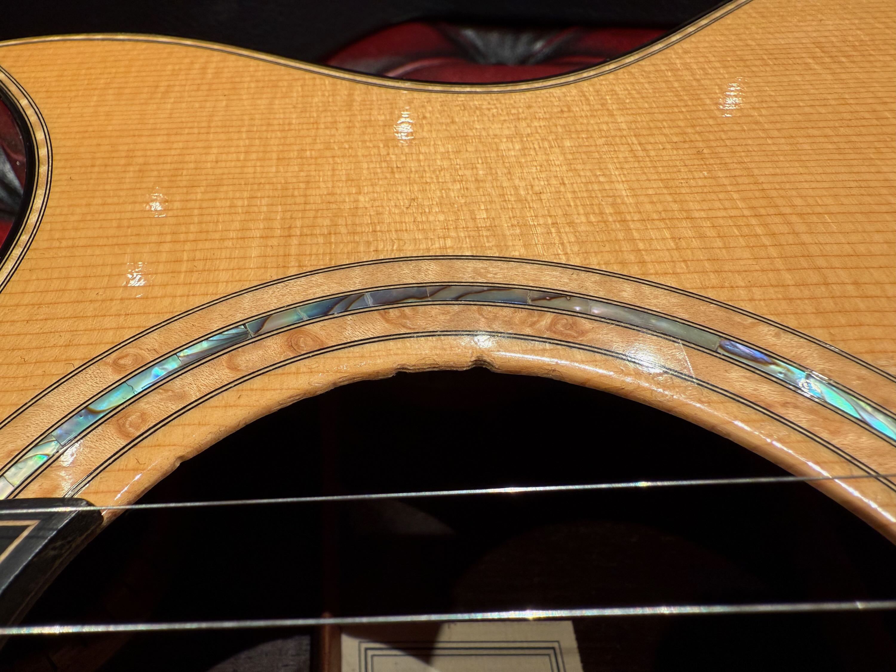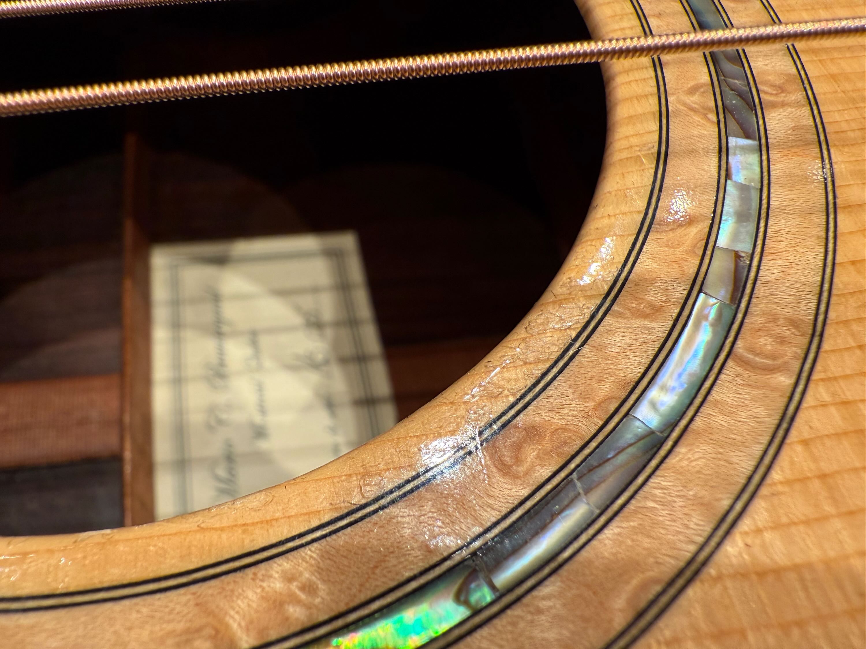 エボニーのボディバインディングにフィギャードメイプルのウッドトリム、ロゼッタはフィギャードメイプルとアバロンを組み合わせたパーフリングで、派手ではないのですが、細部までよく見ると凝った作りの、ウッディーでエレガントなデザインです。