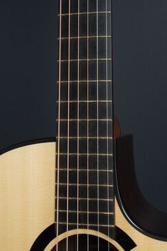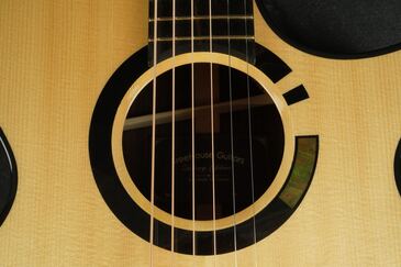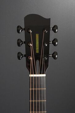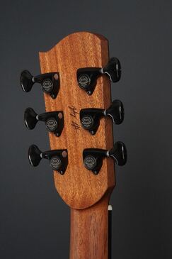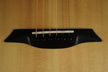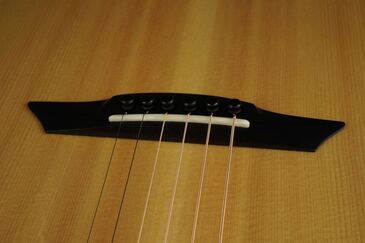 ブリッジはエボニーと間違えるほどの質感の、ロックライトというシンセティックな材料で作られています。エボニーよりも軽量で、トップのブリッジエリアをより振動させるのに有効な素材が使われています。ボディバインディングにもこのロックライトが使われており、シックで、落ち着いた上品なルックスに仕上がっています。