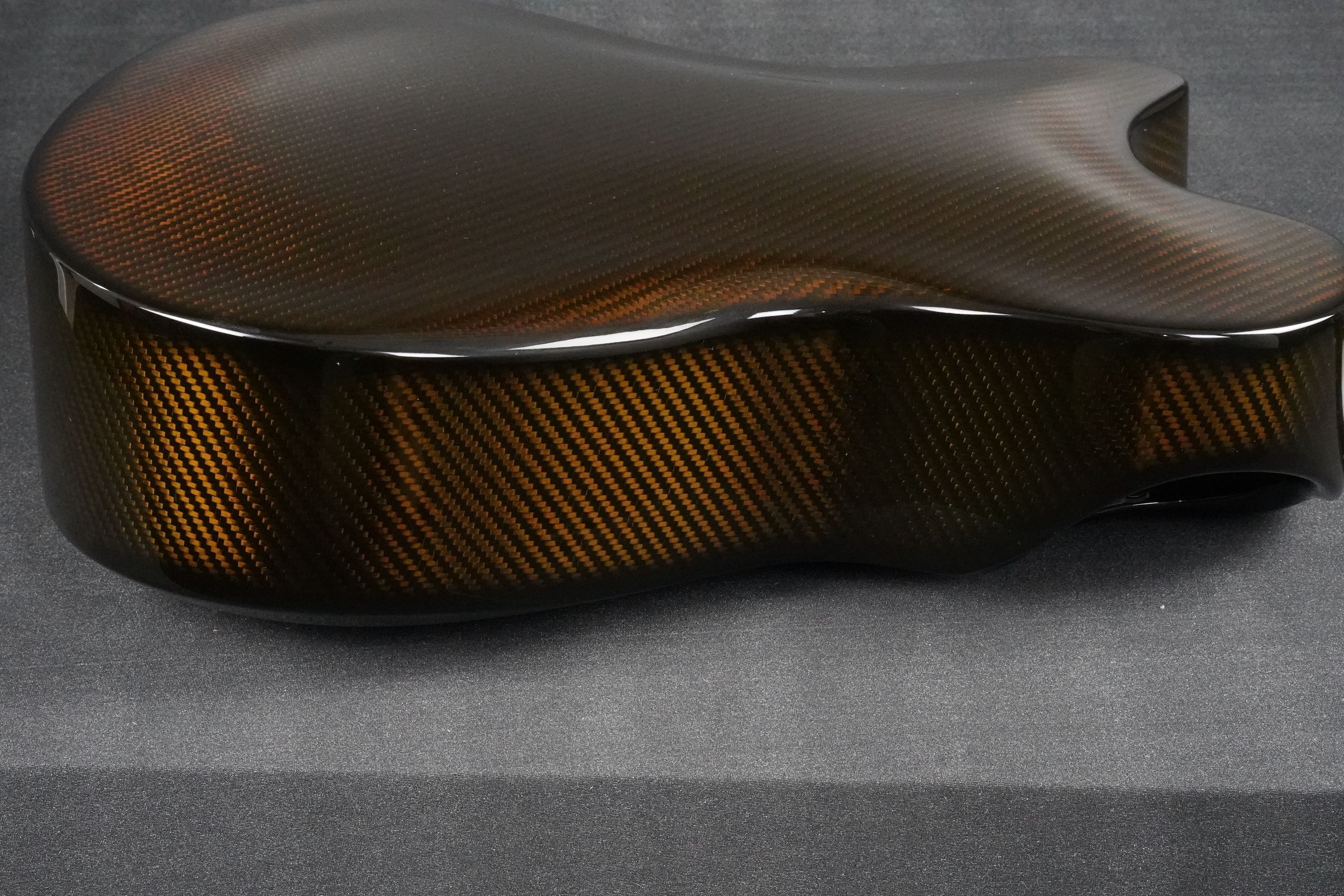 サイド&バックもカーボンのオールカーボンボディで、GreenやRedカラーもありますが、今回はトップ材のカラーにマッチするAmberカラーに仕上げています。